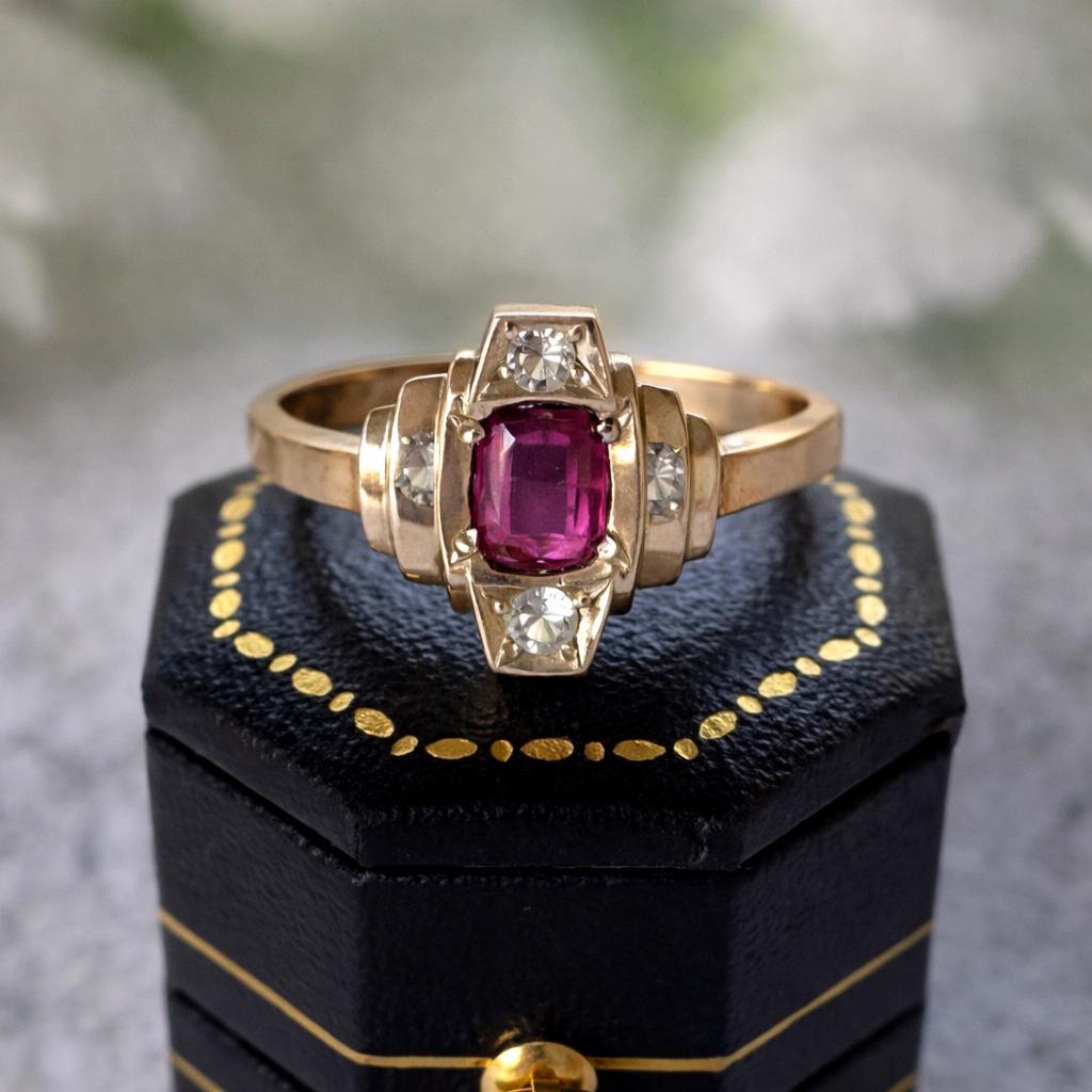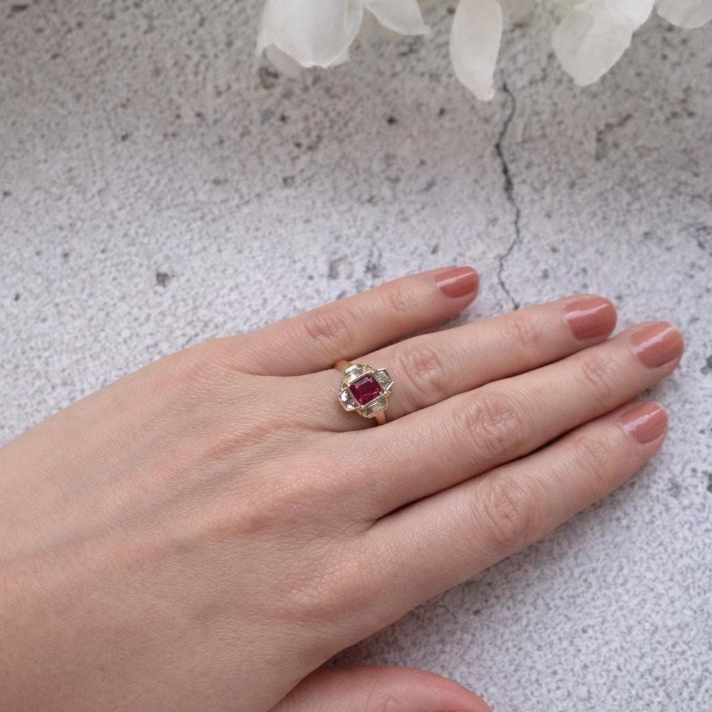 This very pretty and feminine antique 9ct gold Art Deco ring is set with a striking rectangular baguette-cut paste ruby gemstone in a vibrant raspberry red. The high-quality glass stone is accented top and bottom in two sparkling natural white zircons, each set in traditional bright-cut star settings. Zircon is a naturally earth-mined gemstone historically favoured in antique jewellery for its exceptional brilliance and fire, often used as a diamond substitute before the advent of modern simulants.
