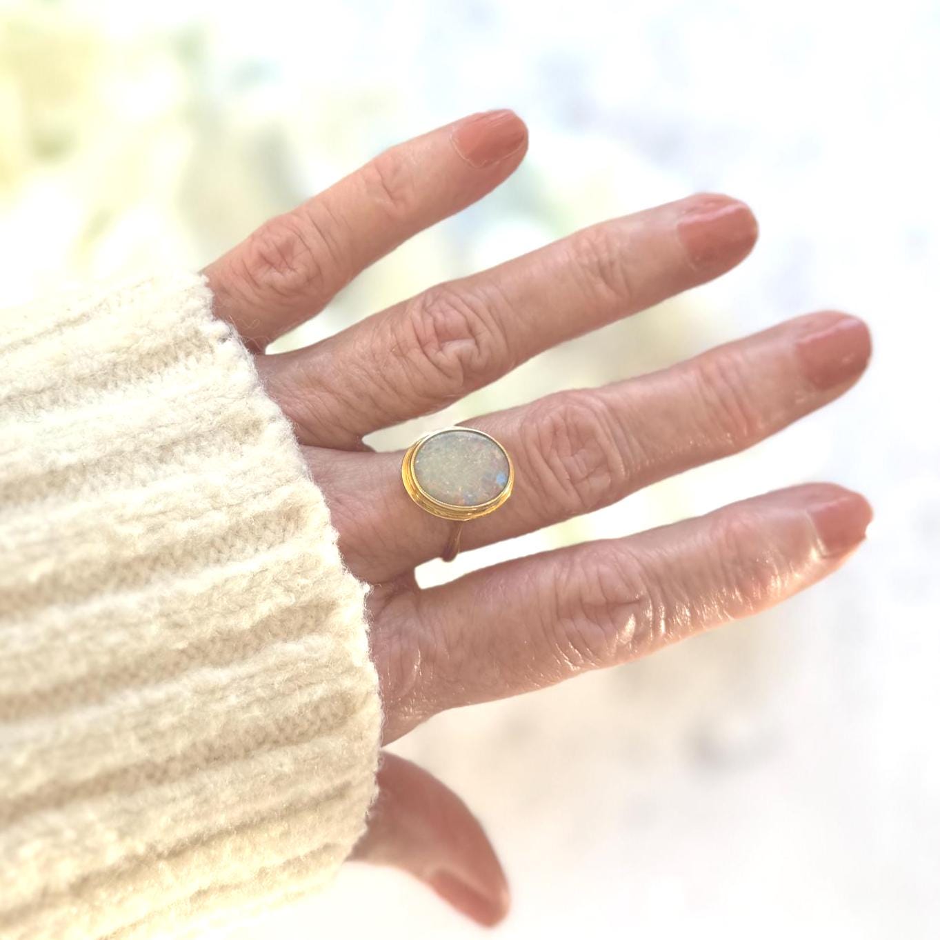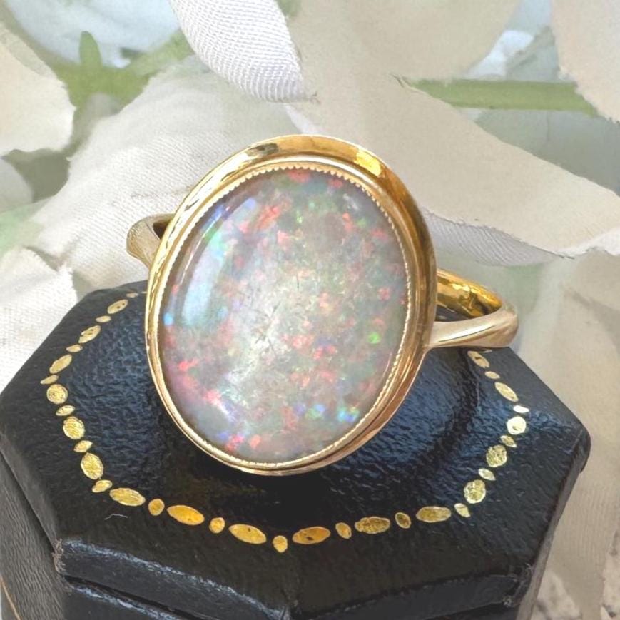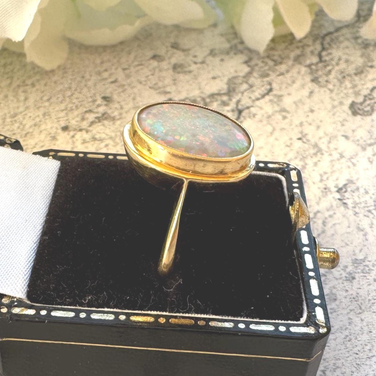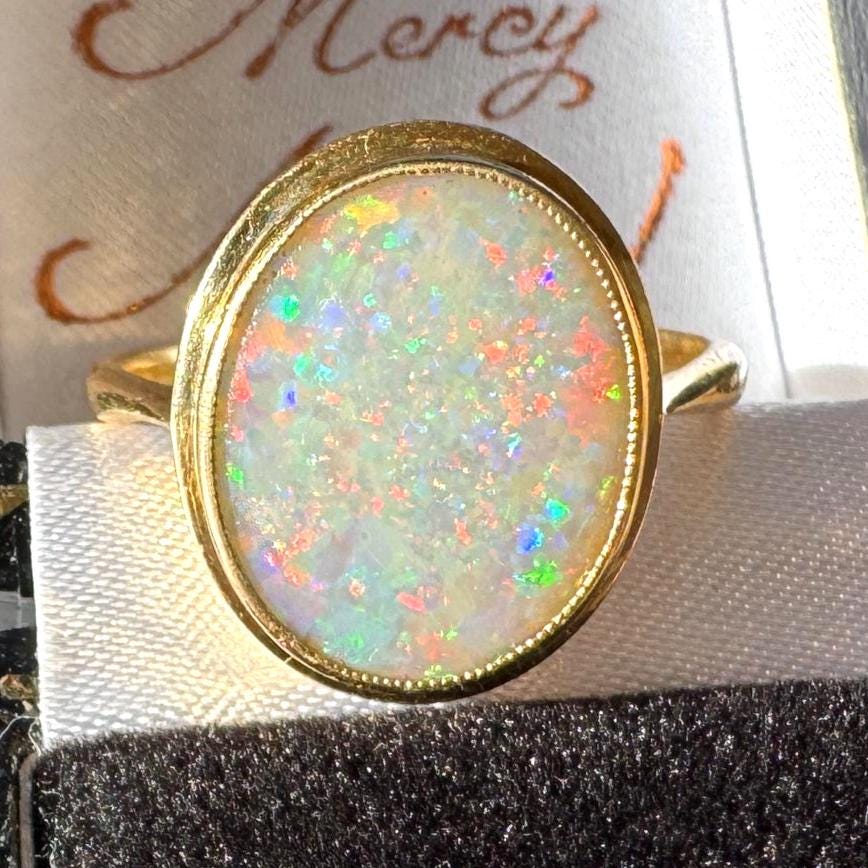 Set in rich 18ct gold, the mount reflects the restrained elegance of late Victorian neoclassical taste. The design is architectural yet feminine with a reassuring weight. Featuring a beautifully stepped gallery that elevates the opal to catch the light from every angle a slim band with nipped shoulders tapers gracefully into the shank. The bezel setting is finished with a delicate scalloped edge — a hallmark of quality workmanship from the period which softens the form while securing the stone with confidence. The opal is open-backed, allowing maximum light penetration to enhance its internal fire.