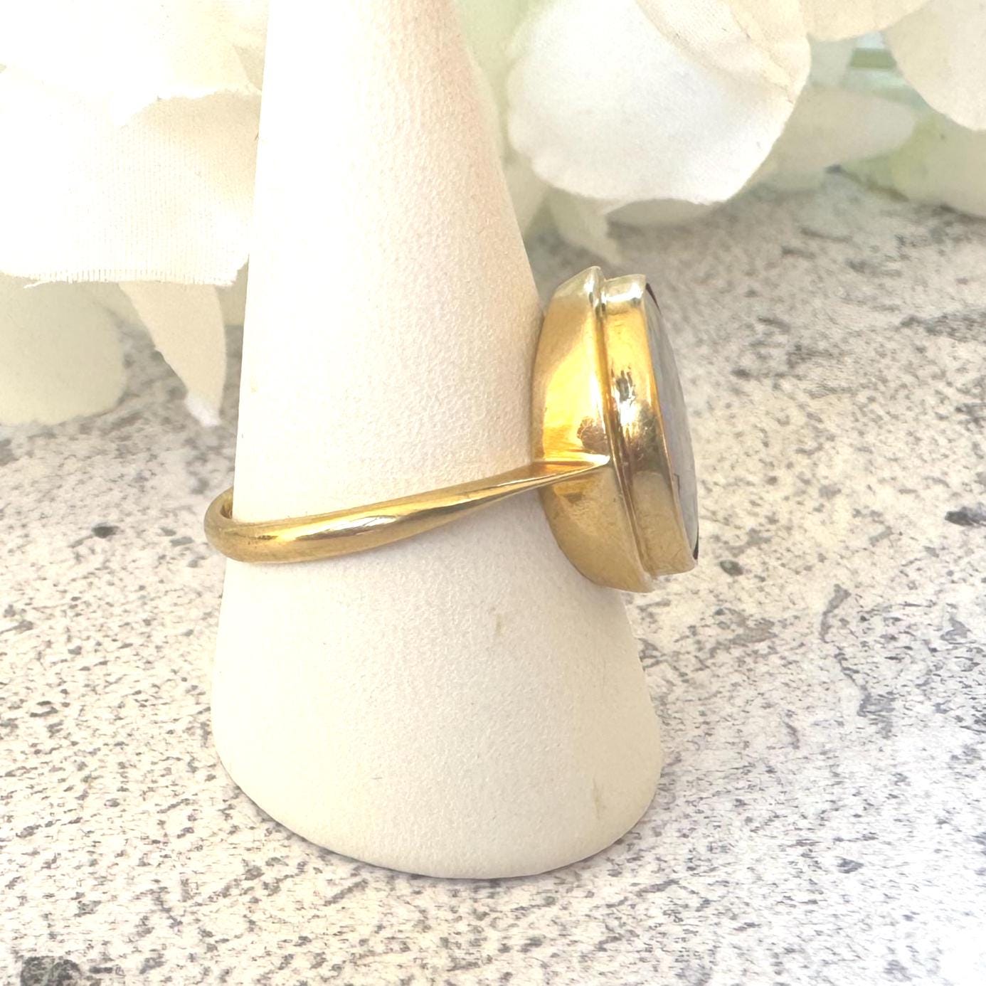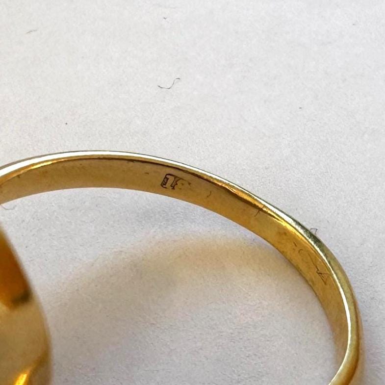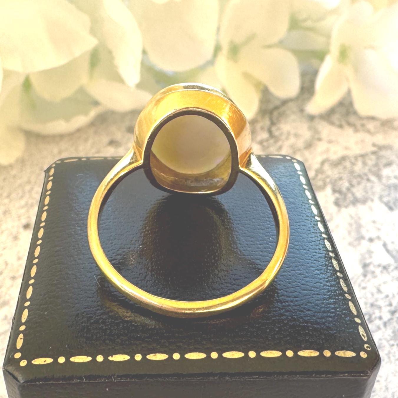 Set in rich 18ct gold, the mount reflects the restrained elegance of late Victorian neoclassical taste. The design is architectural yet feminine with a reassuring weight. Featuring a beautifully stepped gallery that elevates the opal to catch the light from every angle a slim band with nipped shoulders tapers gracefully into the shank. The bezel setting is finished with a delicate scalloped edge — a hallmark of quality workmanship from the period which softens the form while securing the stone with confidence. The opal is open-backed, allowing maximum light penetration to enhance its internal fire.