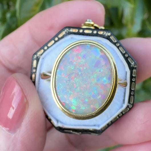 This stunning antique Victorian ring features a solid, oval-cut natural Australian opal that is around 4cts in size and full of fire. The beautiful gemstone displays a vibrant play of colour with flashes of blue, green, orange, purple and red that shimmer and shift in an almost confetti-like mosaic.