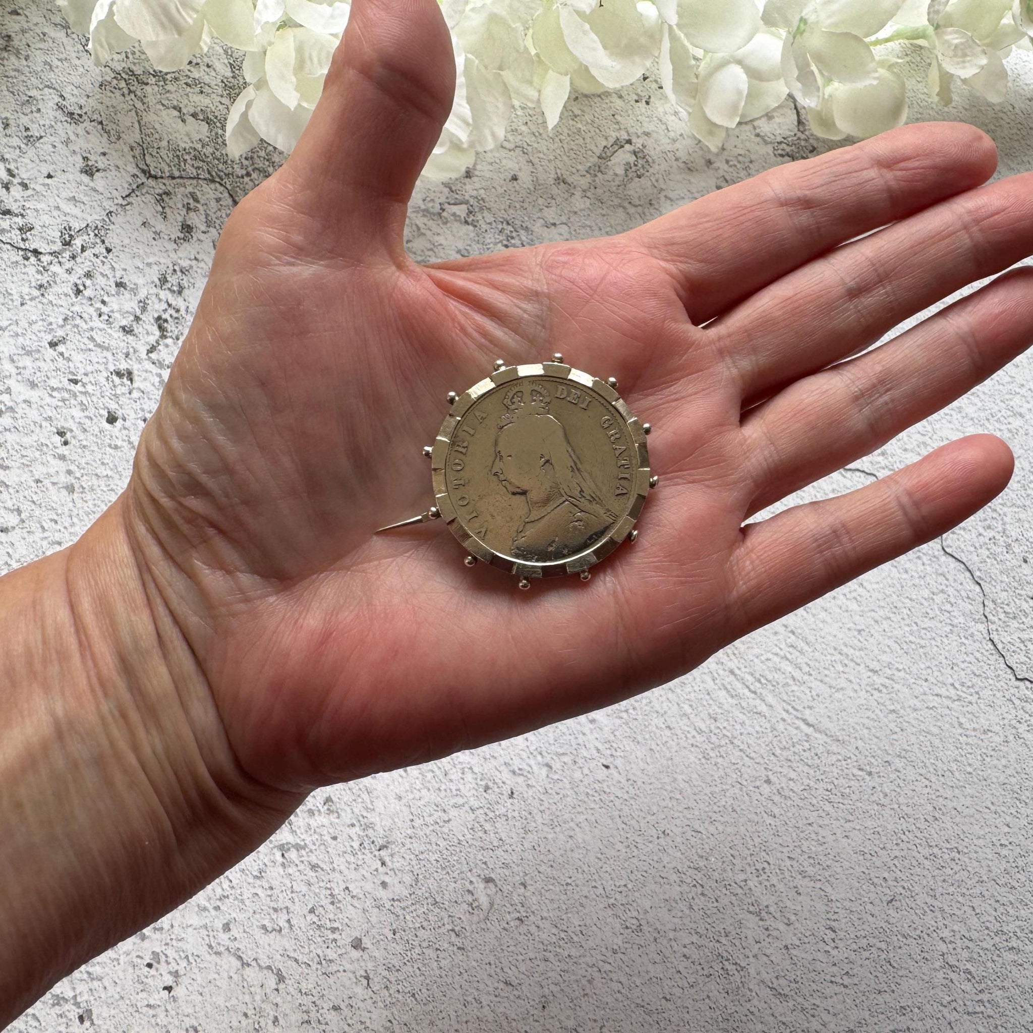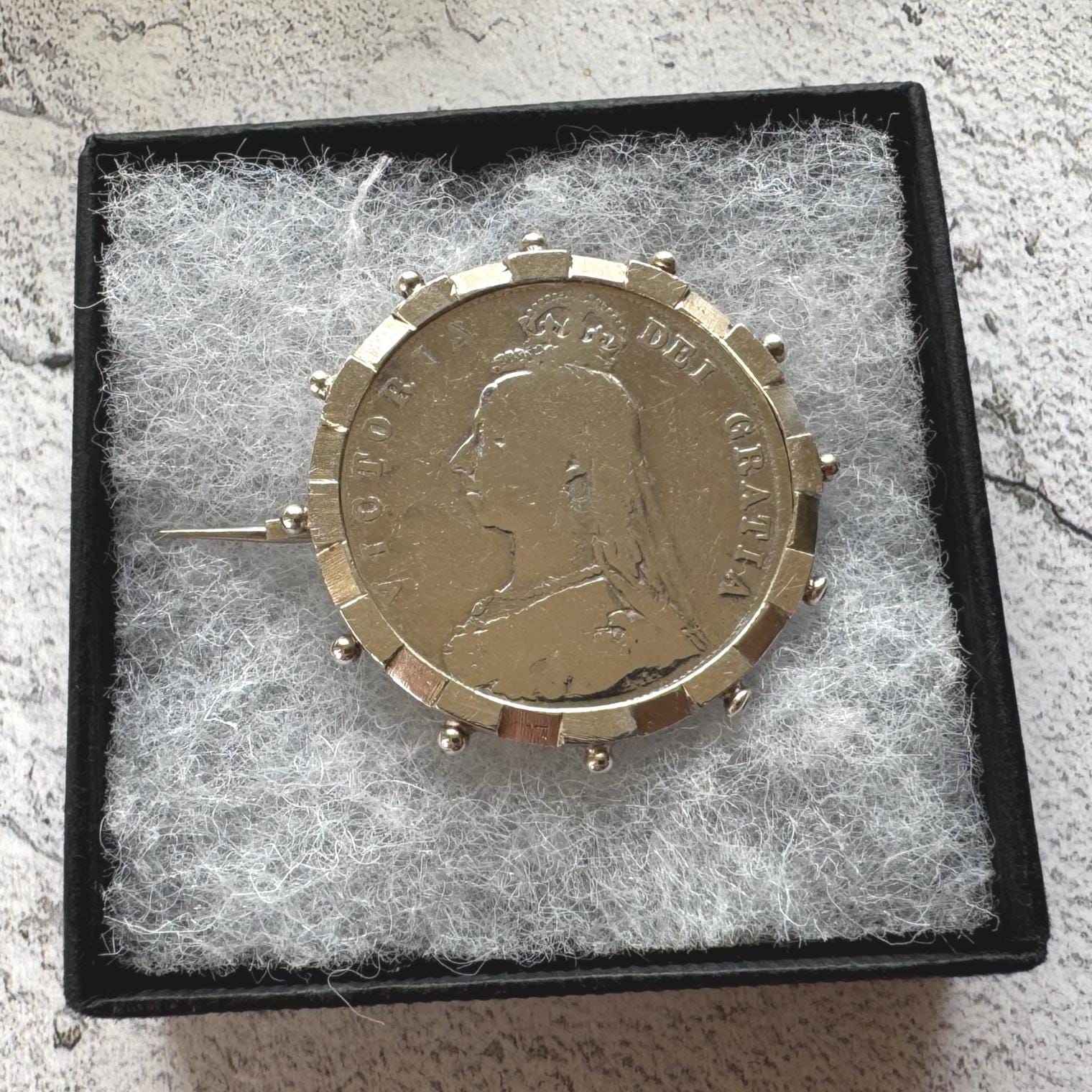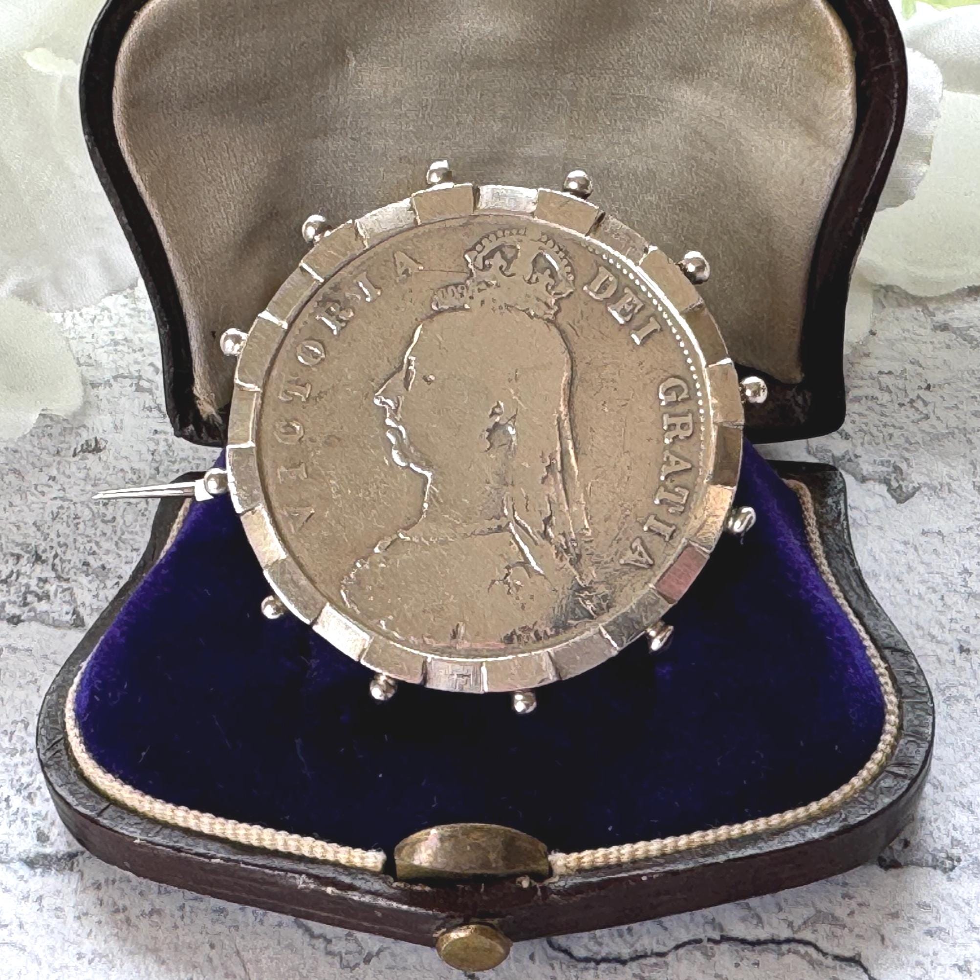 This ingenious fully hallmarked sterling silver brooch frame holds a huge Queen Victoria 1887 "full crown" coin. Measuring 1-1/4"/3.2cm in diameter the coin is also solid sterling silver.