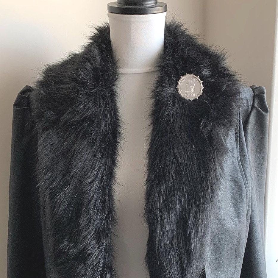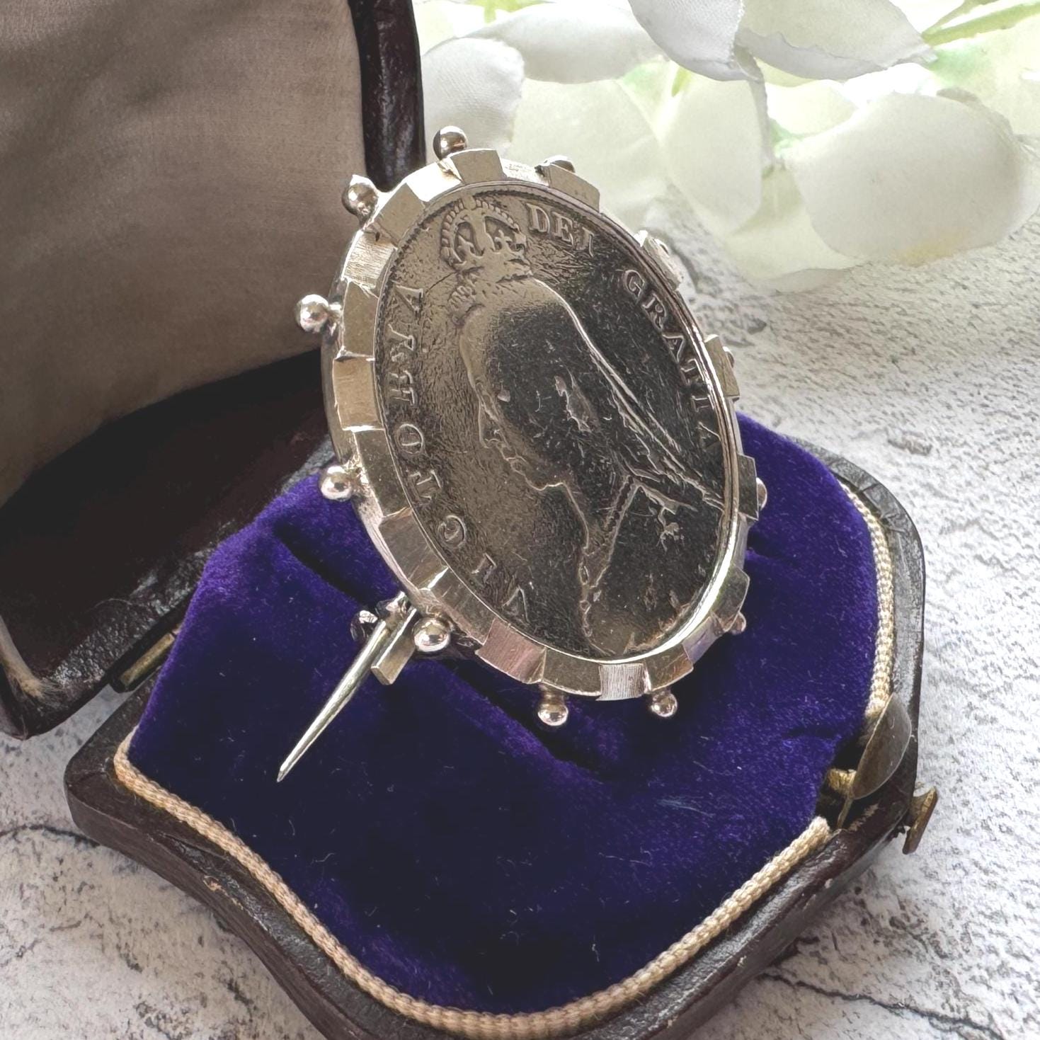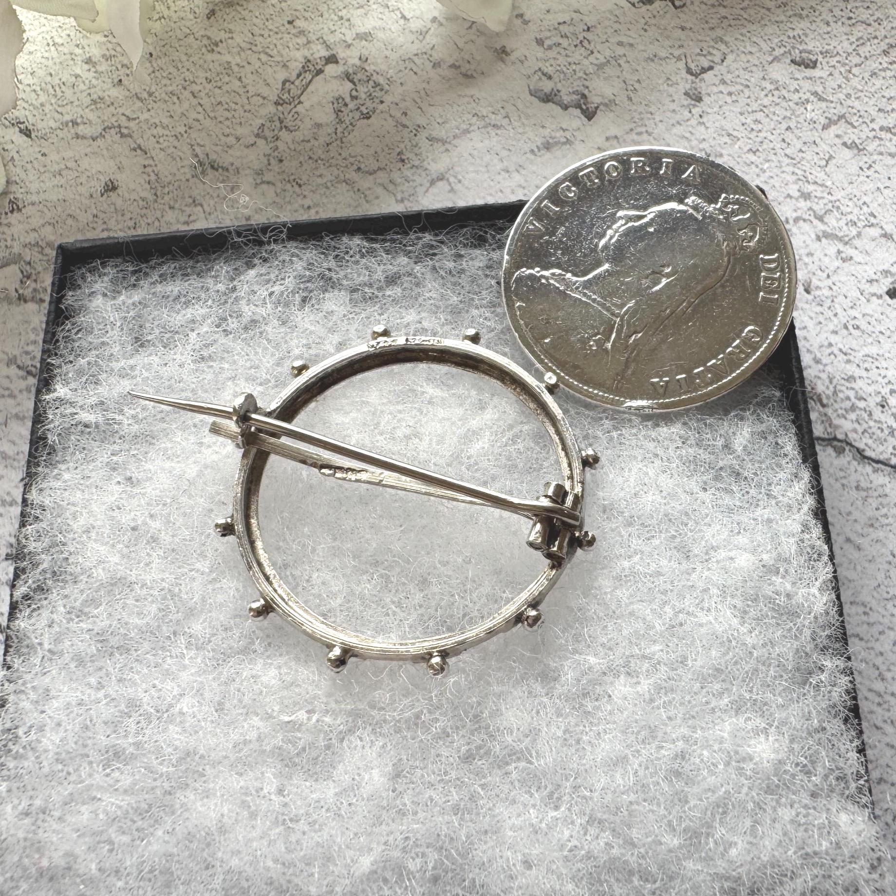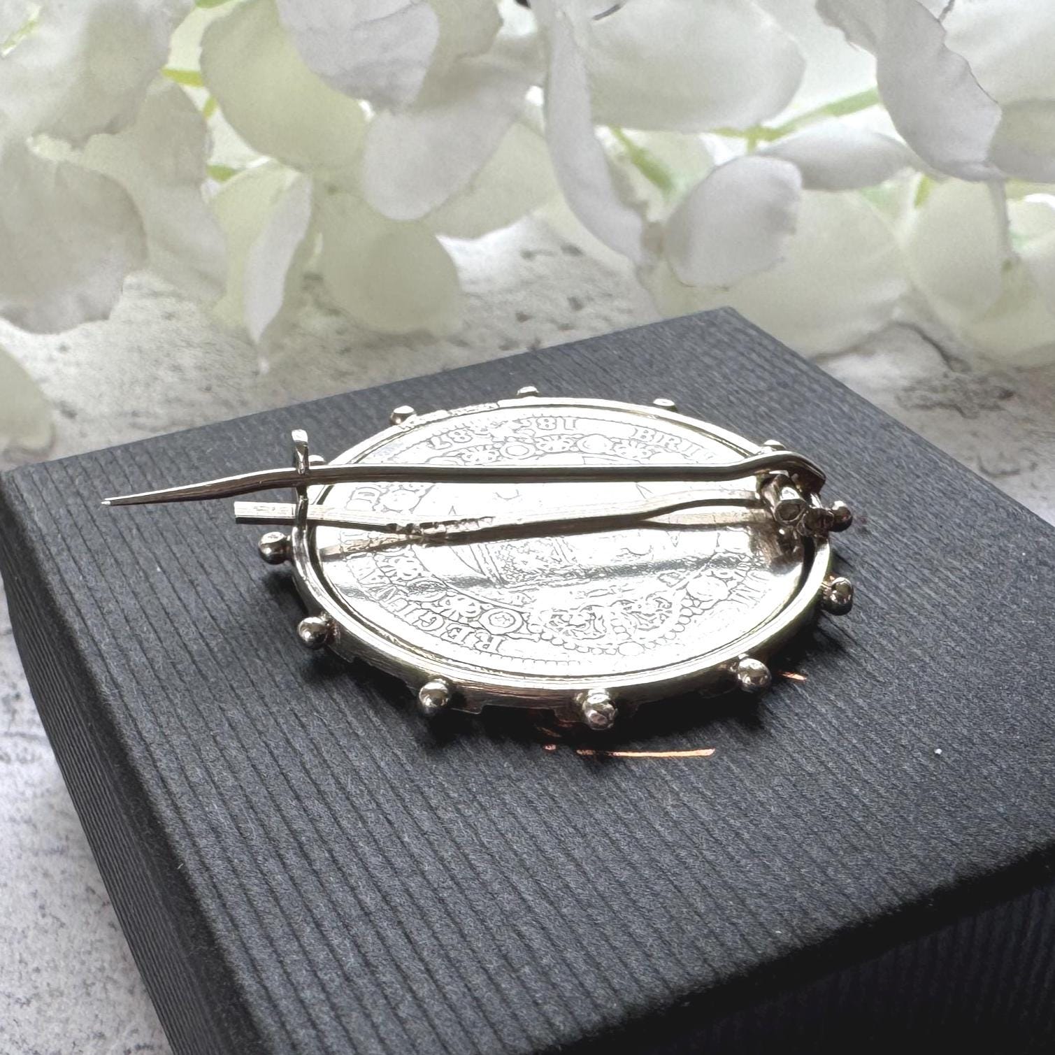 This ingenious fully hallmarked sterling silver brooch frame holds a huge Queen Victoria 1887 "full crown" coin. Measuring 1-1/4"/3.2cm in diameter the coin is also solid sterling silver.