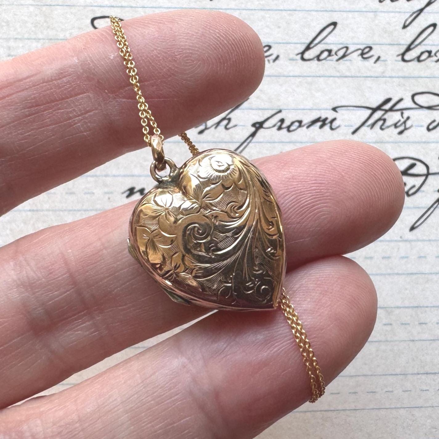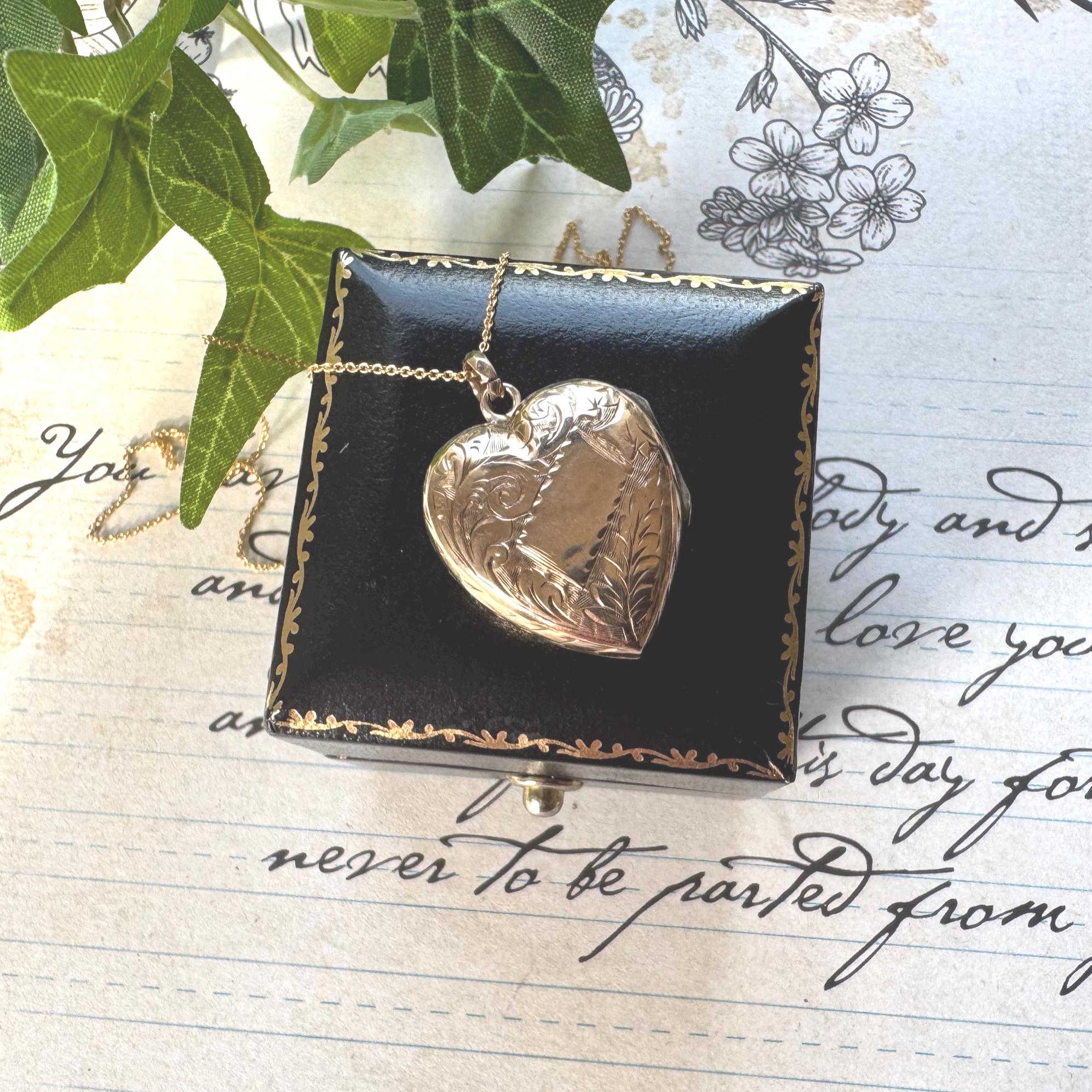 This beautiful heart shaped antique locket is circa 1890 - a true Victorian era piece, it is made of a warm old yellow gold. The front of the locket is engraved with leaf flourishes and has a ribbon shaped vacant cartouche to accommodate a monogram should you wish to have it engraved for a personal touch. The reverse is engraved in flowers and graceful scrolled swirls. This locket is topped in a diamond faceted jump ring and it can be worn with either side facing to vary the look.