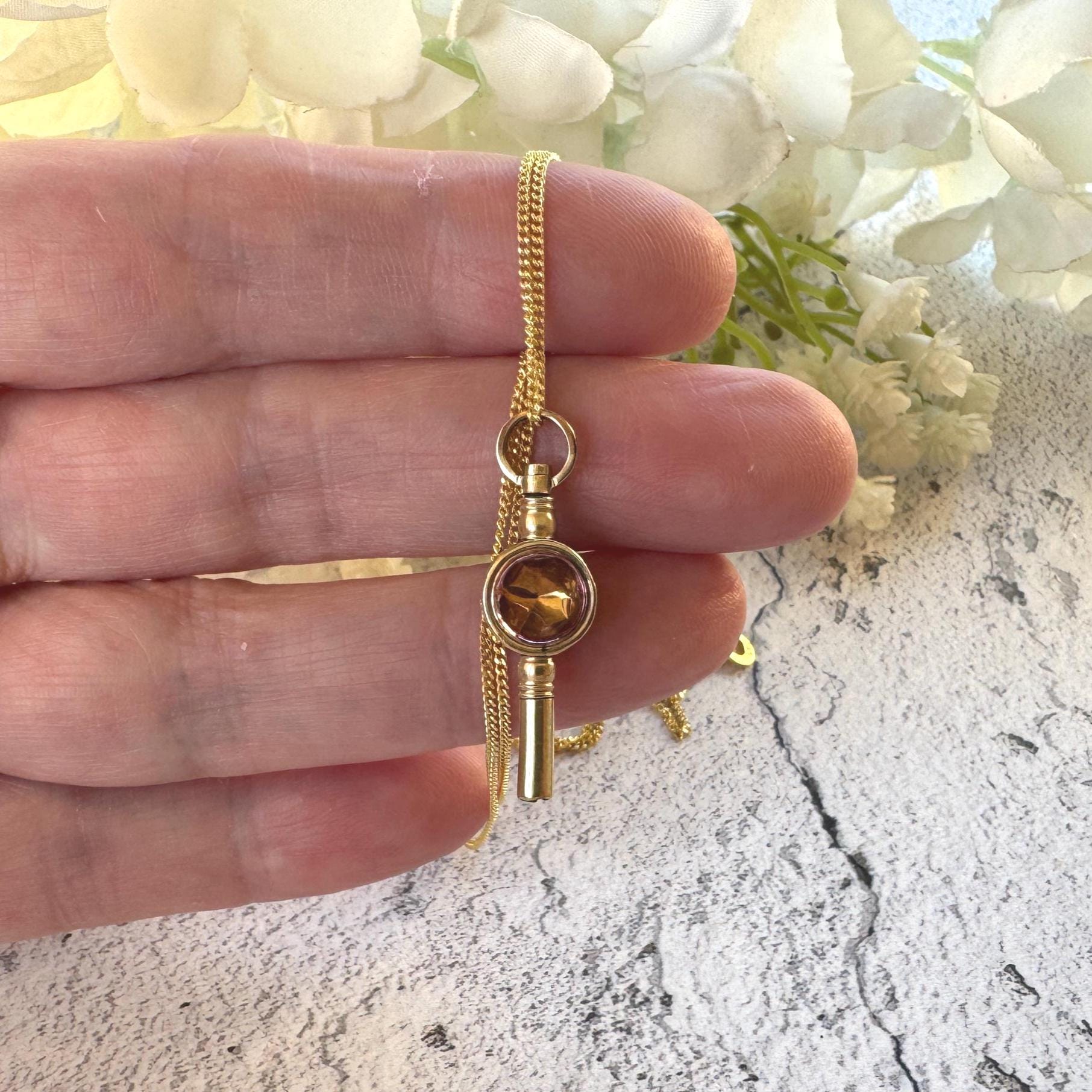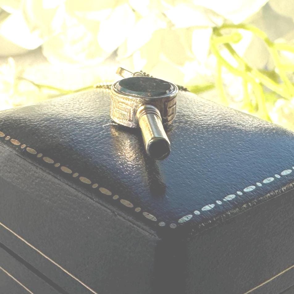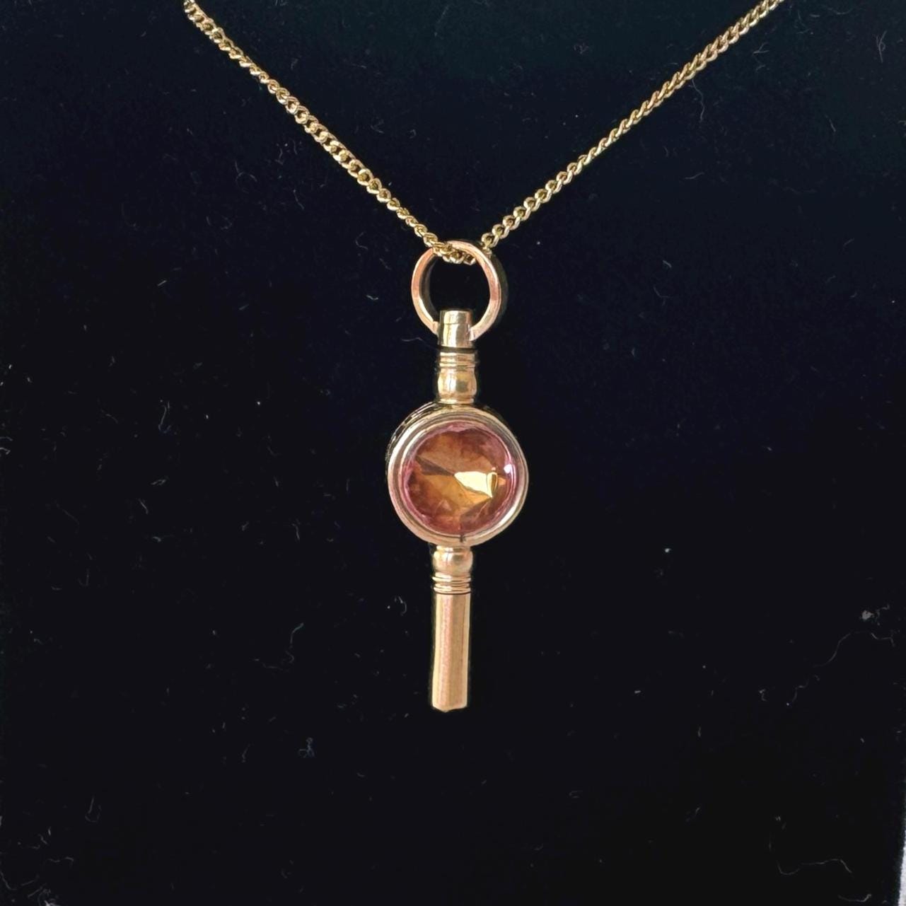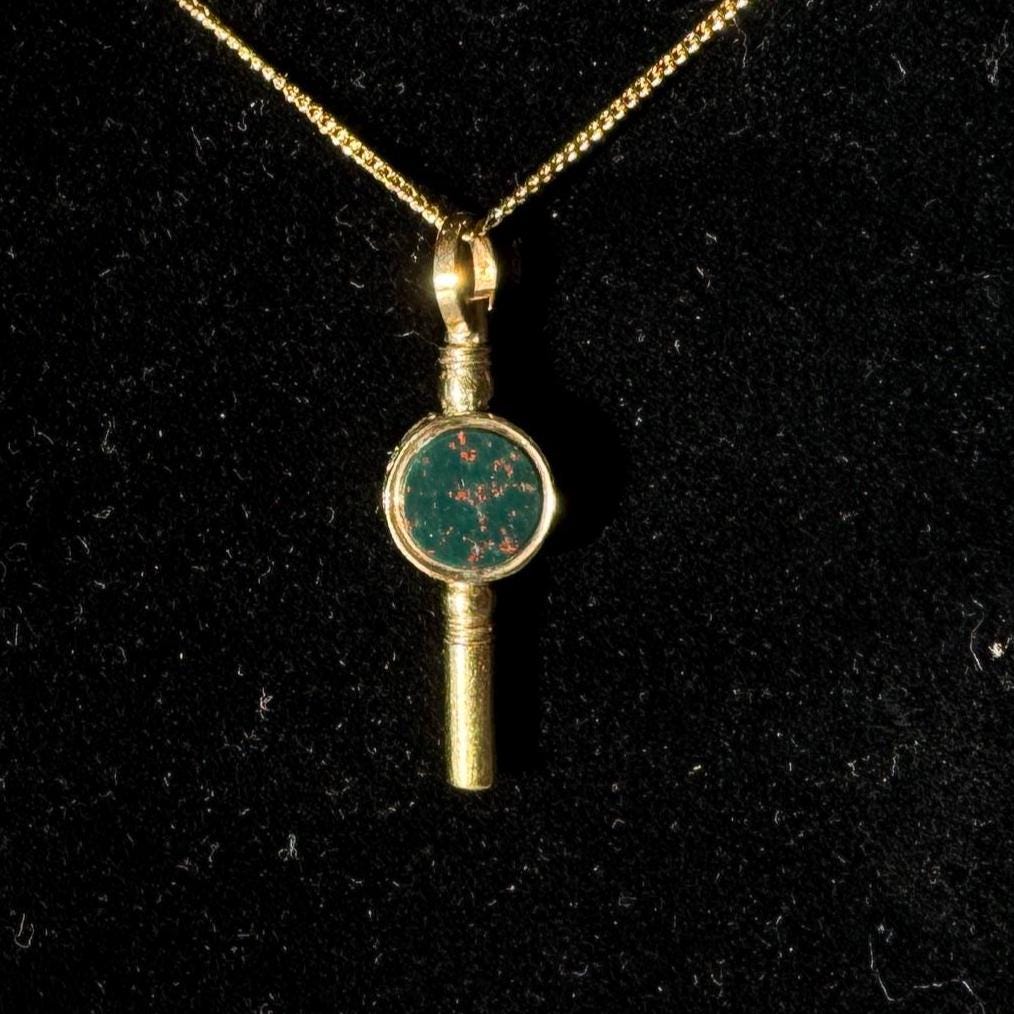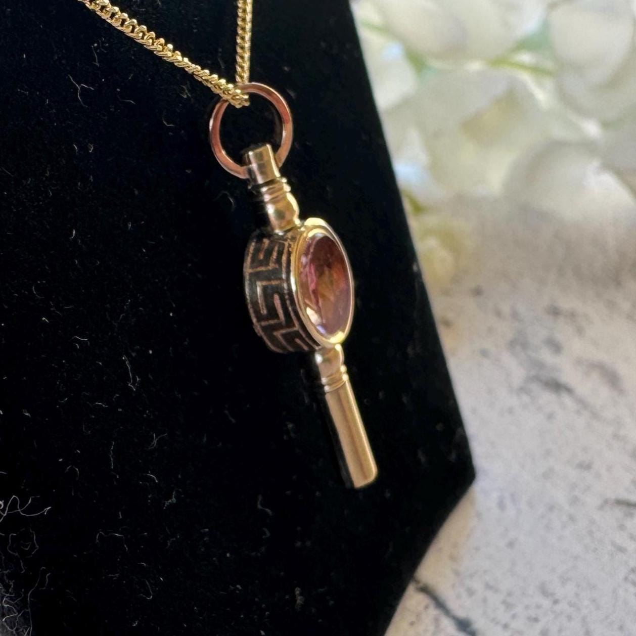 Crafted in warm 9ct gold this fabulous Victorian pocket watch key oozes beautiful antique detailing and charm. With a swivel loop at the top the key is mounted in a glowing golden yellow Scottish citrine and forest green bloodstone with the sides hand-engraved in a delicate Greek key pattern. Once used by a well-heeled Victorian to wind his or her pocket watch she is now a stunning pendant that you can adore and wear daily!