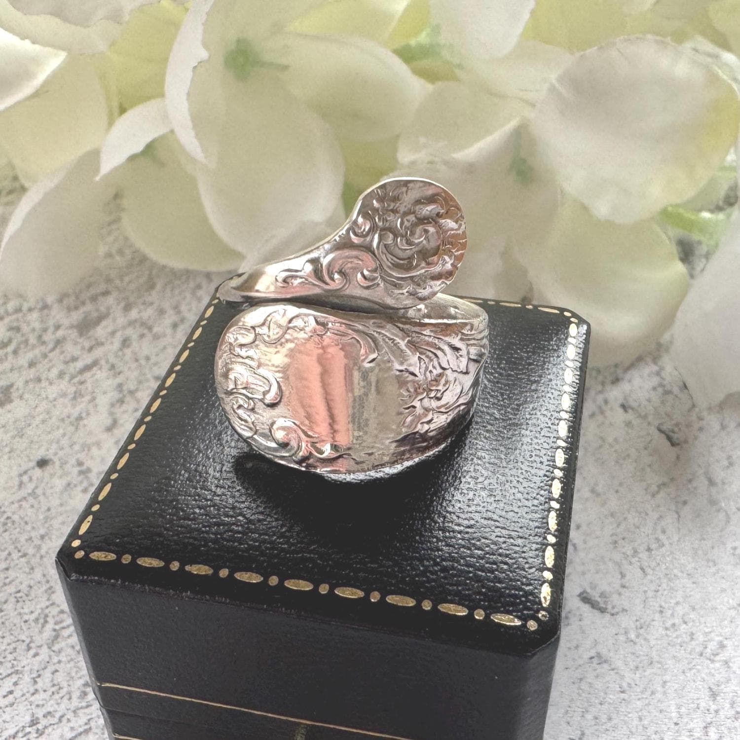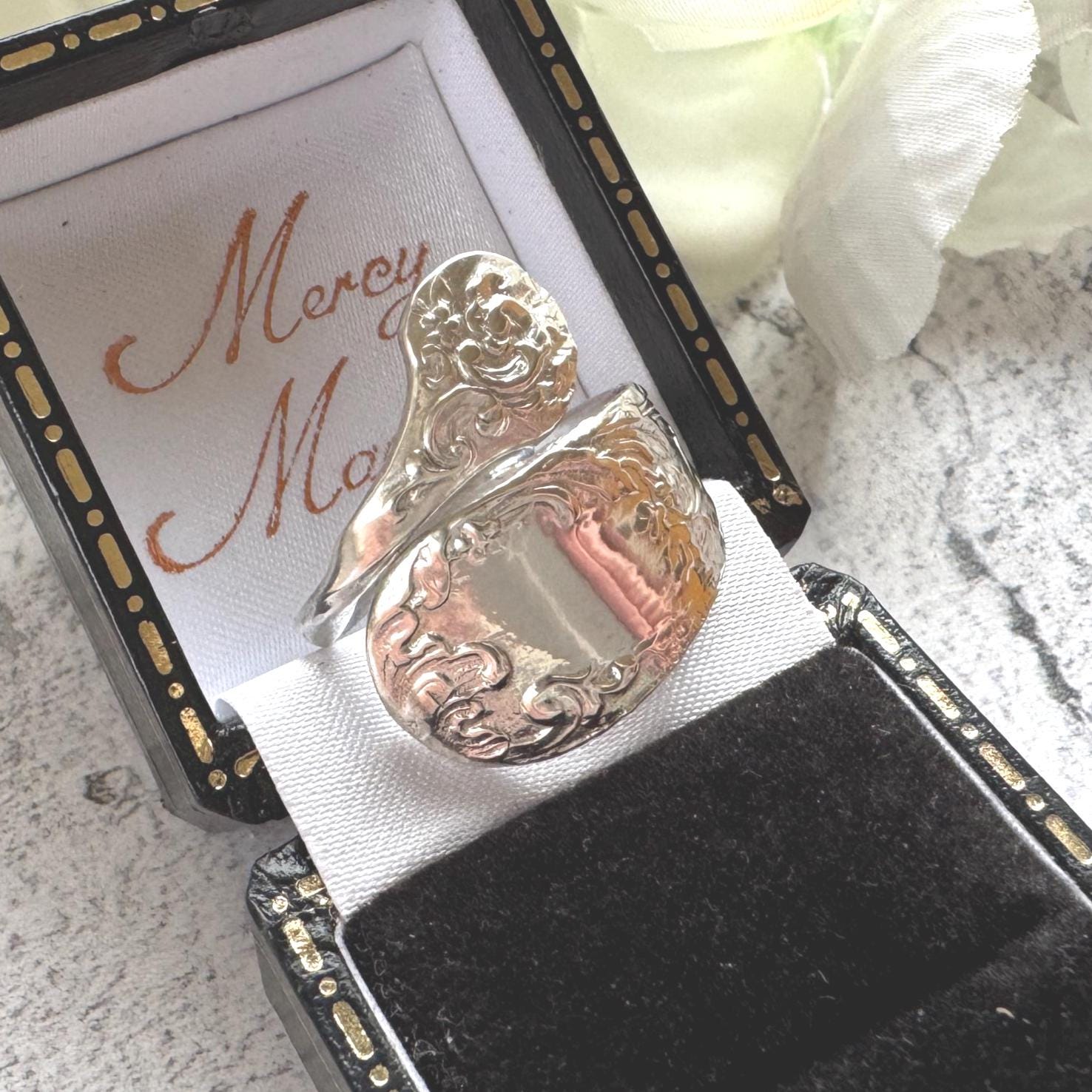 A sympathetically recreated Edwardian spoon ring, sustainably upcycled and completely unique. A wonderful statement ring for lovers of antique jewellery, Art Nouveau design, and sustainable fashion.
