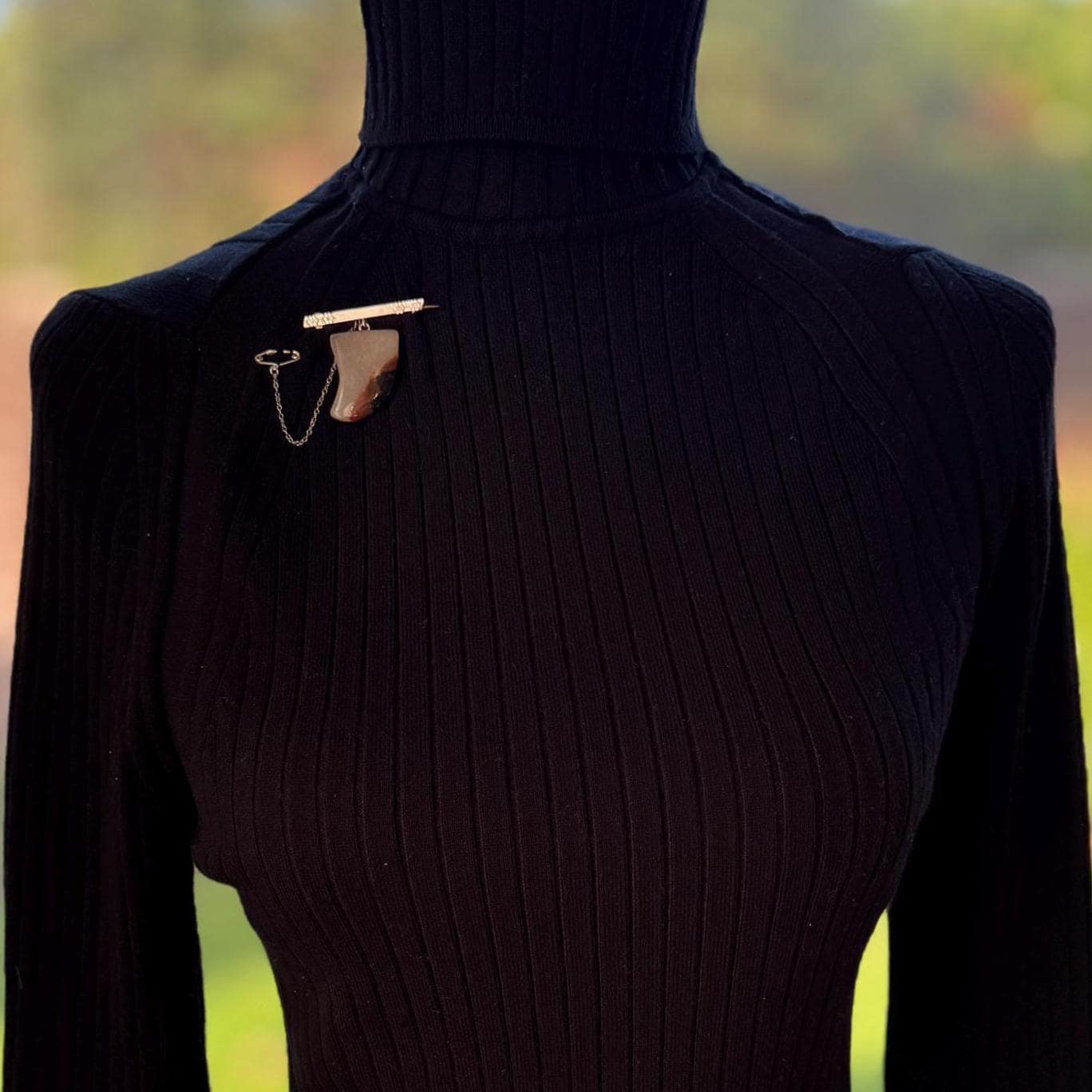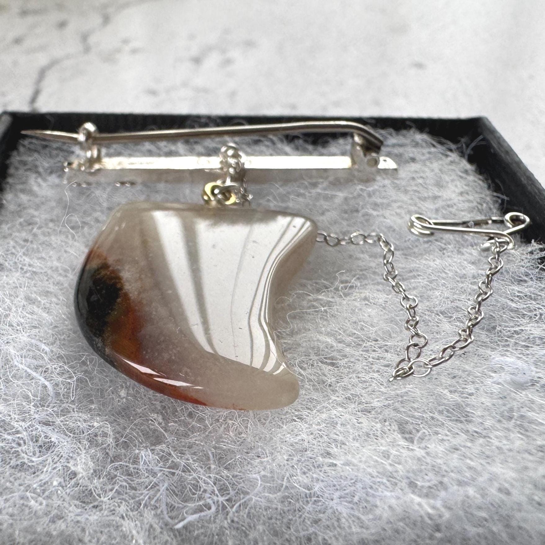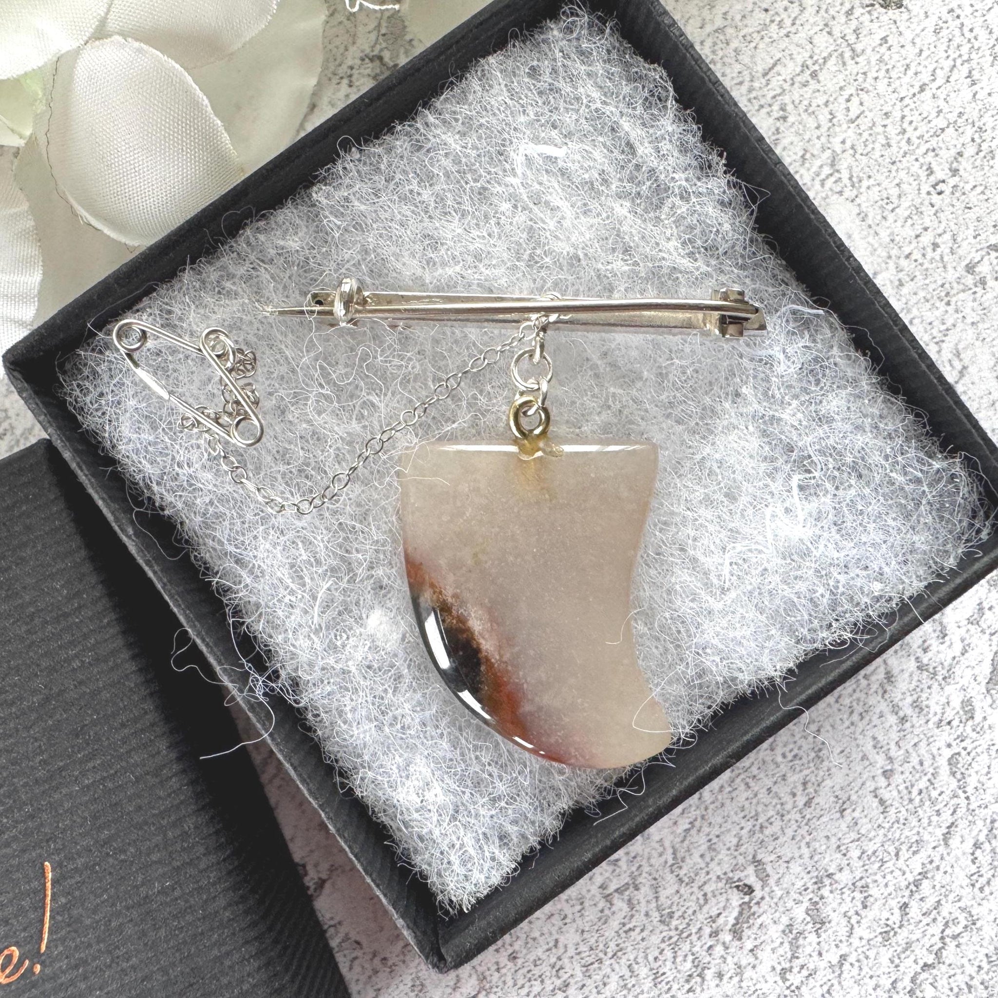 This antique sterling silver pendant drop brooch showcases a unique Scottish agate carved into the shape of an eagle or tiger claw. Scotland is known for its abundance agate which is found in a huge variety of colours and patterns, each type specific to a particular place. Queen Victoria's love affair with Scotland generated high demand for 'Scottish pebble' agate jewellery and it still remains that way today!