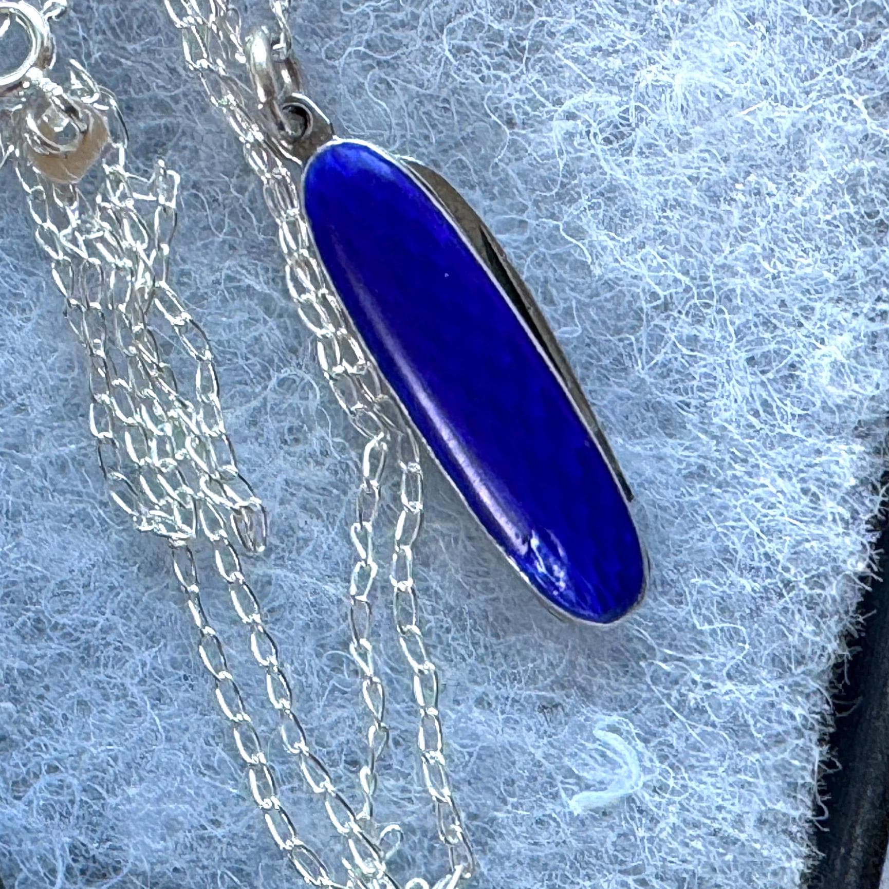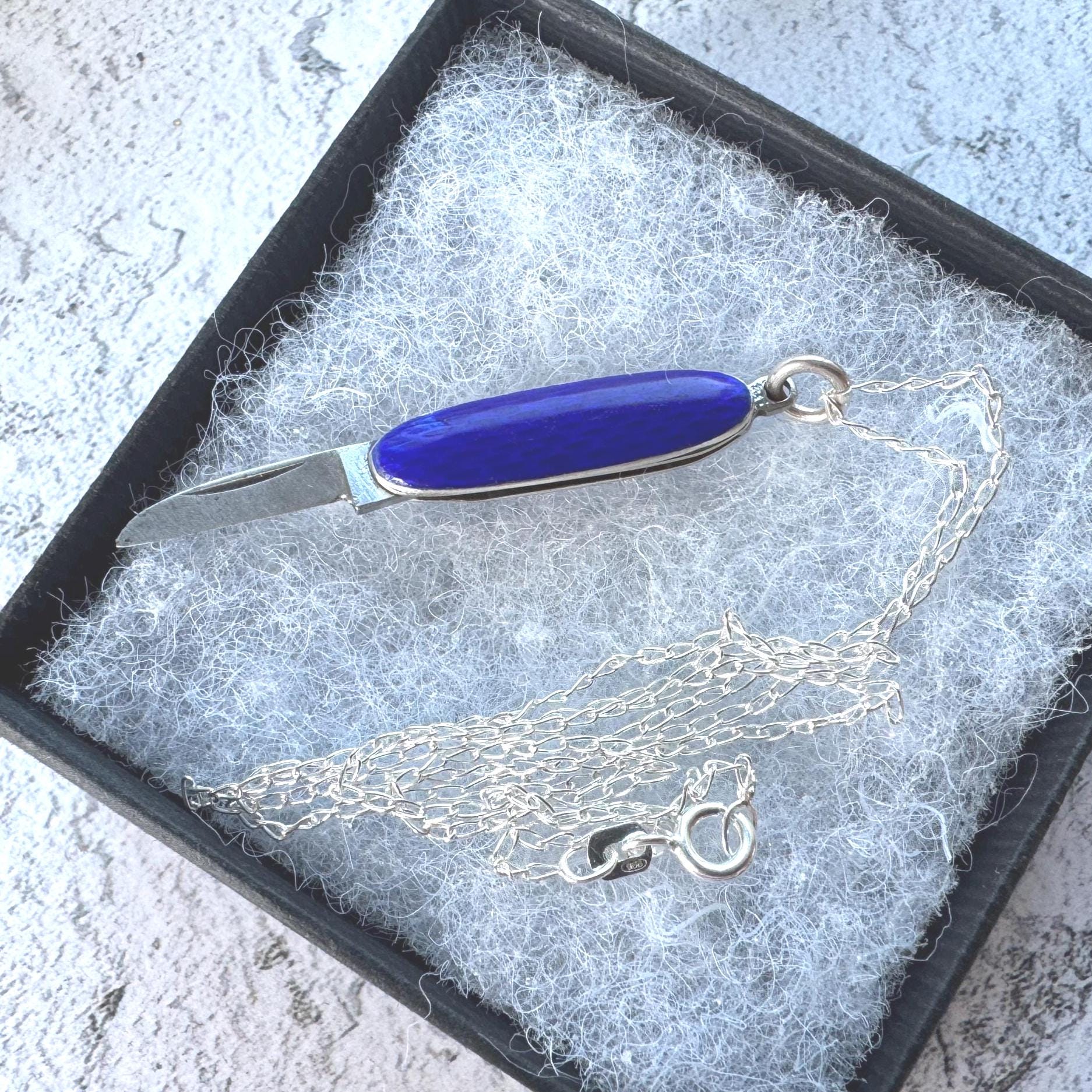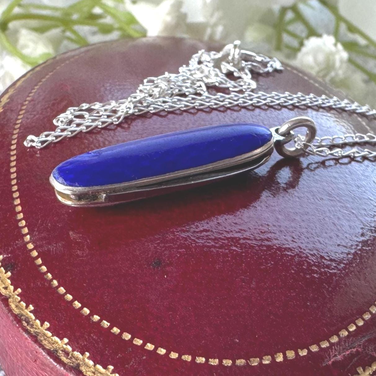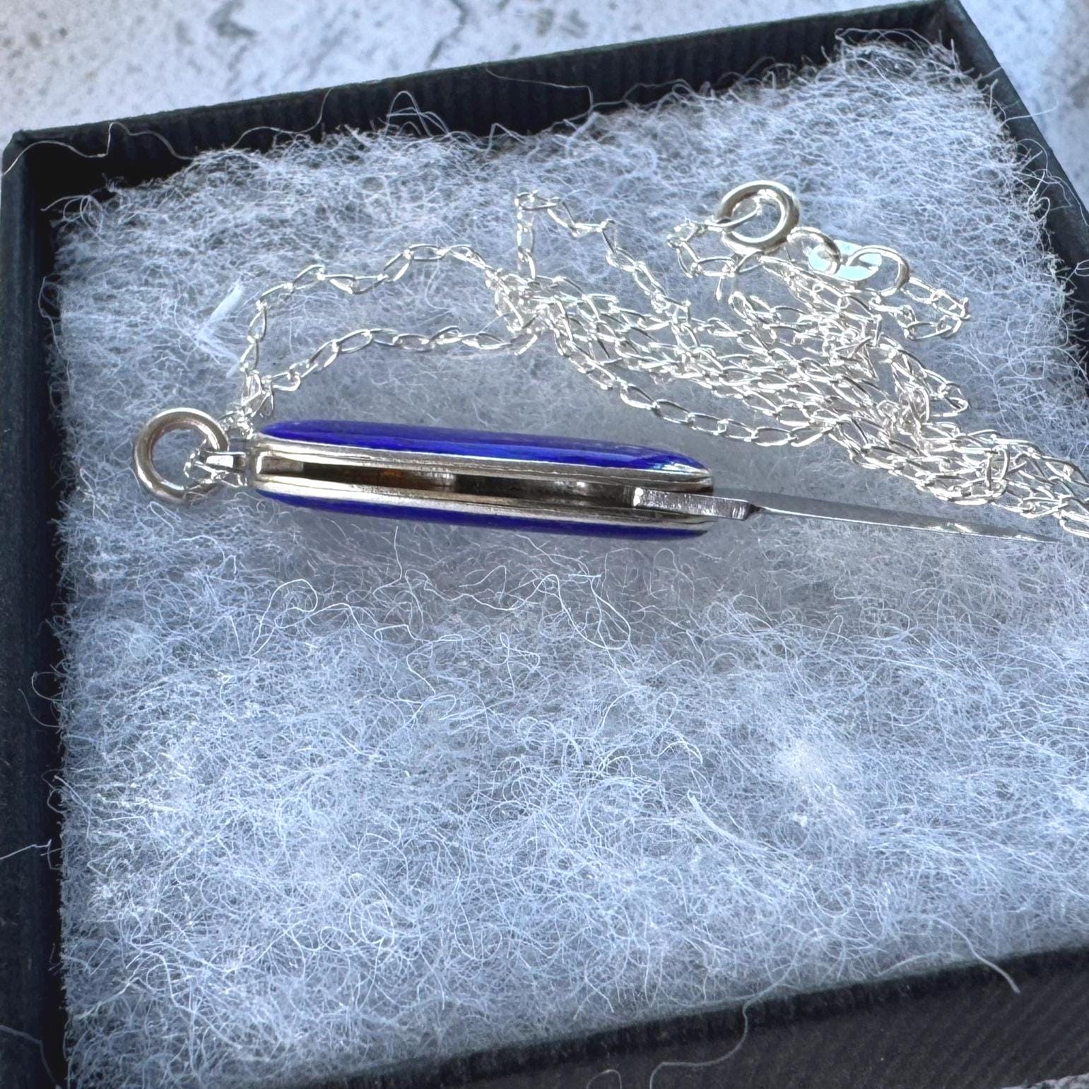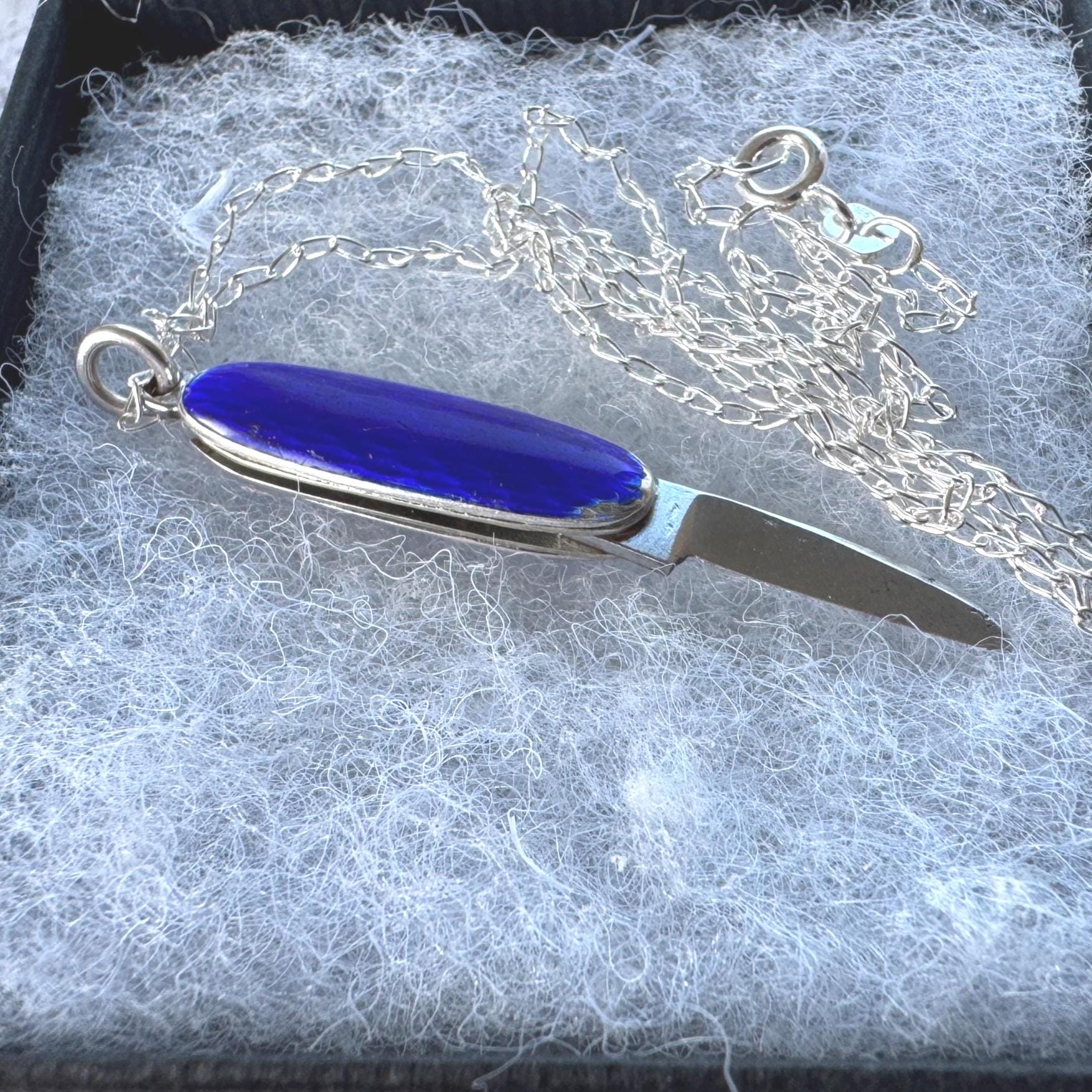 A delightful Victorian novelty pendant fashioned as a miniature folding fruit knife. Crafted in sterling silver and adorned with rich royal-blue guilloché enamel, this tiny treasure features a steel blade that neatly pulls out and folds back into its case.