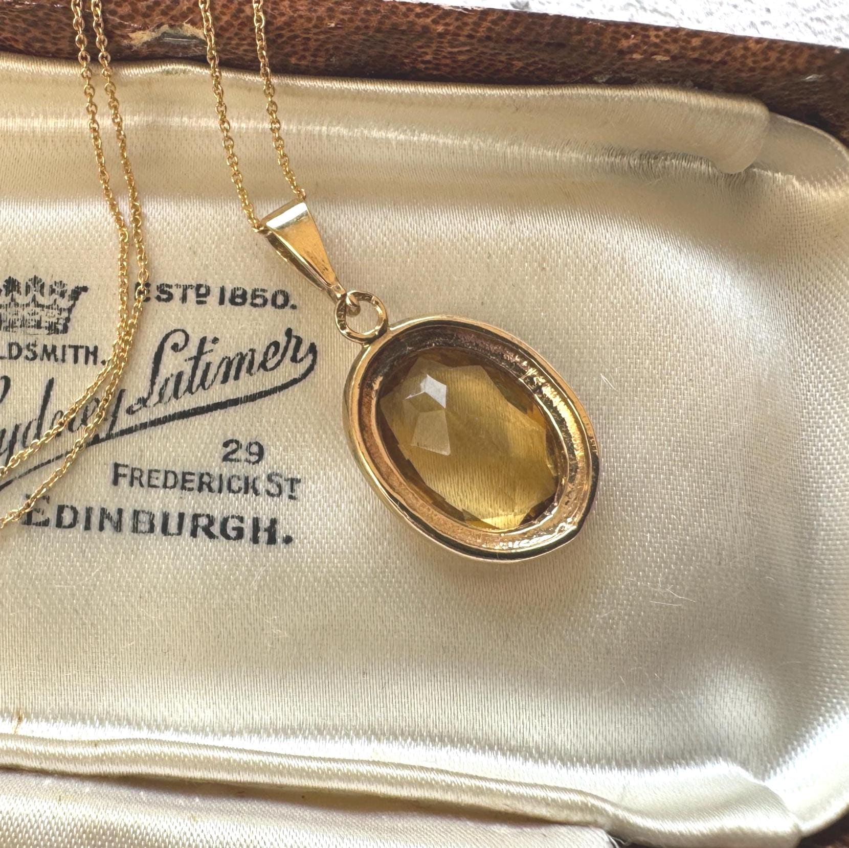 A beautiful little 1980's hallmarked 9ct gold pendant set with a stunning golden yellow coloured citrine. The natural citrine is bezel set in an elegant classical style mount topped with a fan-shaped bale. The chubby oval stone is beautifully faceted and comes to a point at the back. Such a beautiful little pendant sauratated in rich glowing colour.