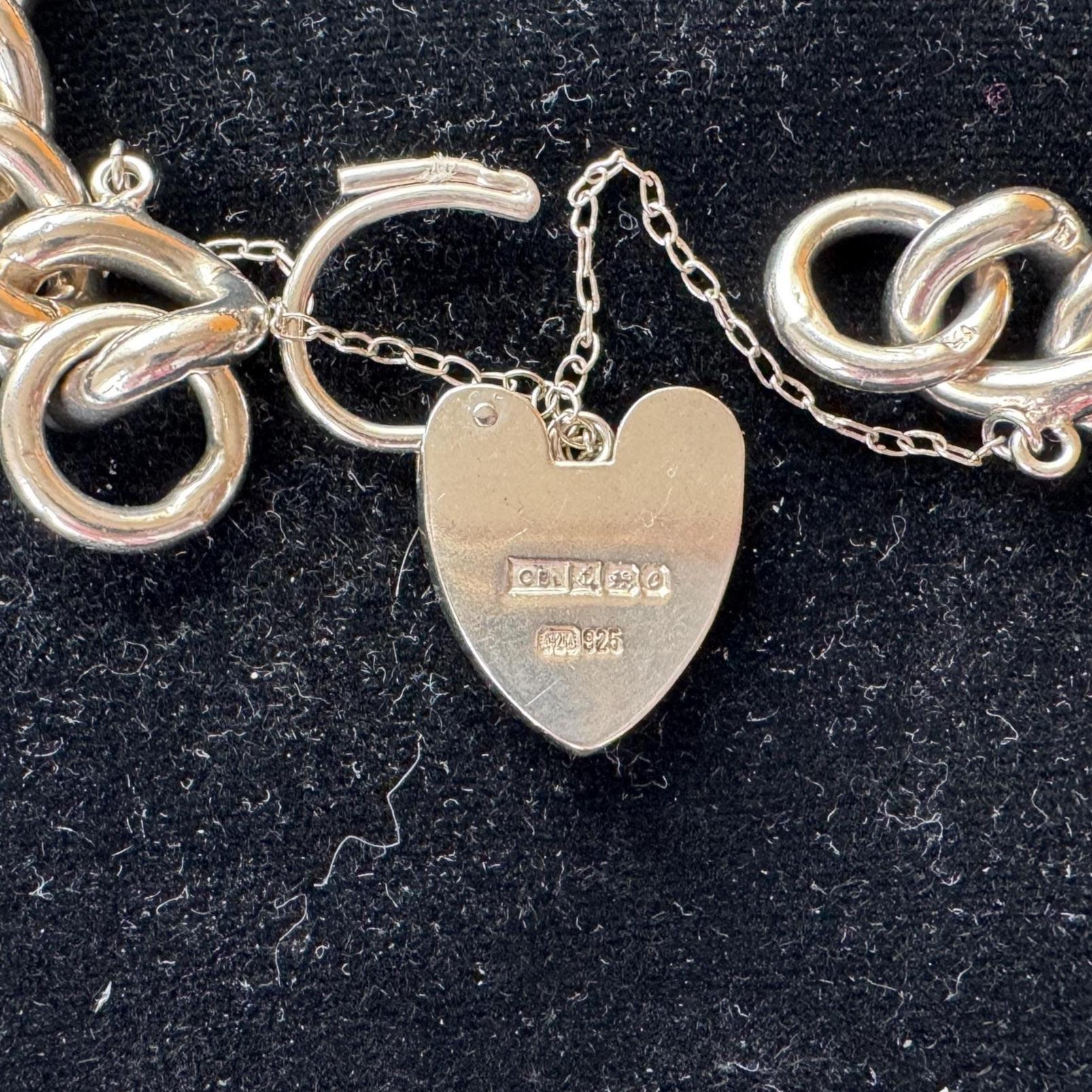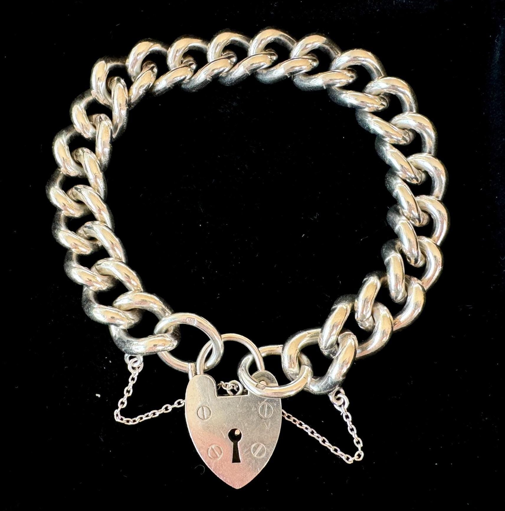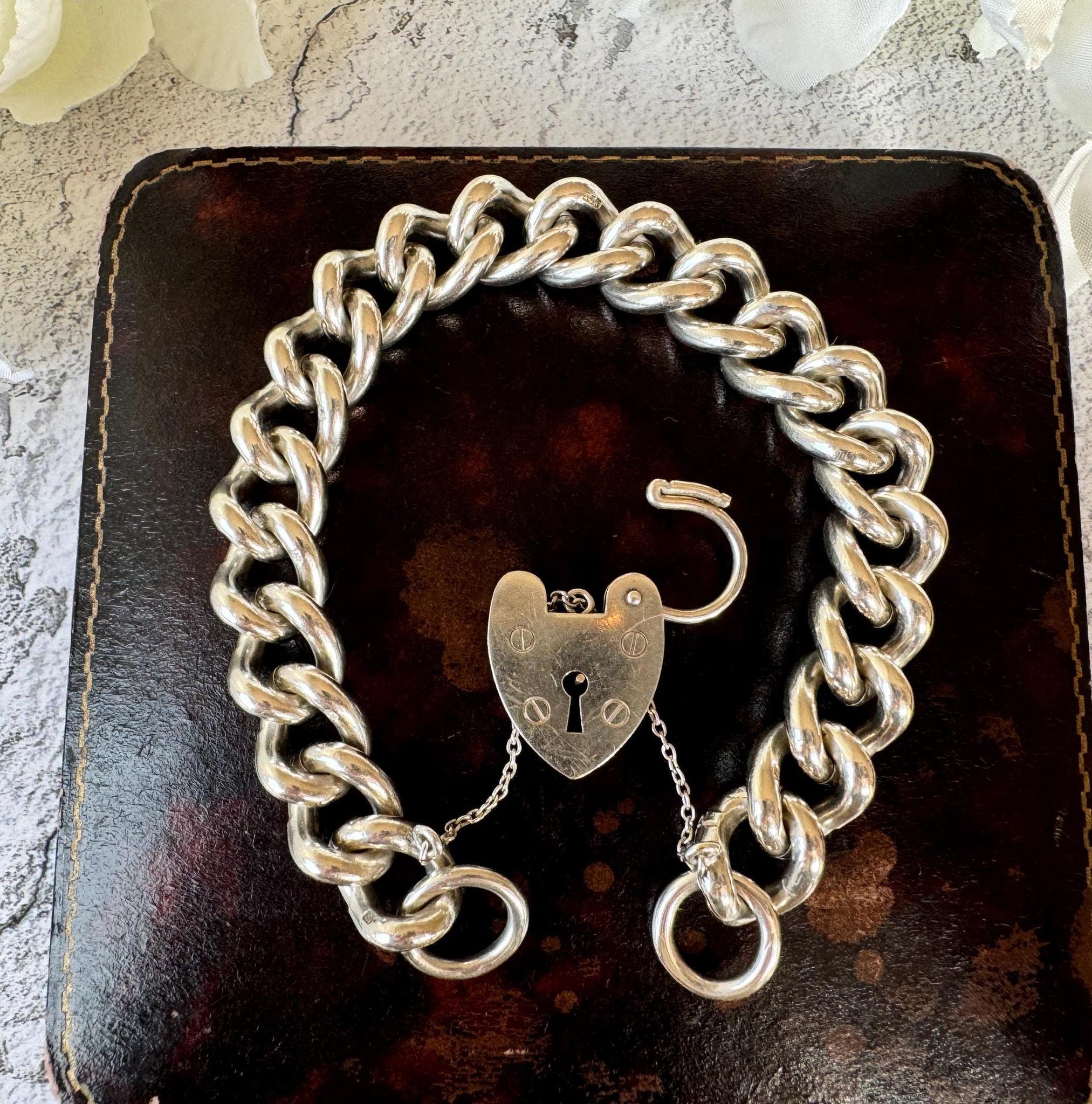 Weighing over 55 grams this bracelet is stamped throughout the links with the British lion passant for sterling, extensive hallmarking like this is always a sign of a quality chain. The bracelet has very thick solid links (not hollow) with the end rings soldered safely closed. It has a large size heart padlock complete with a real keyhole. No key is required to open the padlock, the hasp simply pushes in at the nub to open it and it swings back and locks closed with a solid click. A built in safety chain completes this impressive piece.