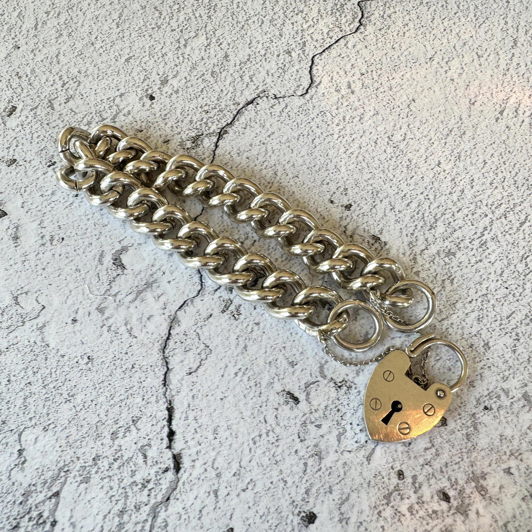 An incredible heavy and chunky all original vintage sterling silver curb chain bracelet with a heart padlock clasp that bears good clear hallmarks for Birmingham 1977.