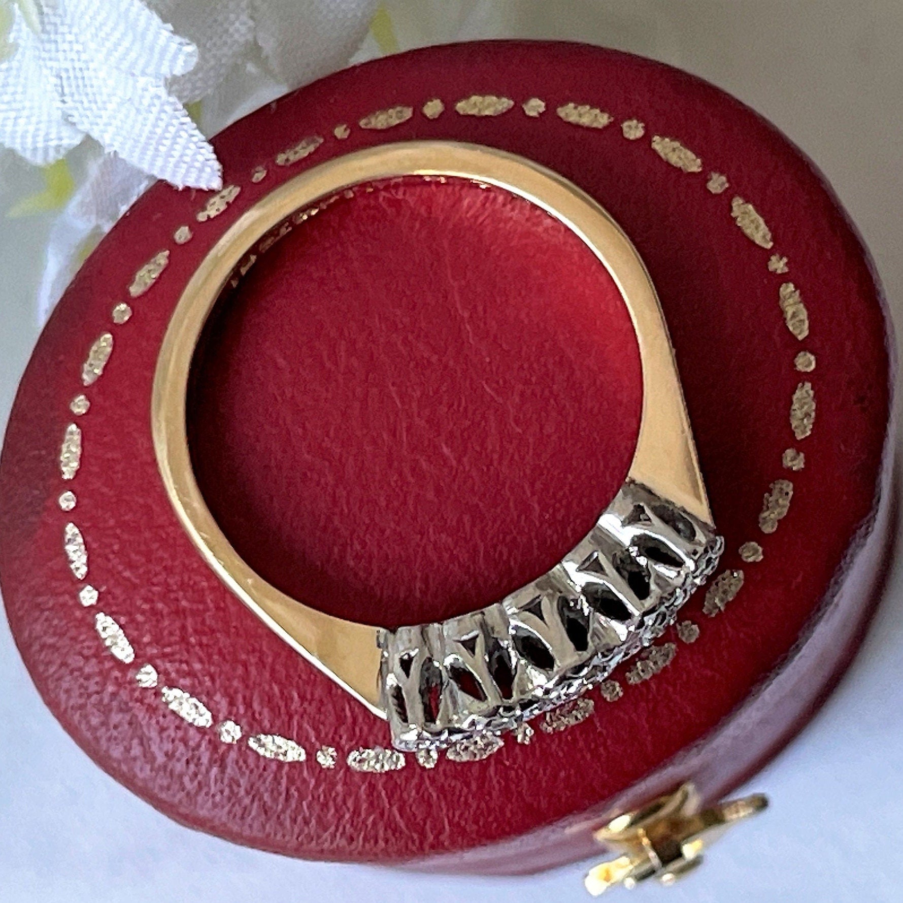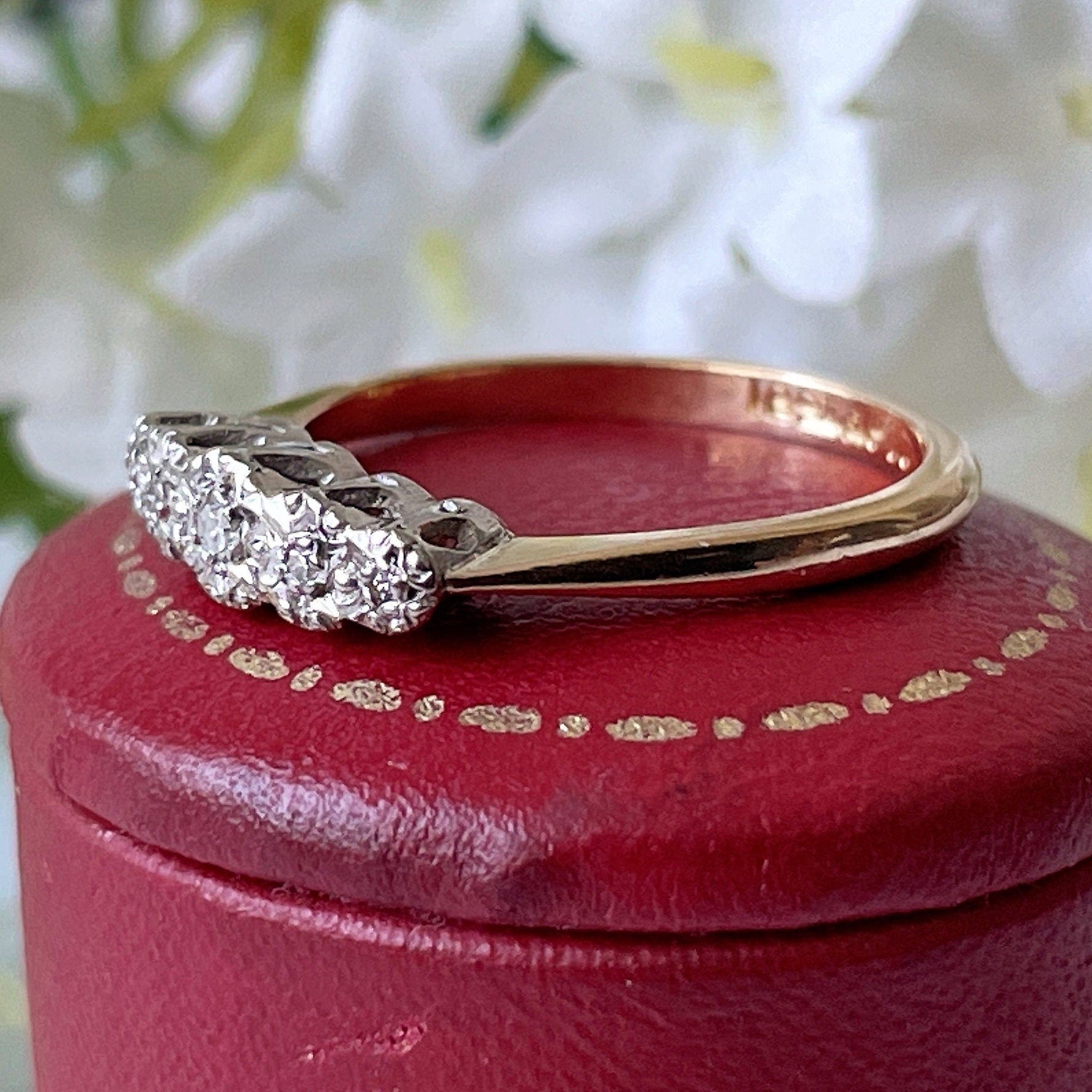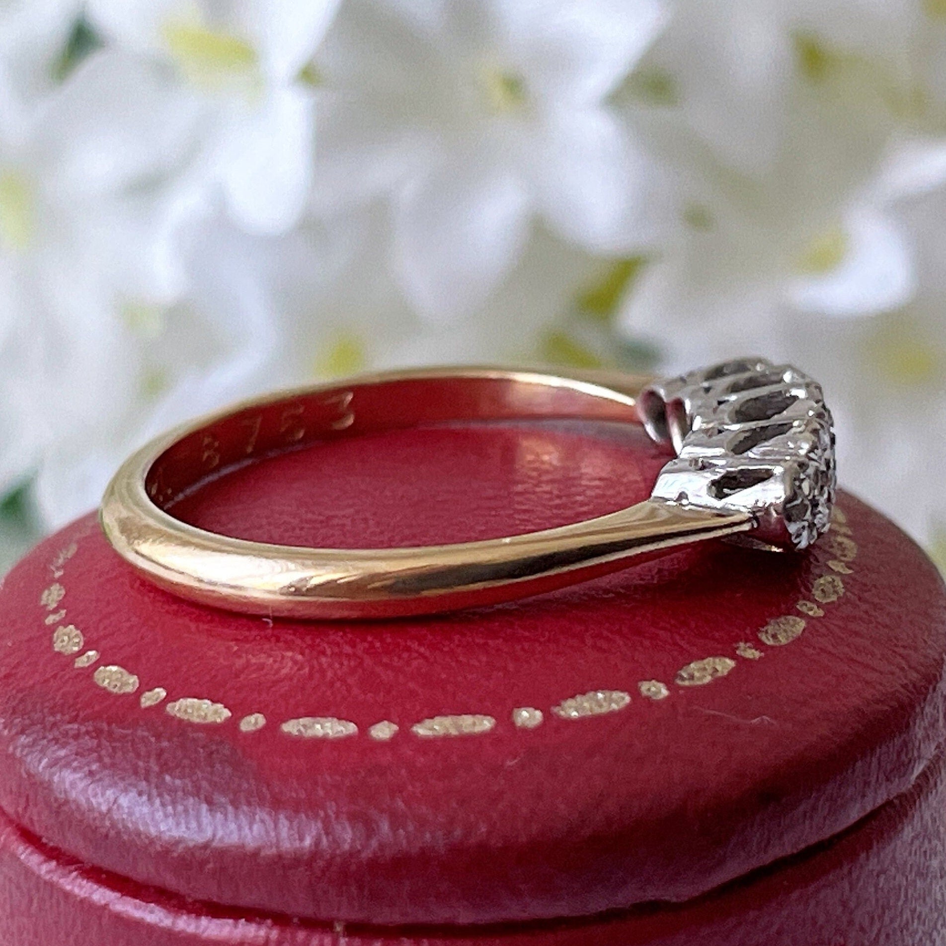 A line of 5 old European cut diamonds grace the front of this elegant Art Deco period 18ct gold and platinum ring.