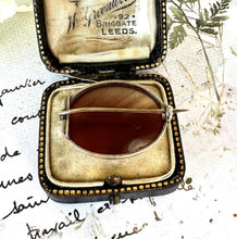 This perfectly formed little antique Victorian lapel/cravat pin boasts an adorable specimen of Scottish carnelian. The spicy red gemstone is semi-translucent with clear milky white banding.