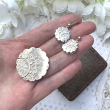 This wonderful all original antique Victorian sterling silver earring and locket brooch jewellery suite comes in its original fitted jewellers case and looks to have been rarely, if ever worn. After all this time it is very rare to find them still together! The matching pieces have pie-crust edges and are embellished in gorgeous Aesthetic era engraving featuring Scottish thistles and roses. Raised semi-circles of square silver wire and rhombus shaped studs add to the delightful decoration.