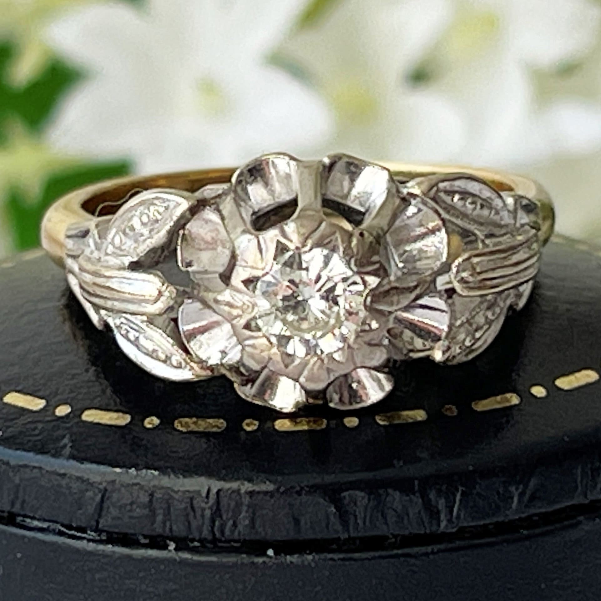 Weighing an impressive 5.4 grams, there is substantial gold presence here, giving exceptional finger coverage and a wonderfully confident feel when worn. The design combines a white gold gallery with a rich yellow gold band, showcasing a natural earth-mined diamond of approximately 0.25ct. The diamond is fully enclosed within a dramatic star-shaped setting and sits high atop a buttercup-style mount, creating a striking illusion that gives the appearance of a much larger, near one-carat stone.