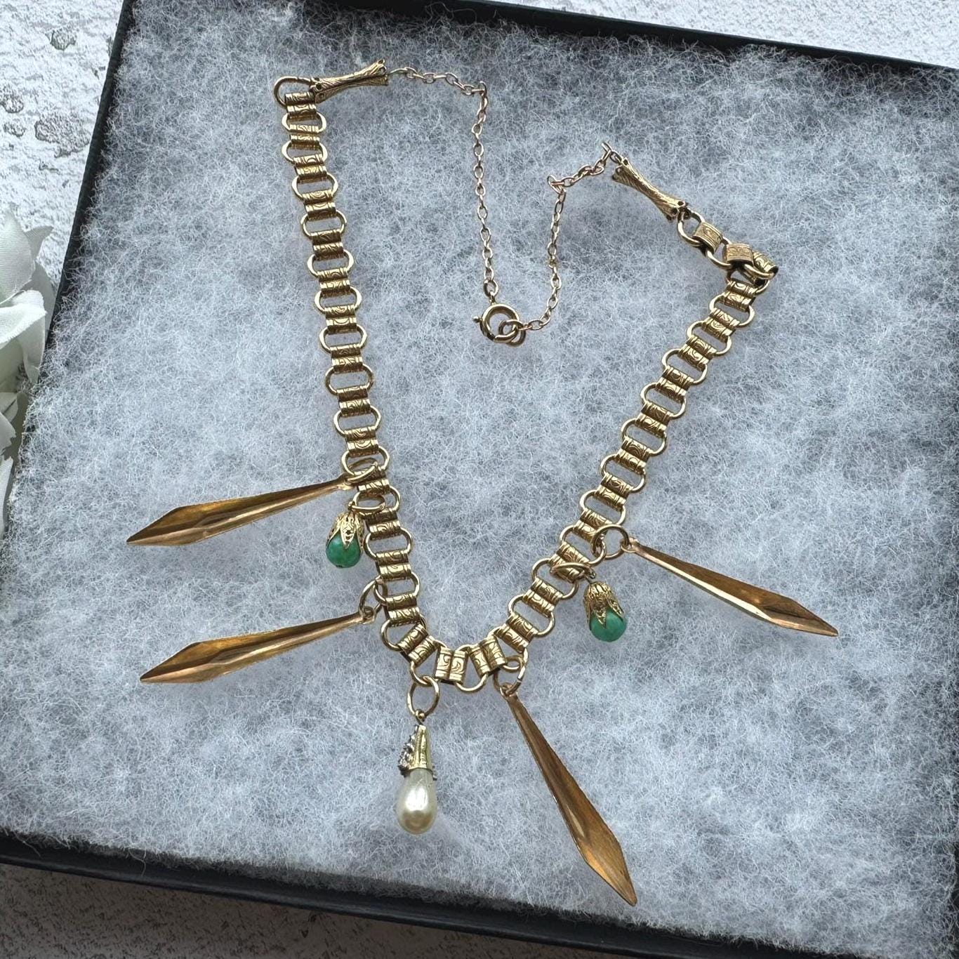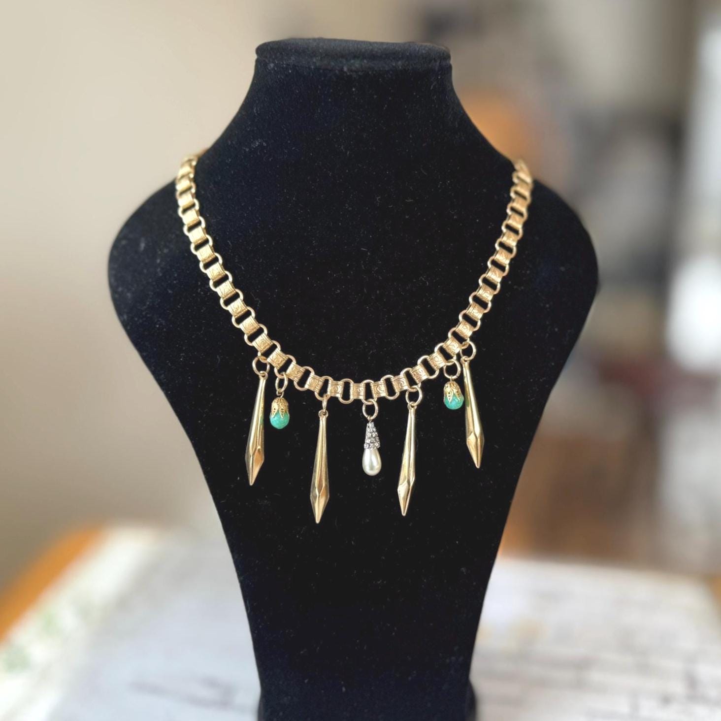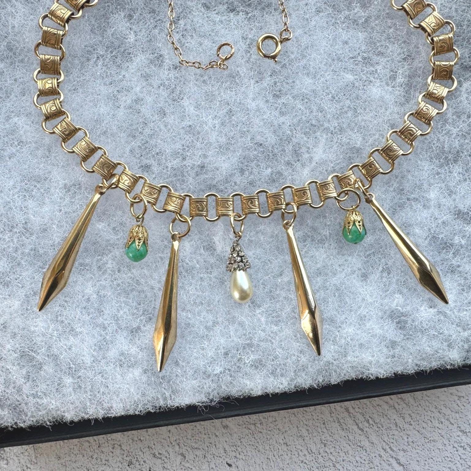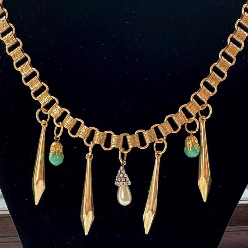Art Deco 18ct Rolled Gold Egyptian Revival Necklace: Antique Book Chain Bib Collar Necklace, Czech Peking Glass & Pearl Drops