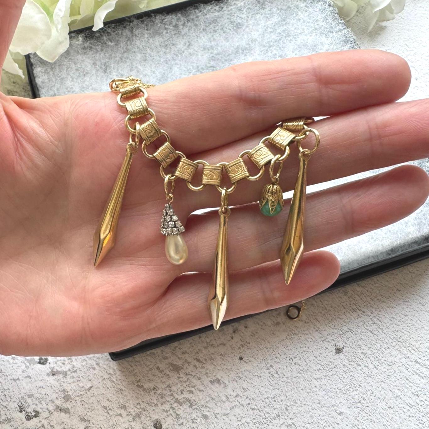 Circa 1920, a striking Art Deco bib necklace made in luxurious bright buttery 18ct rolled gold. Egyptian Revival in design the necklace is made up of bookchain links engraved in scroll detailing. The centre is embellished in four elongated kite-shaped gold drops and three Czech bead drops, two in green Peking glass and a central faux pearl set in clear crystals. The necklace is finished in a chain with a traditional spring ring fastener.