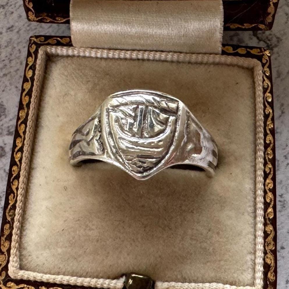 Although the maker’s mark is now partially worn with age, this wonderful antique sterling silver Celtic shield ring features a Viking longship motif that is unmistakably in the manner of respected Iona silversmith Alexander Ritchie of the Scottish Arts & Crafts movement.