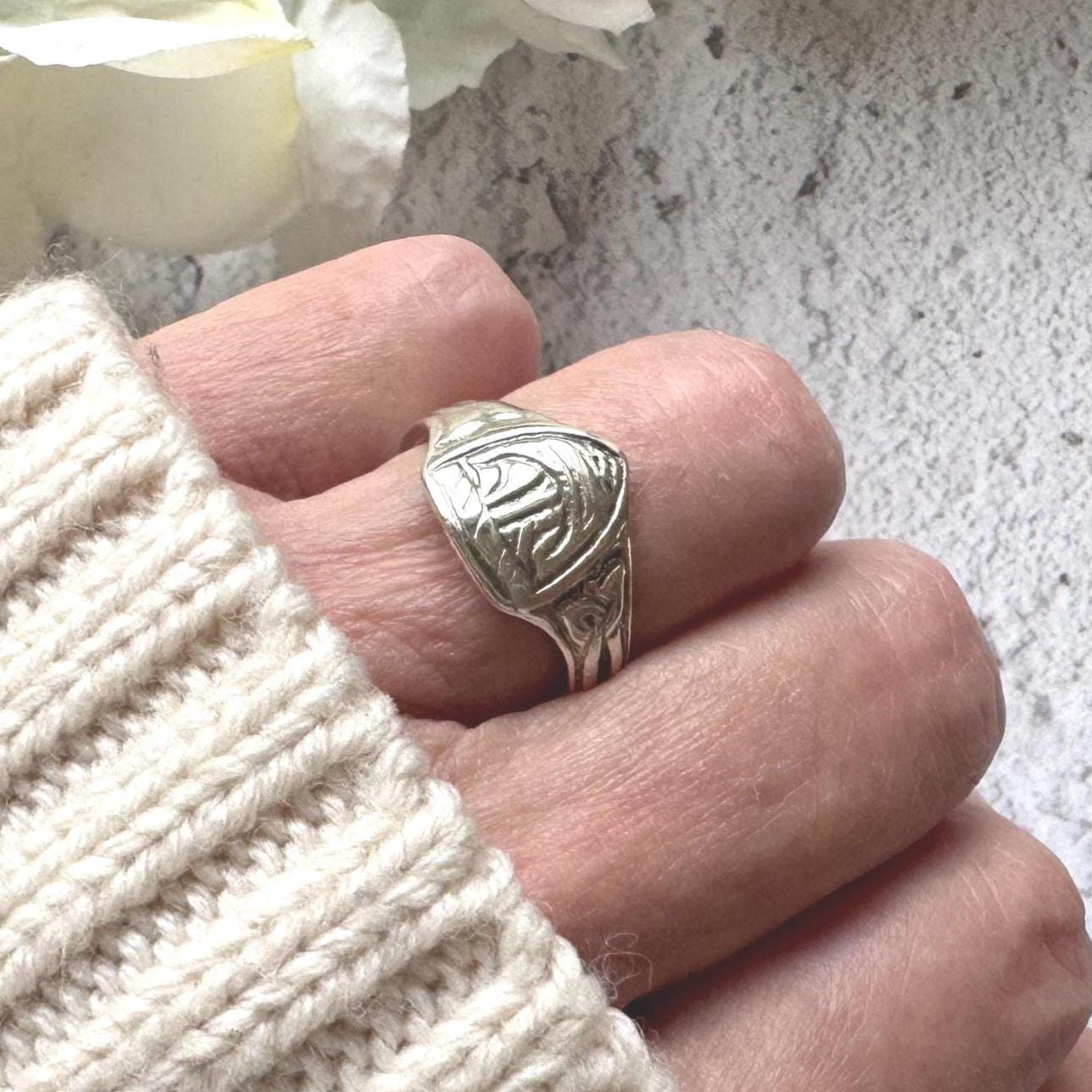A superb example of Scottish Arts & Crafts silver with genuine age and presence — highly collectible and a striking statement ring for lovers of Celtic, Viking, and Iona jewellery.