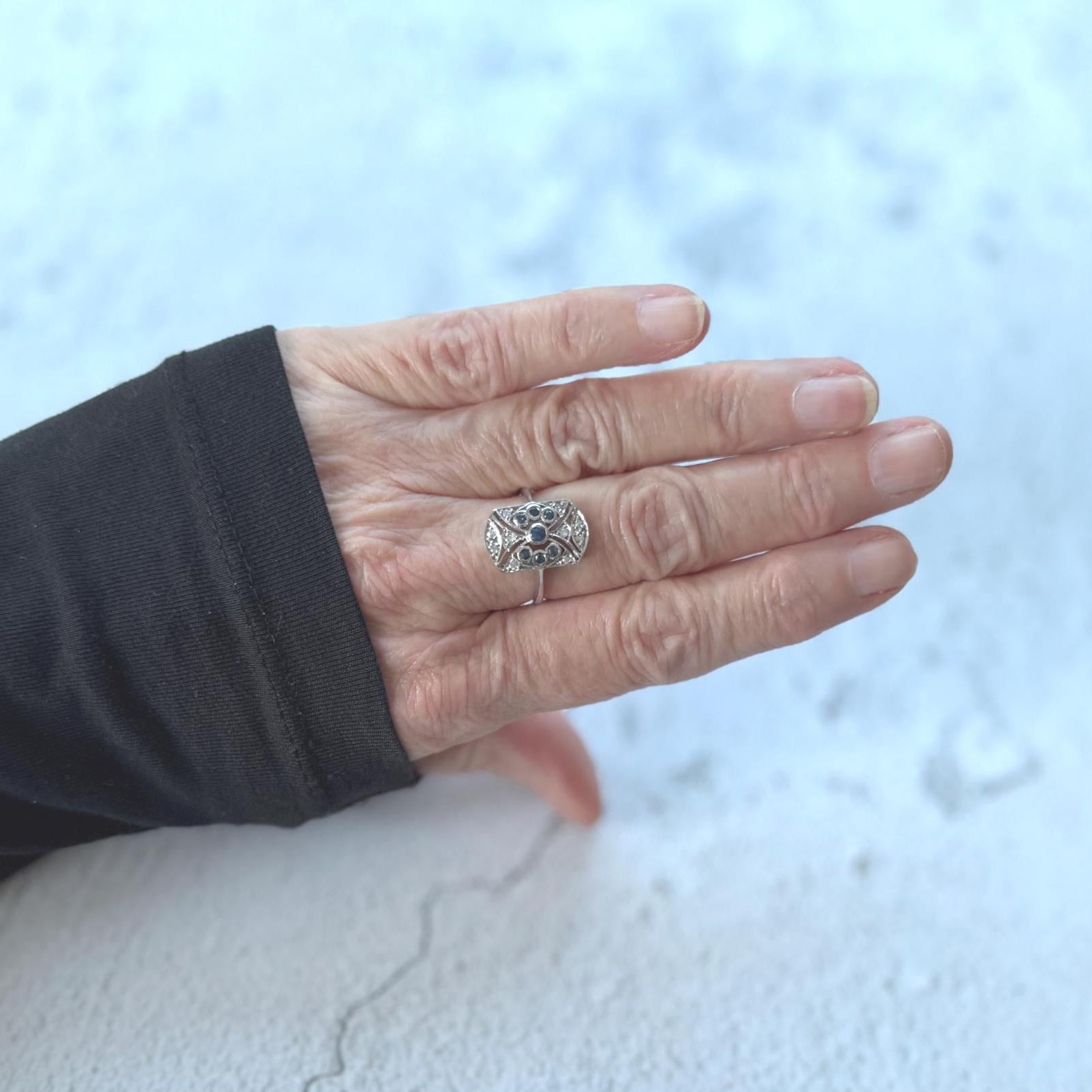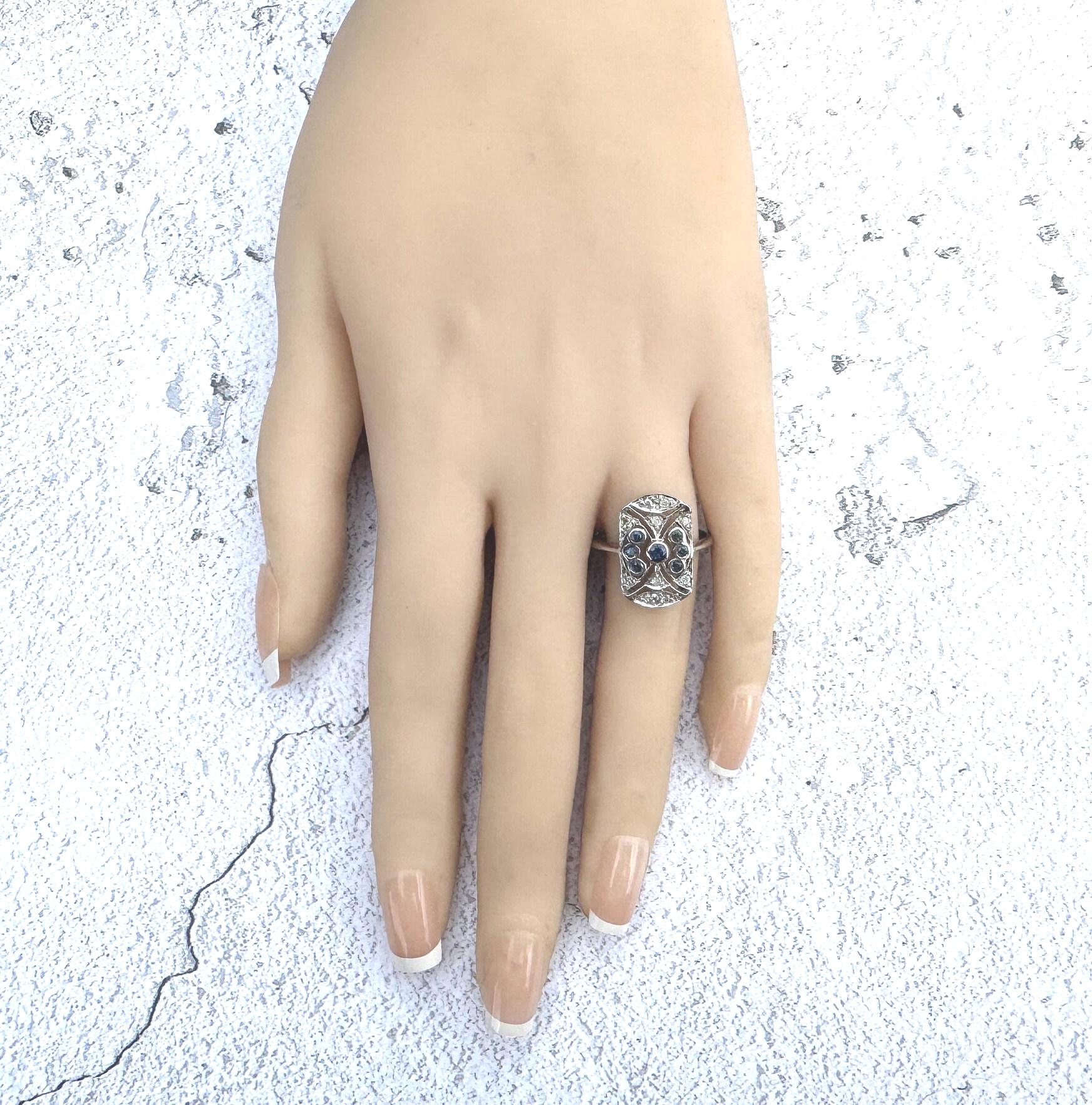 Circa 1920, and high quality ring features a striking architectural-inspired face, a bold tall rectangular column with elegant curves at the top and bottom it is carpeted in old cut diamonds that surround cornflower blue sapphires nestled in bezel cups. The face features fine milgrain details and curvy cut-out work, no design feature has been overlooked, the undergallery is just as beautifully crafted in an open work frame. To finish nipped shoulders and a slim band focus all your attention firmly on her iconic and undeniably chic visage!