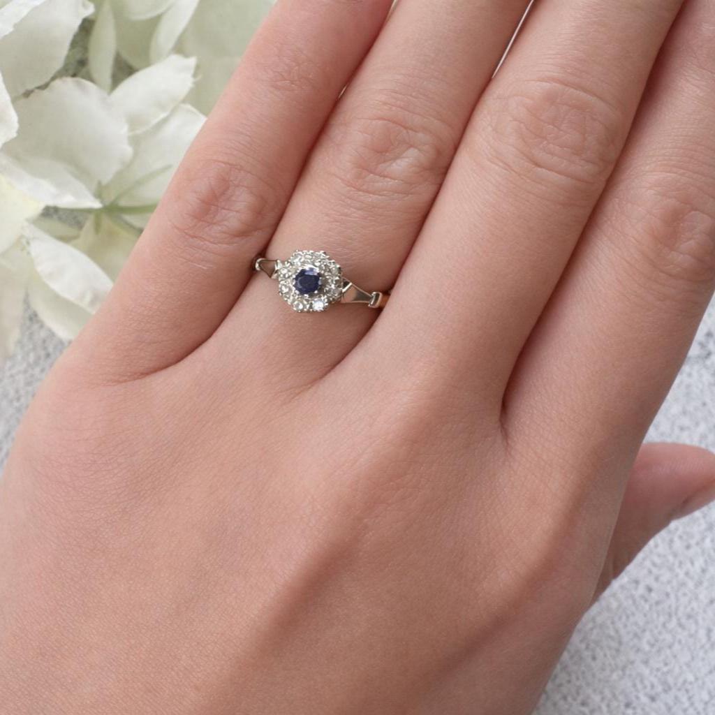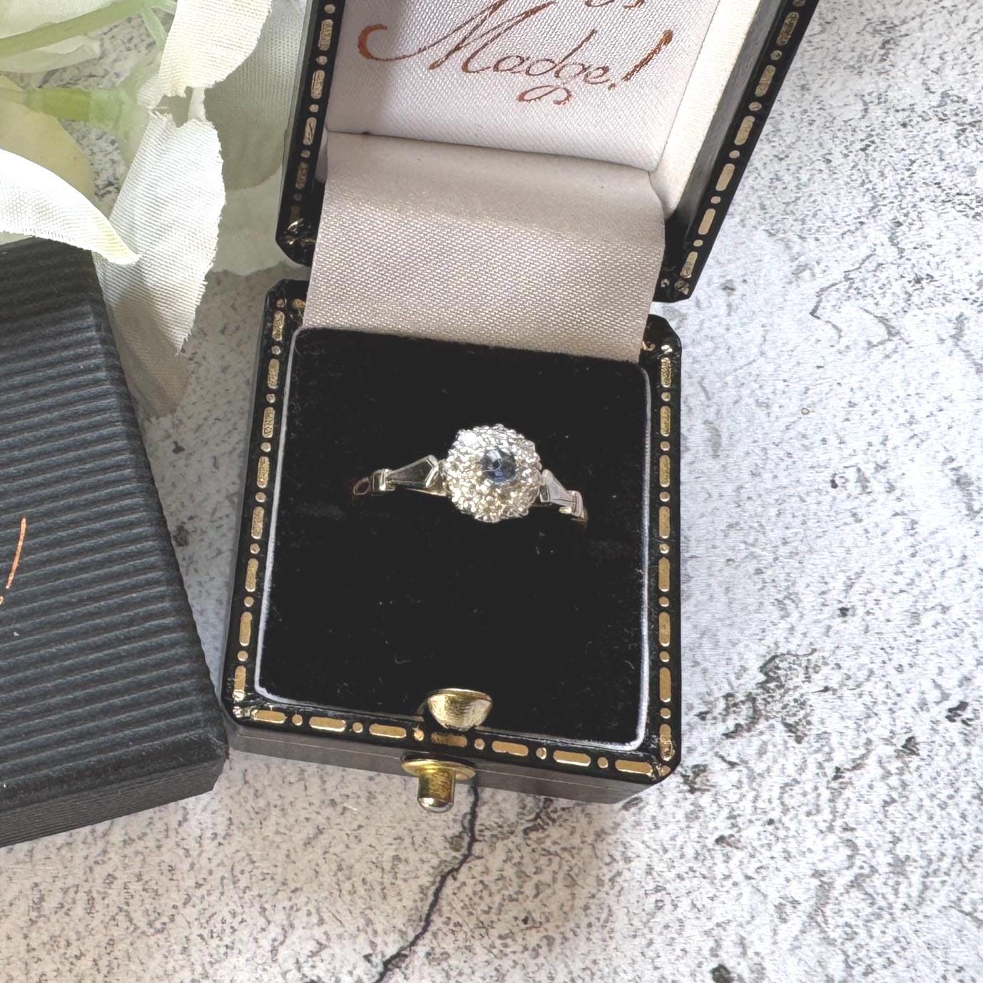 There is something so effortlessly romantic about an antique sapphire and diamond cluster ring — and this one is truly special.