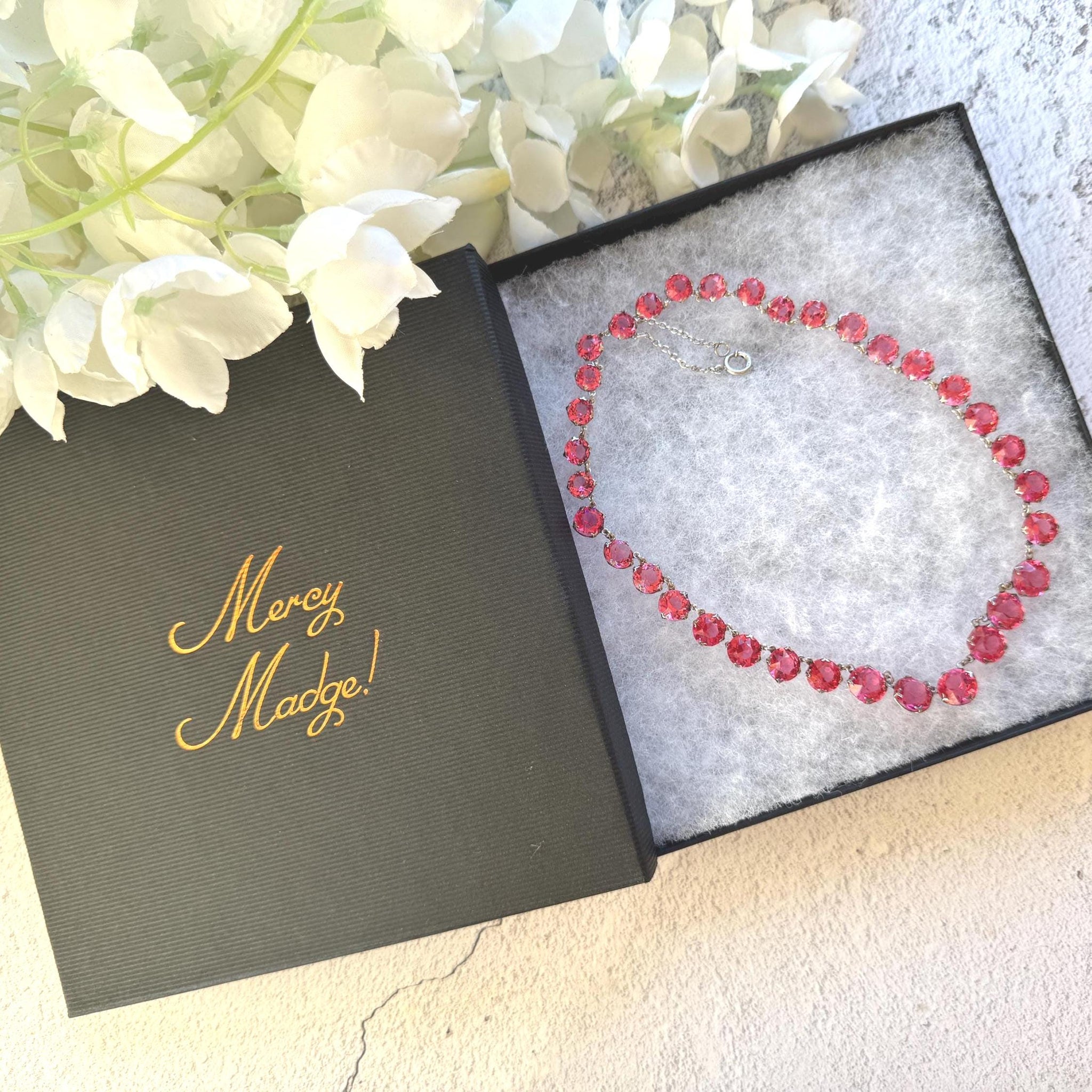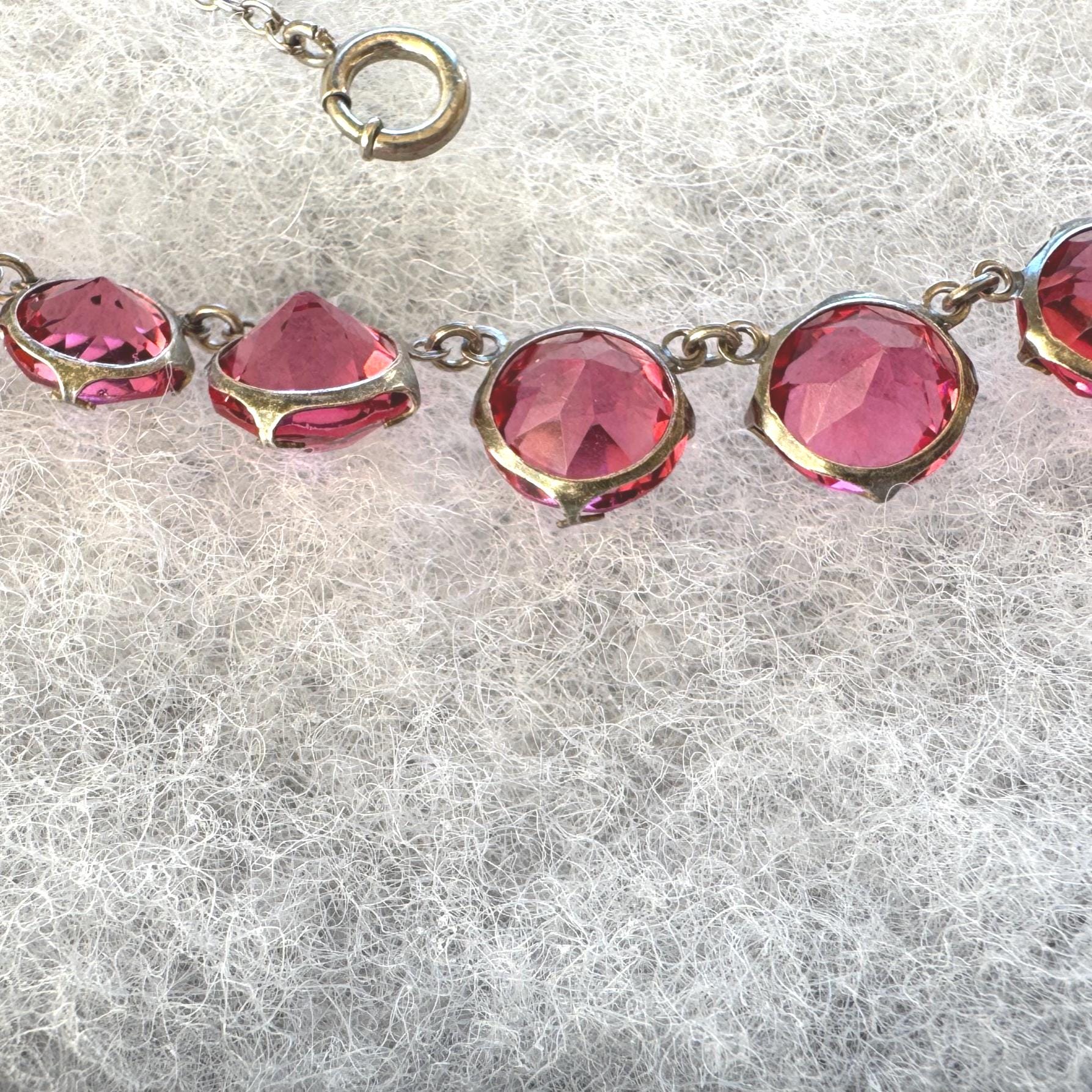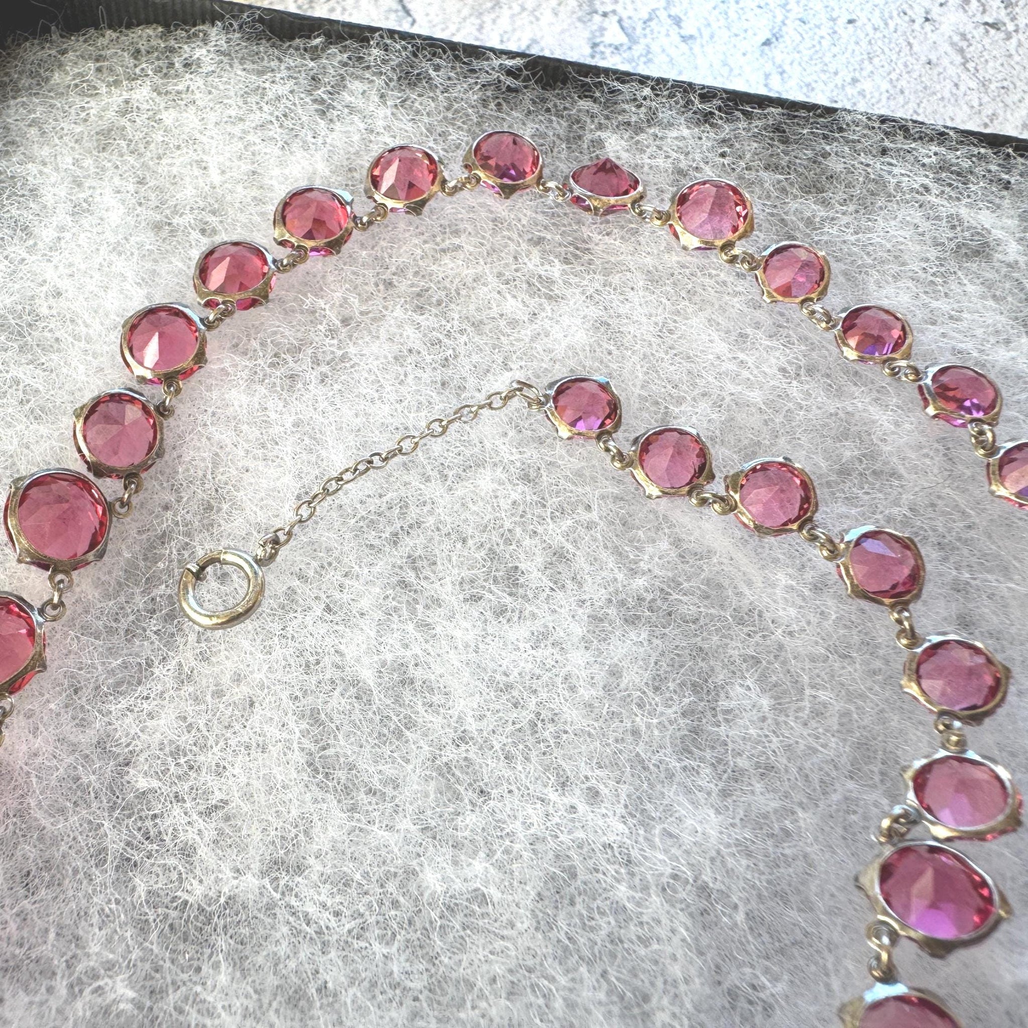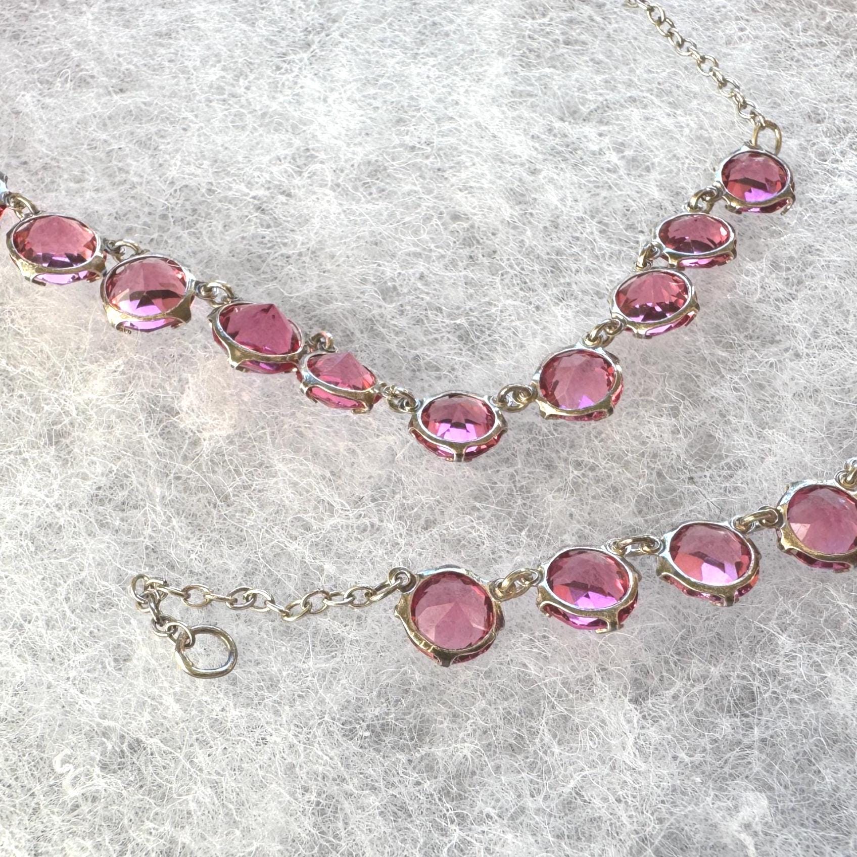Measuring 16½ inches (42cm) in true collar length, the necklace sits gracefully at the base of the throat, creating a flattering, light-catching line of colour. Along its length runs a procession of raspberry pink paste gemstones, beautifully faceted and gently graduating in size to achieve that coveted rivière flow. The high quality glass stones are open-backed to allow maximum light to flow through amplifying their brilliance and sparkle. The piece is completed with a silver chain extension and an early bolt ring clasp, opening via an integrated ring rather than a later spring-loaded lever — a charming and reassuringly authentic period detail.
