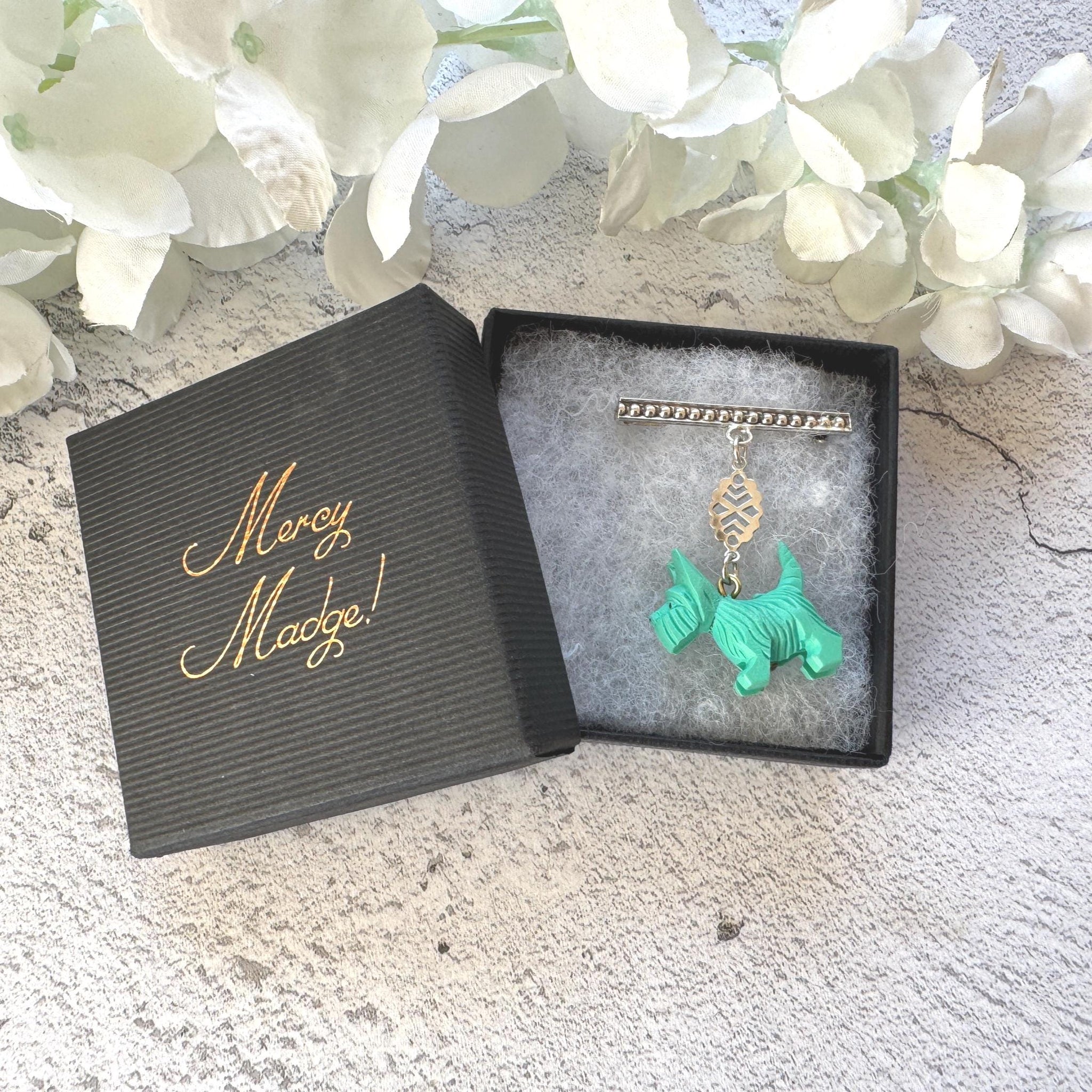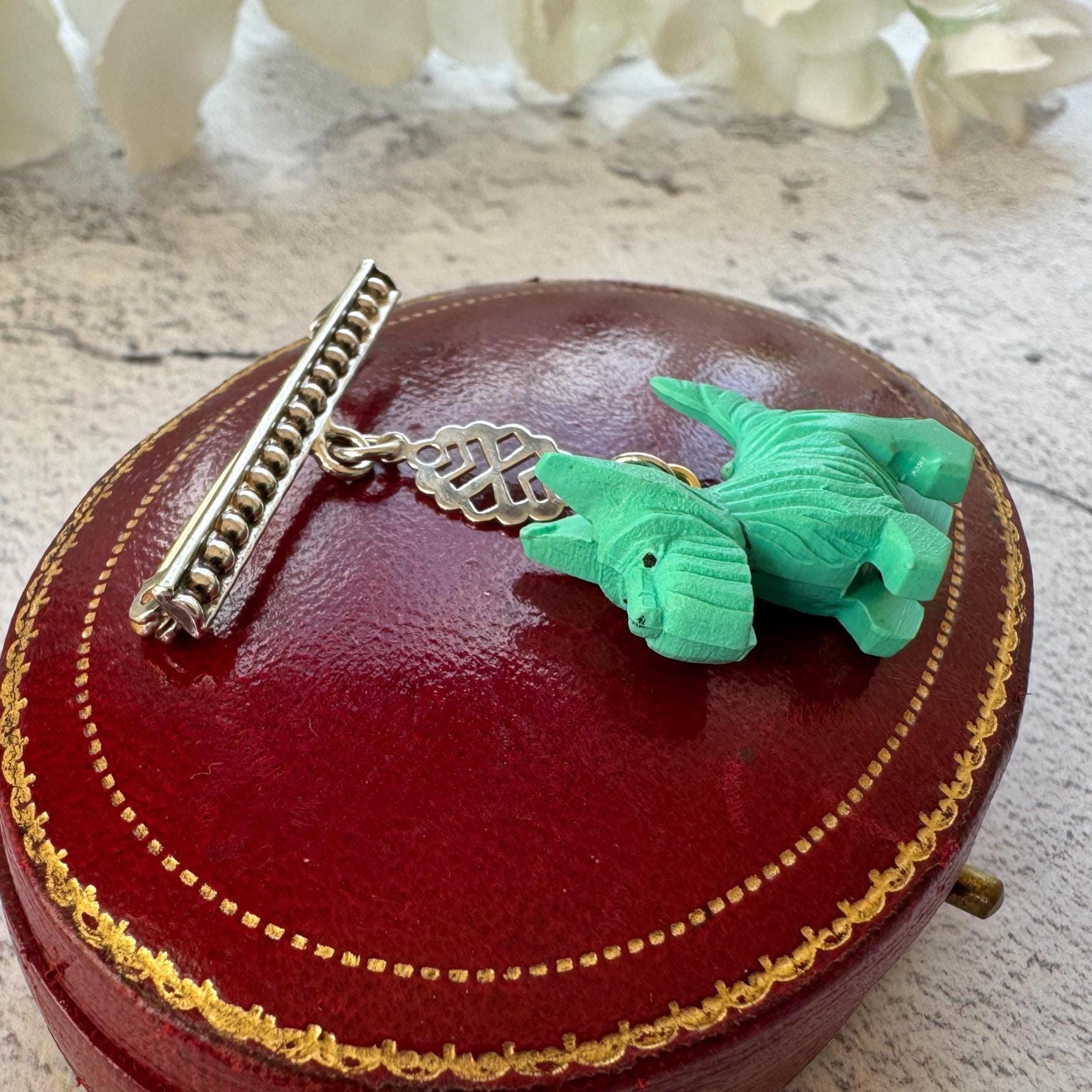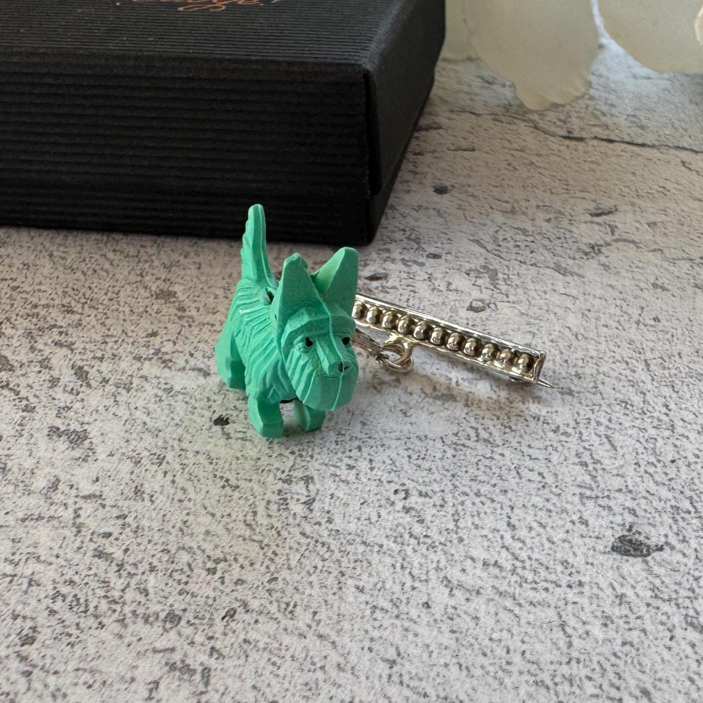 Attributed to Charles Horner of Halifax this absolutely adorable Art Deco era Scottie dog lapel pin is in fantastic condition, especially given age! Featuring a vibrant turquoise-blue Scottie dog made from celluloid (an early type of plastic) which, dangles from a sterling silver bar fitting this piece would have been the height of fashion in the 1920's.