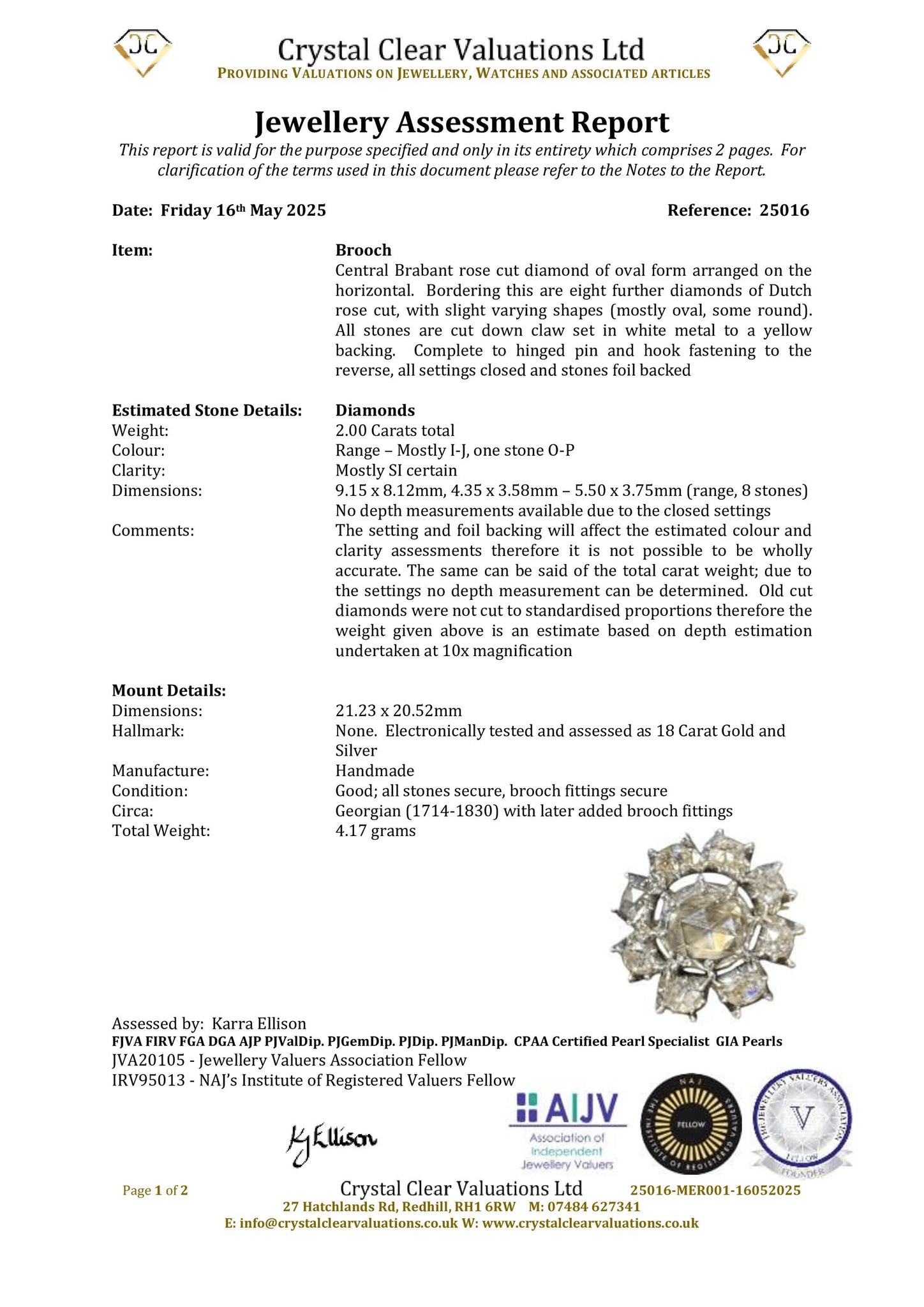 An exquisite antique 18ct gold brooch showcasing nine stunning natural earth-mined rose cut Georgian diamonds arranged in a daisy cluster. The central 'Brabant' cut diamond is of oval form arranged on the horizontal. Bordering this are eight further 'Dutch' cut diamonds with slight varying shapes (mostly oval, some round). The Brabant (also known as Antwerp) cut and Dutch cut are the oldest forms of rose cuts and they were very popular in the 17th century.