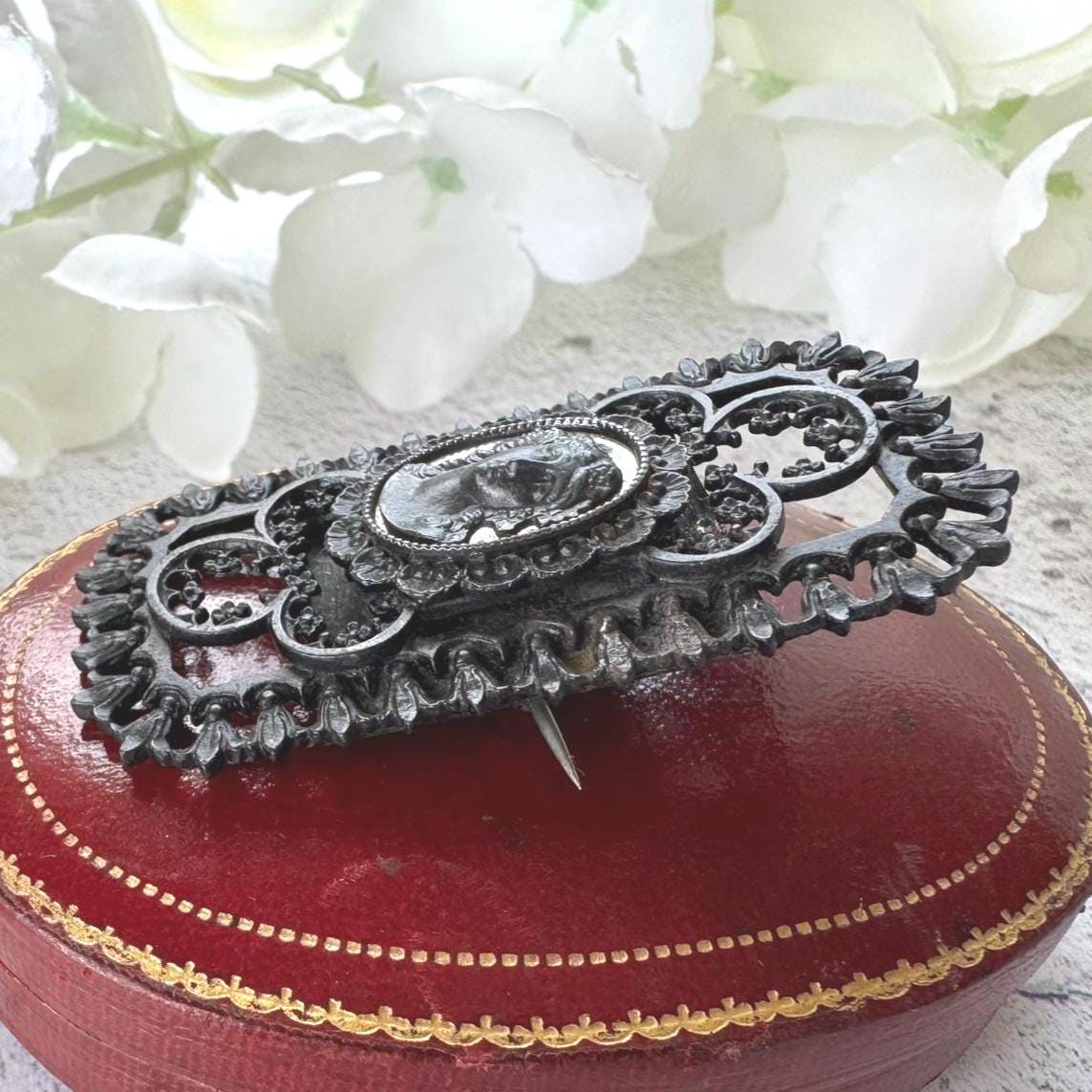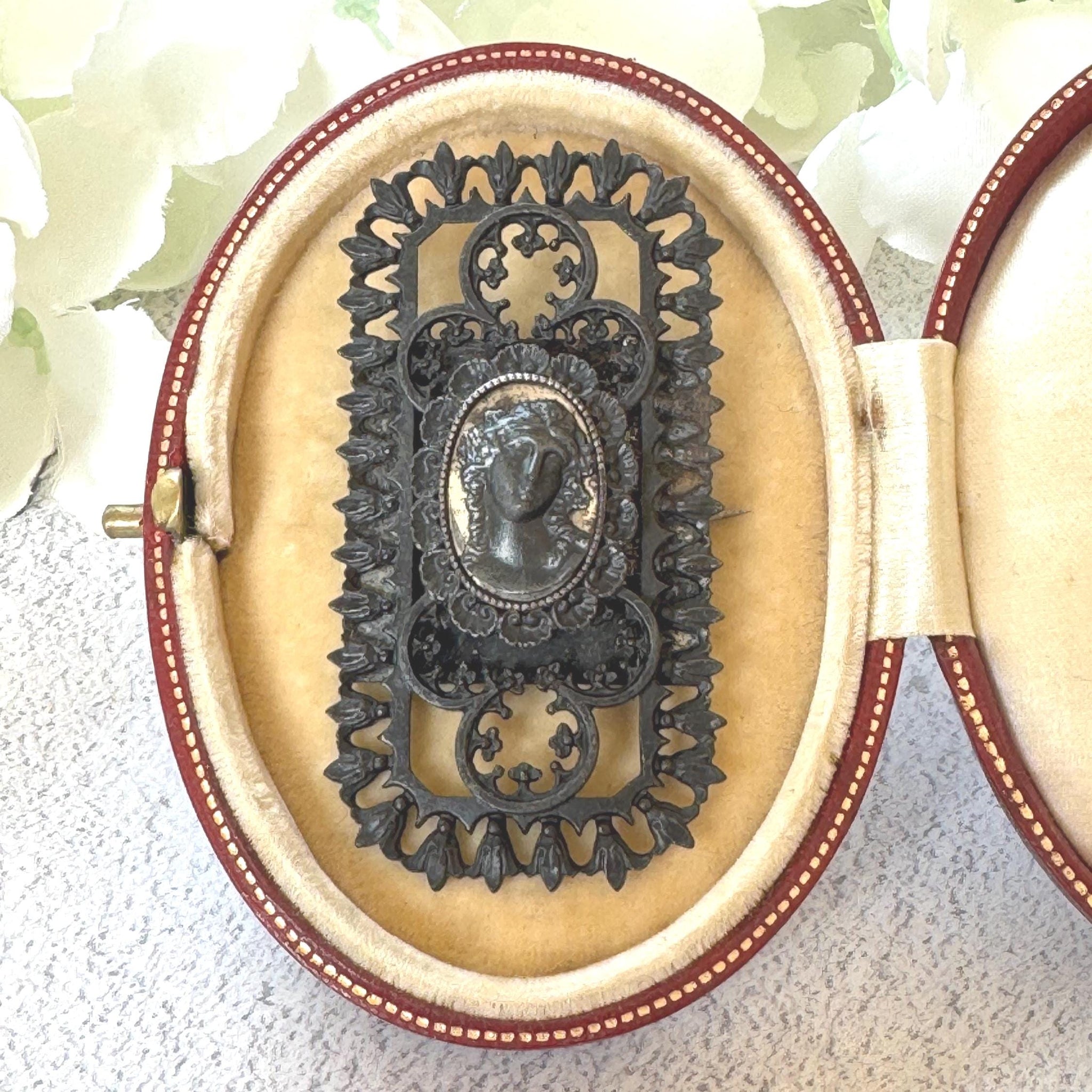 Circa 1790, an authentic and extremely rare Berlin ironwork brooch. The brooch is a spectacular size and cast in a openwork neo-classical design which is characteristic of early pieces. The centre of the brooch is set in a female cameo bust against a mirrored polished steel oval plaque. The reverse has a sturdy curved pin stem with a T-hinge and C-clasp.