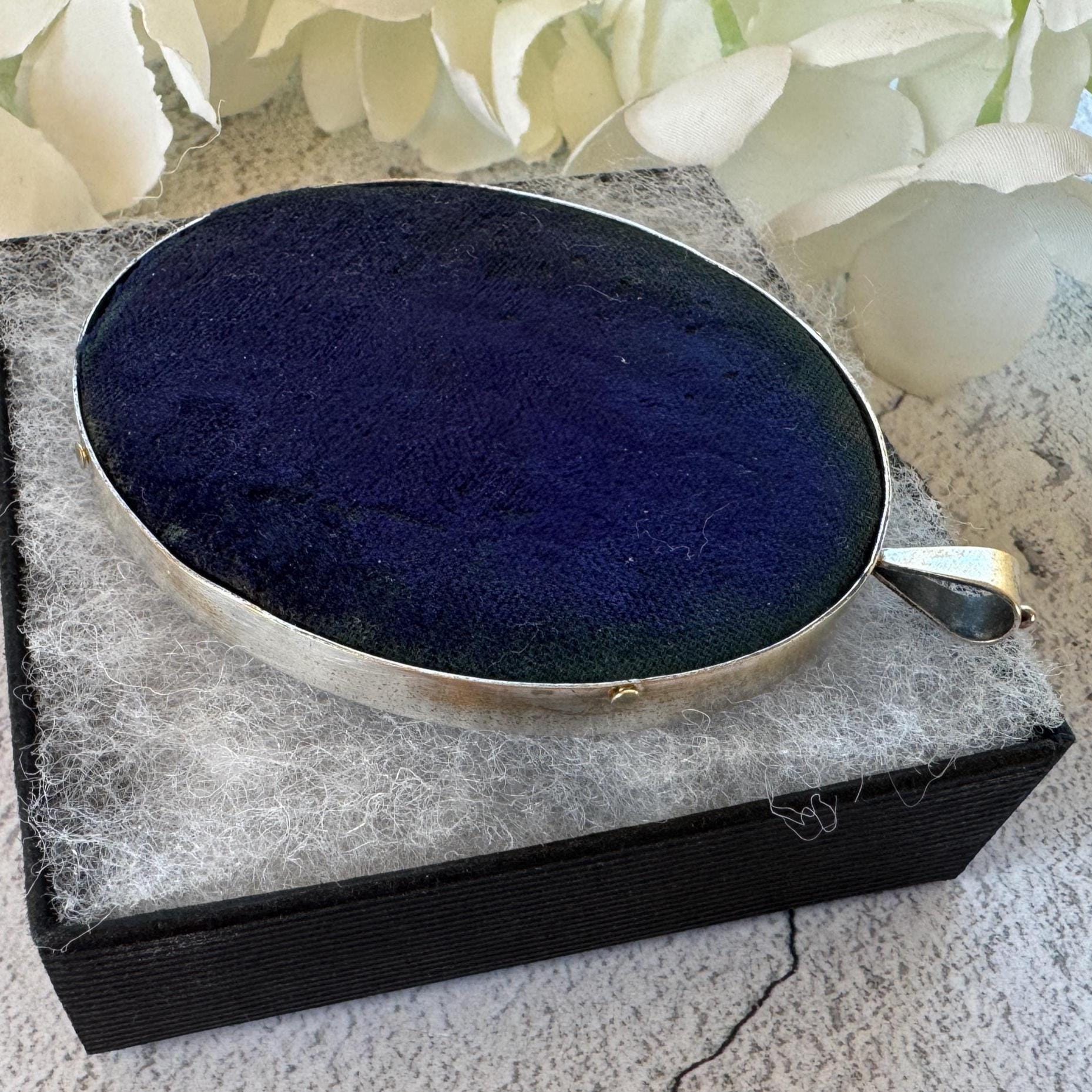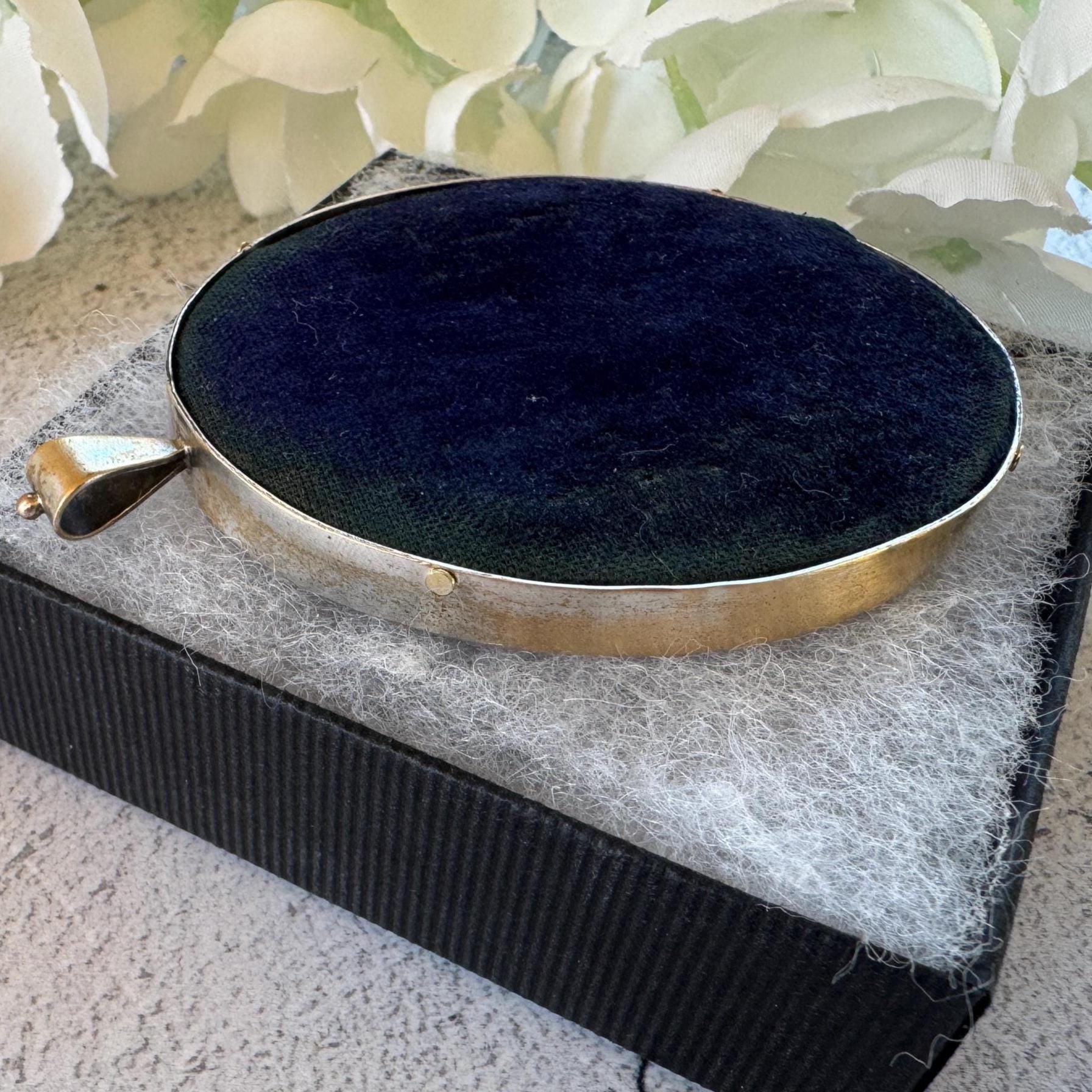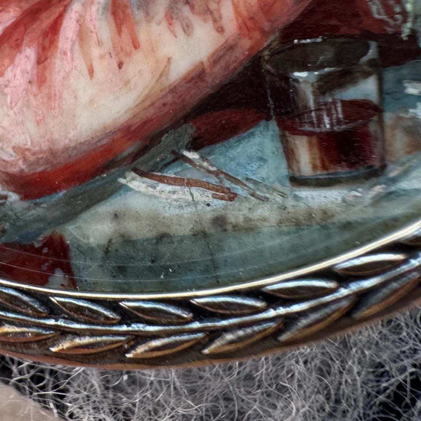 The painting is set behind hand-blown sheet glass (so its slightly irregular and dimpled) in a gilt metal pendant frame with a laurel wreath border. The frame was originally gilded in gold which has mostly worn away to a silvery colour with remnants of the gold finish remaining. The reverse of the pendant is backed in royal-blue velvet.