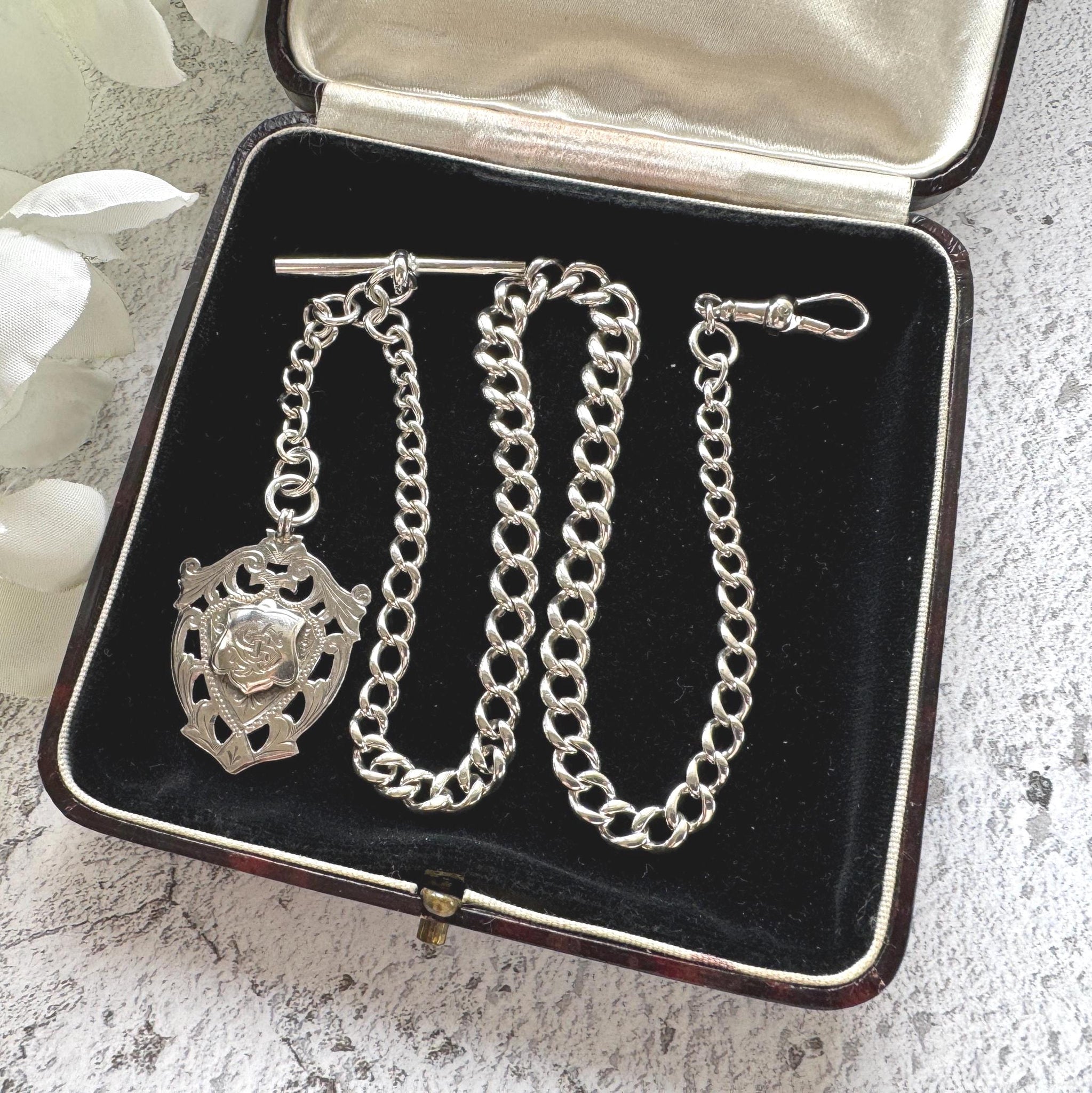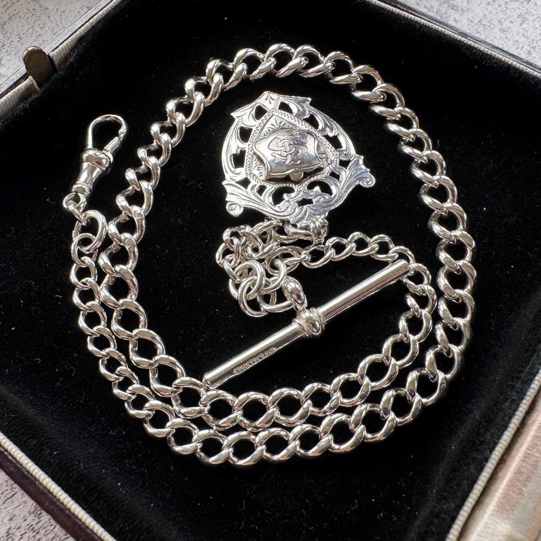 A versatile piece it can be worn with a pocket watch, as originally intended, or as a unique chunky chain necklace or bracelet. It features solid silver curb links that graduate in size and it has the requisite T-bar, dog-clip and a beautifully decorative open work fob with floral engraving and a pillowed shield shaped cartouche engraved in the monogram of the original owner 'SIC'.