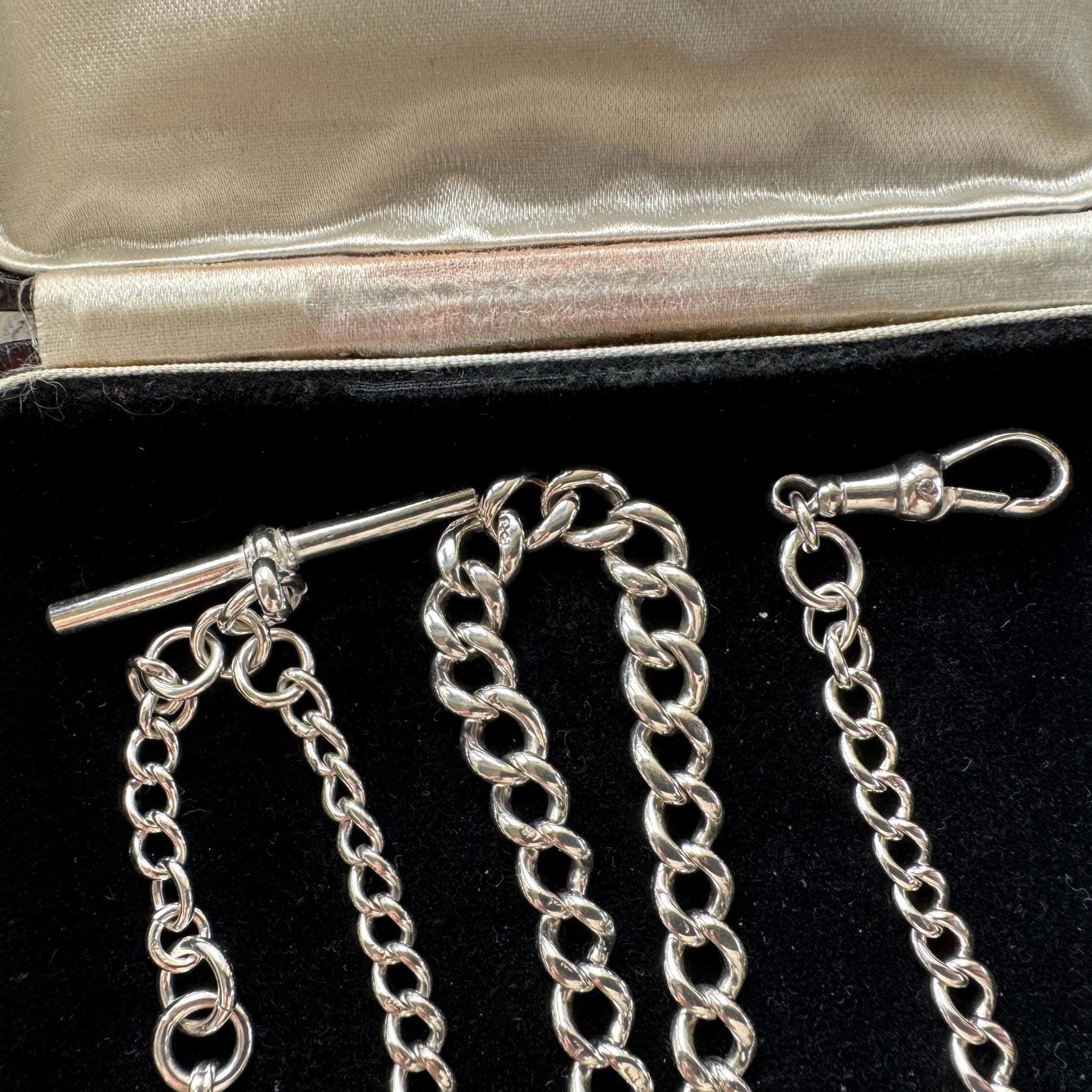 Elegantly proportioned this refined antique Art Deco era sterling silver watch chain is a classic "Albert" curb chain and is stamped with the British 'lion passant' for sterling throughout the links, always a sign of a quality chain.