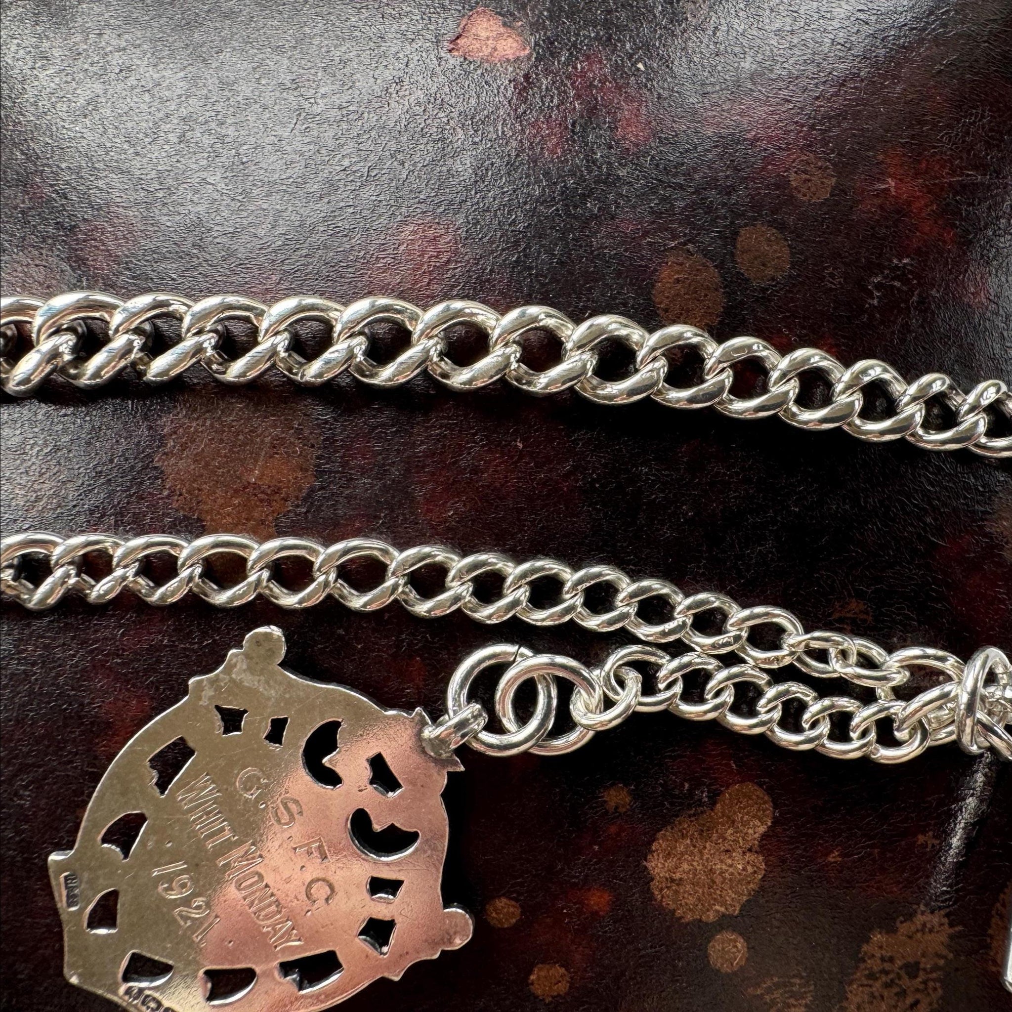 HALLMARKS: stamped in worn 'lion passant' for sterling on most curb links. T-bar stamped 'STERLING' Dog-clip stamped worn lion passant, date letter & makers mark. Fob stamped 'lion passant', 'anchor' for Birmingham, date letter 'V' for 1920 and makers mark ' HB&S' for Herbert Bushell & Son Ltd. The fob is also engraved "GSFC - WHIT MONDAY - 1921". We think "GSFC" is an abbreviation of an English football club.