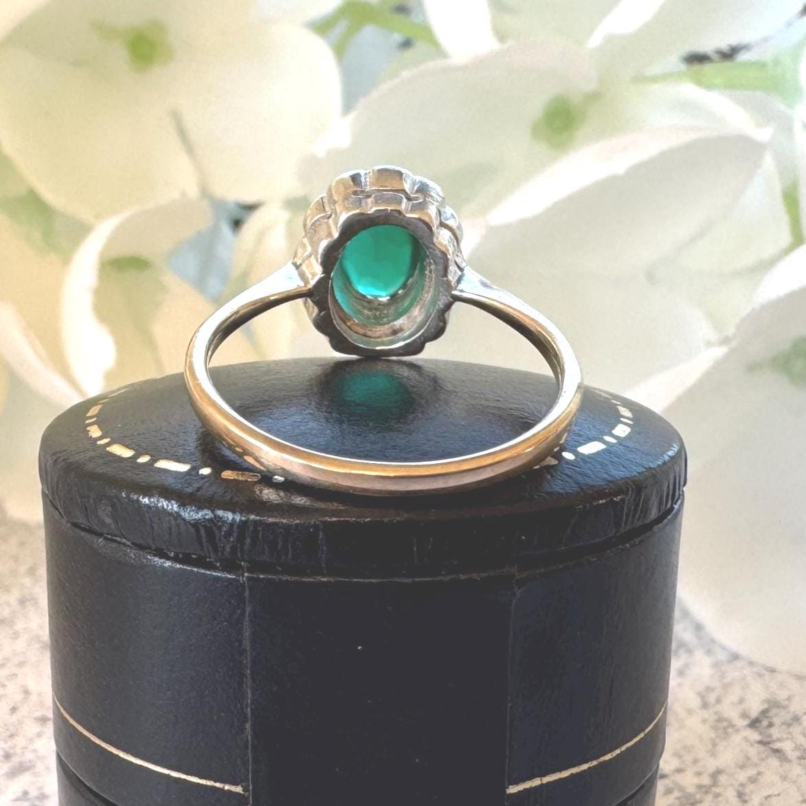 Antique Victorian 9ct Gold Emerald Green & White Paste Diamond Cluster Ring