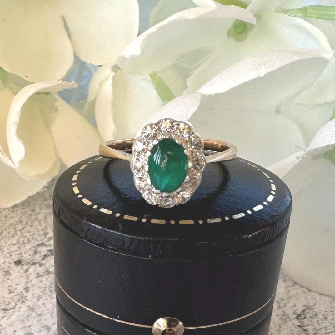 An exceeding pretty and feminine antique 9ct gold emerald green and white paste cluster ring hailing from the Victorian era.