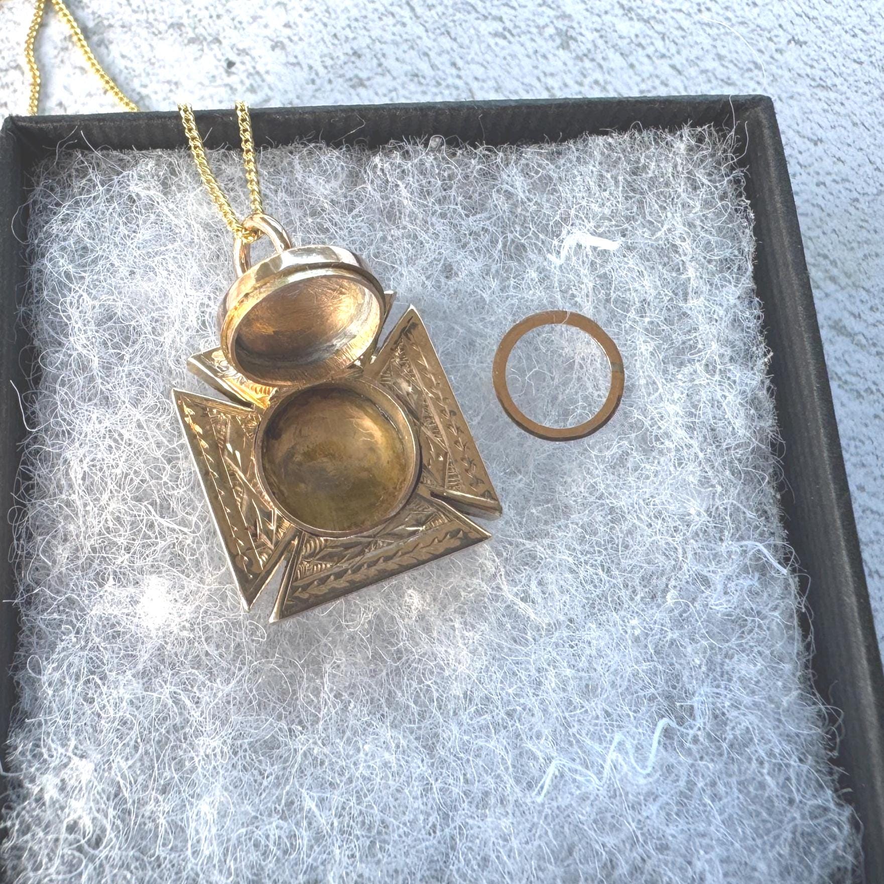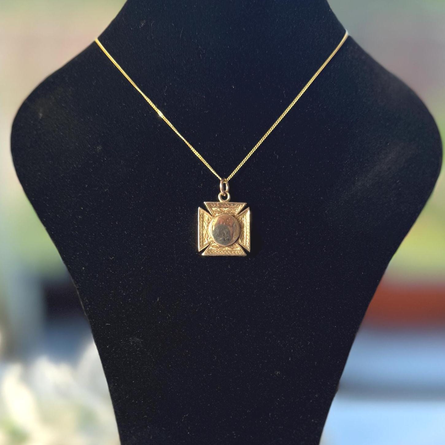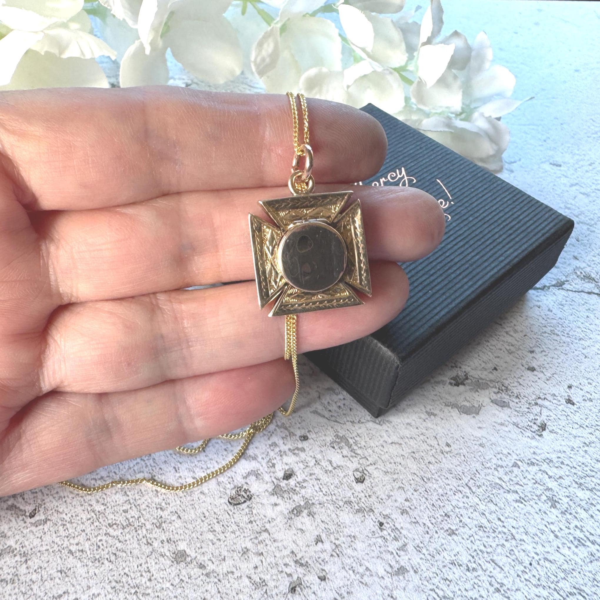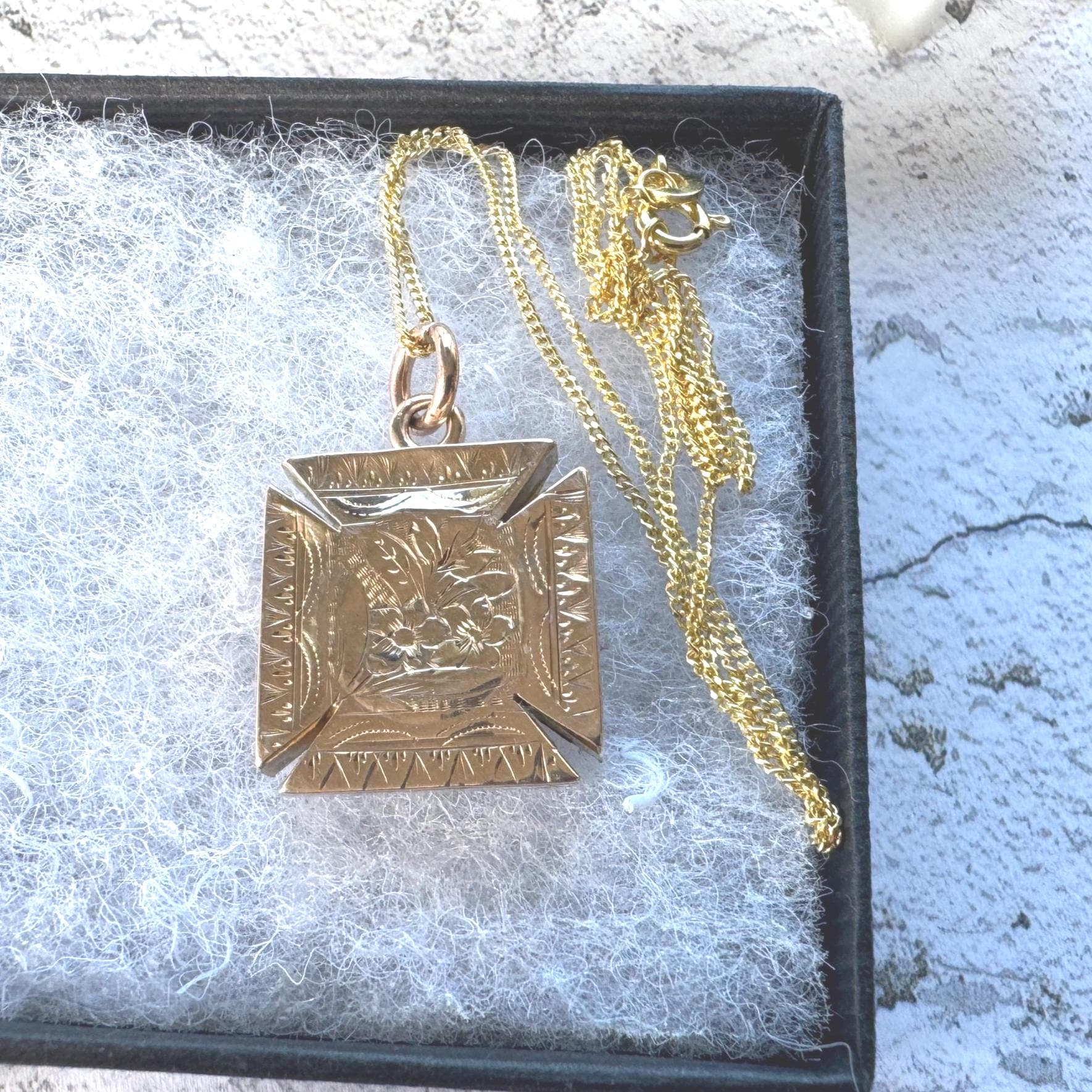 Hallmarked for 1889 this enchanting antique 9ct gold pendant is a substantial piece fashioned in the form of a Maltese cross. One side is finely engraved in a floral pattern with forget-me-not flowers, the other side is engraved in ivy and boasts a clever hidden locket compartment, perfect for storing cherished memories or treasured keepsakes. You might even place a tiny photo inside, the original gold picture ring is still present. You can wear this piece with either side facing for a completely different look, two antique pendants in one!
