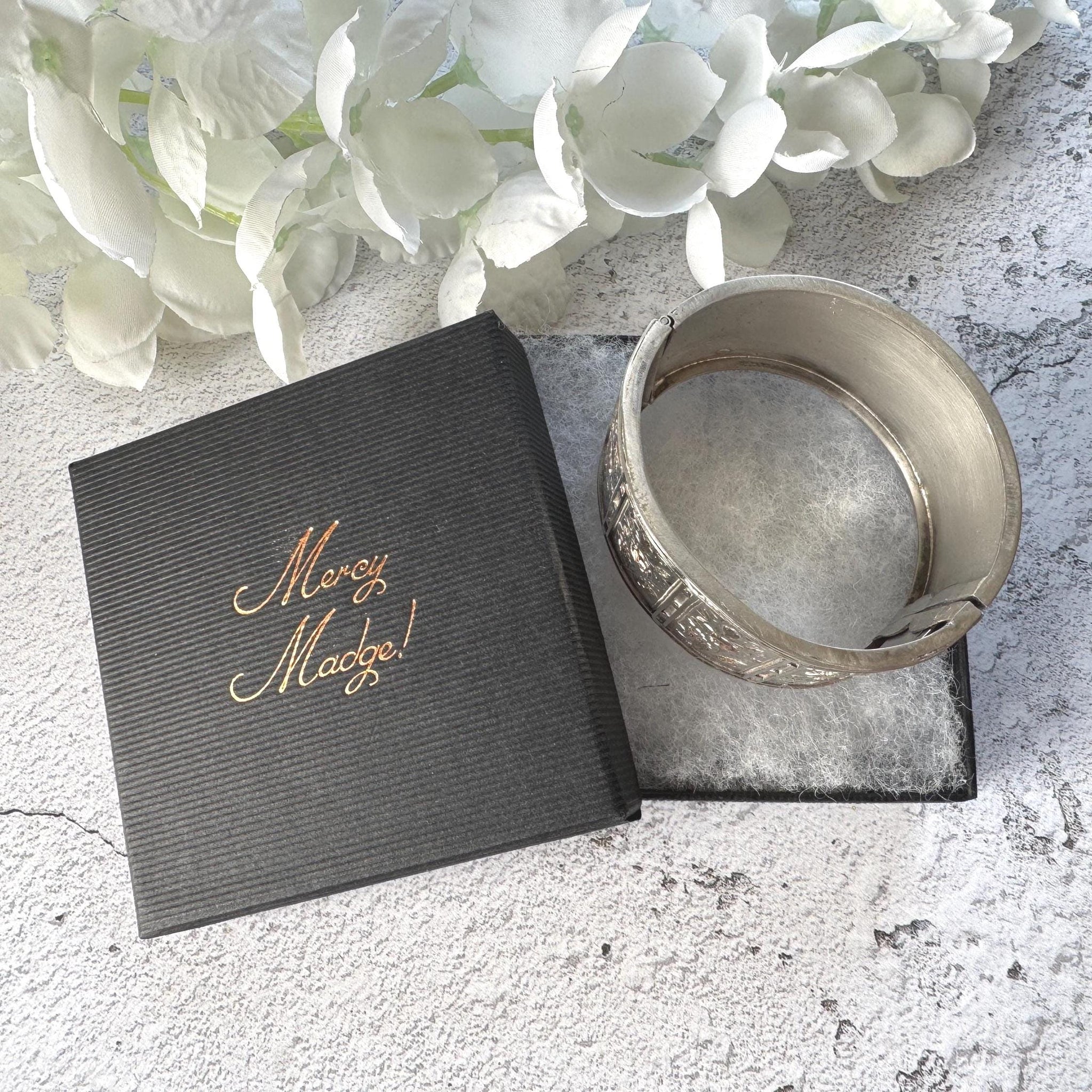 MEASUREMENTS: 1-1/4" wide (3.4cm), inner circumference 7-1/4" (18.5cm), inner diameter 2-1/4" (5.6cm) hinge to clasp, 2" (5cm) front to back .