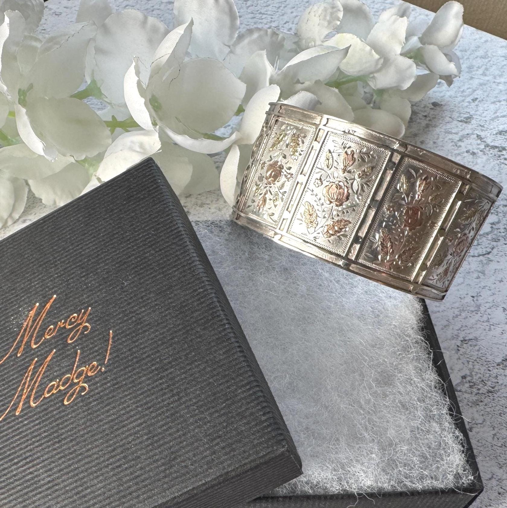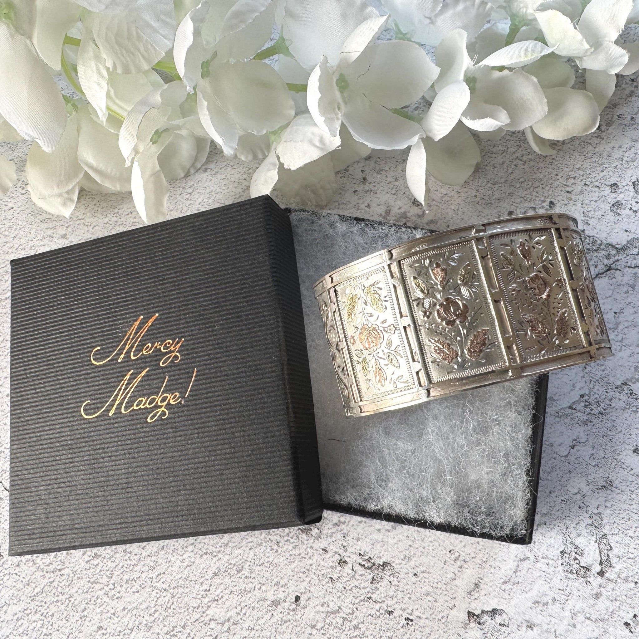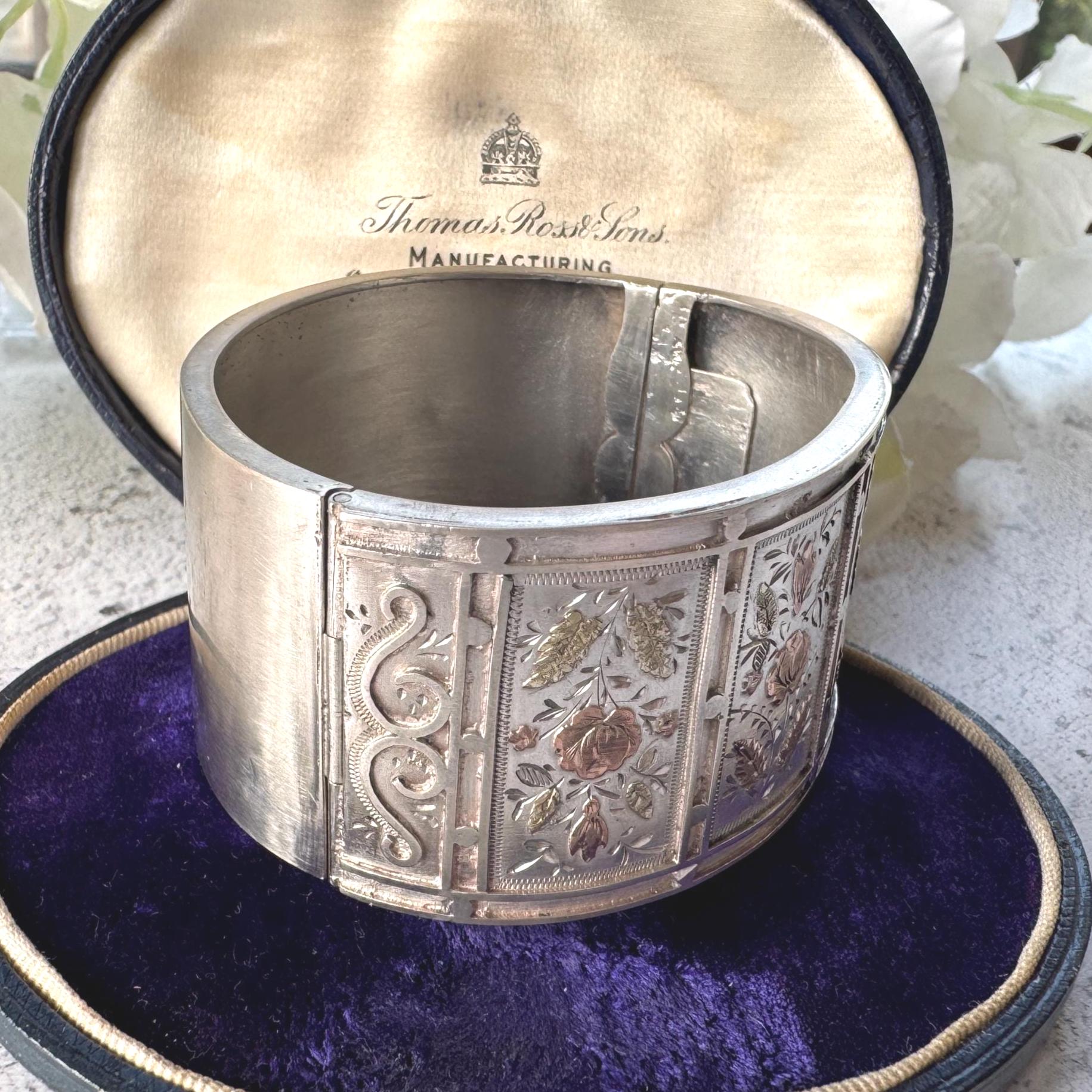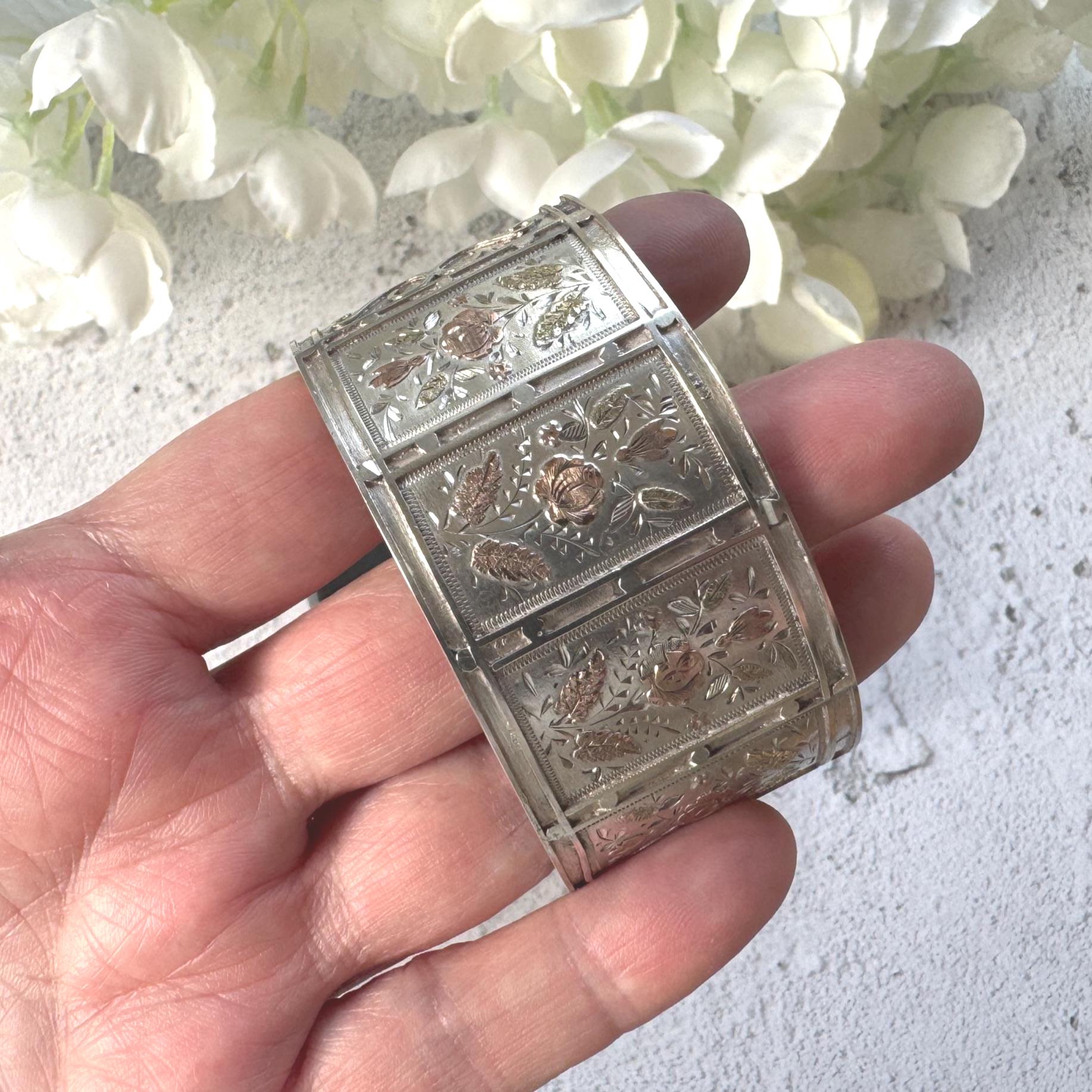 This beautiful antique Victorian bangle is lovely and wide and super quality. Made in heavy gauge sterling silver the front is etched and engraved in a beautiful floral design with roses and leaves picked out in applied rose and yellow 9ct gold. Raised silver columns and scroll motifs frame the floral panels adding dimension and extra interest.
