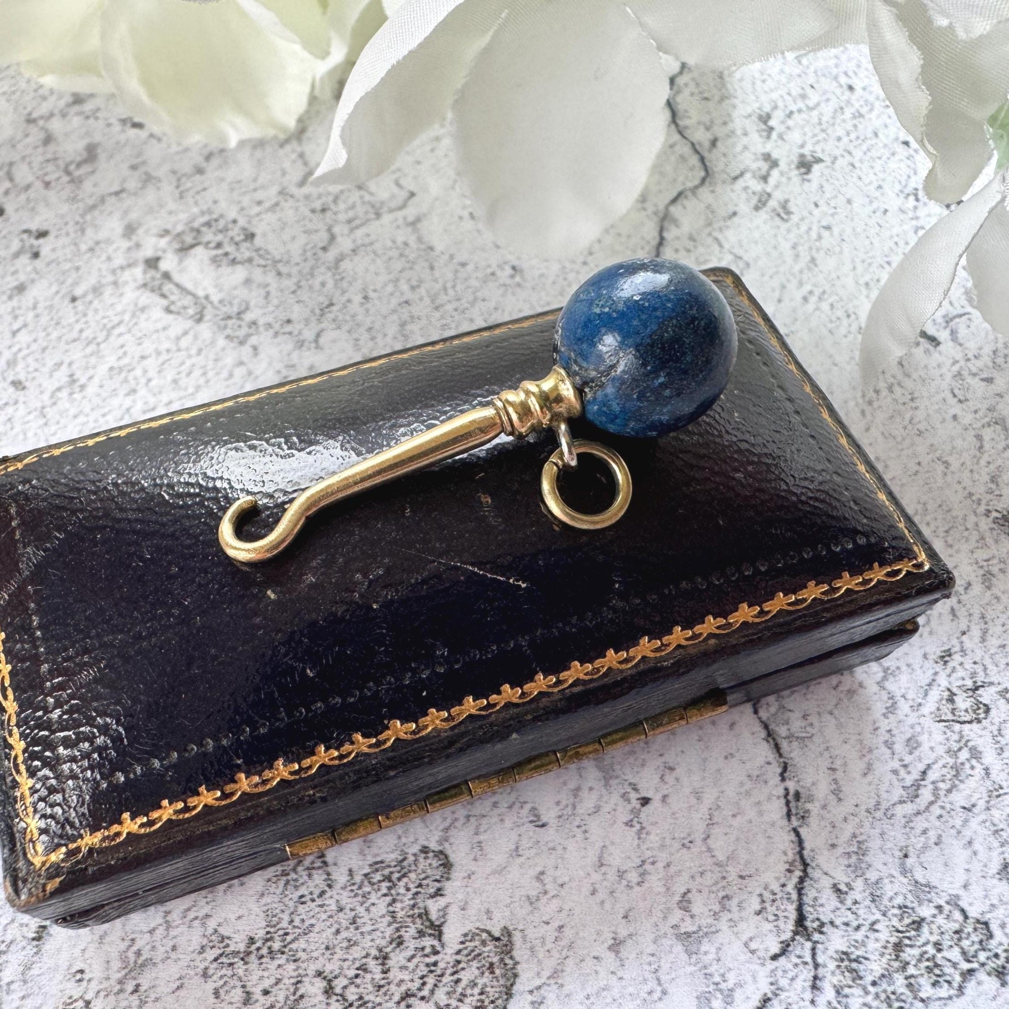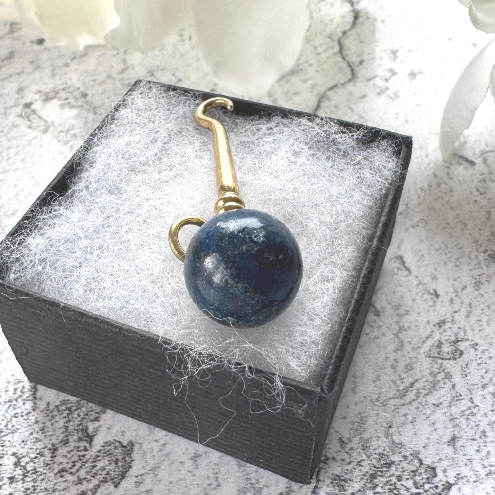 A whimsical Victorian novelty this miniature glove button hook is set at the top in an orb of natural deep blue lapis lazuli. Chic and versatile it has a hanging loop so you can wear it as a one of a kind pendant that's sure to catch the eye or add it to a chunky charm bracelet for a super fun look!