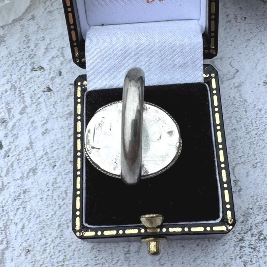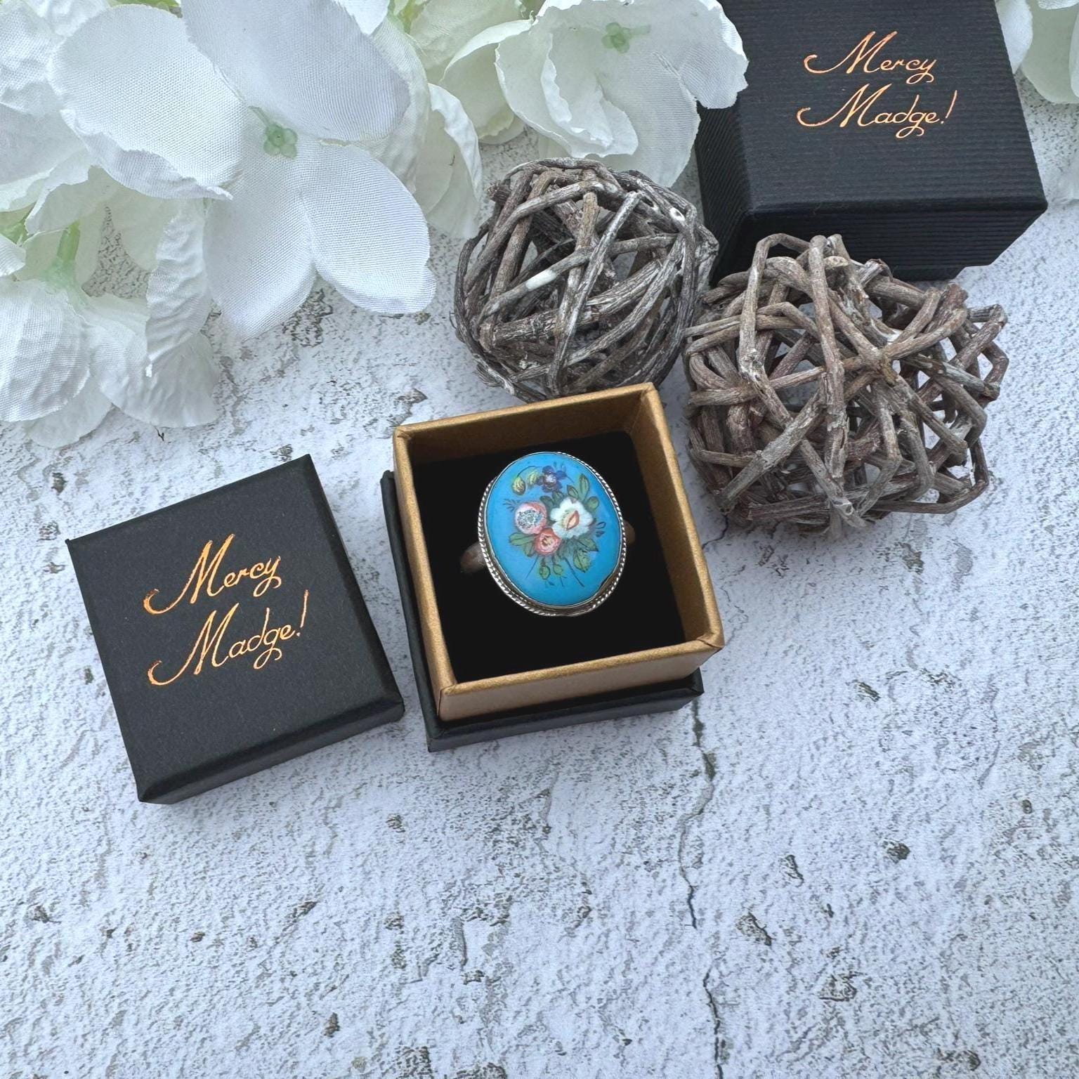 Crafted in sterling silver the ring has a substantial d-shaped band and a large chubby oval porcelain face, statement sized she provides fantastic finger coverage!