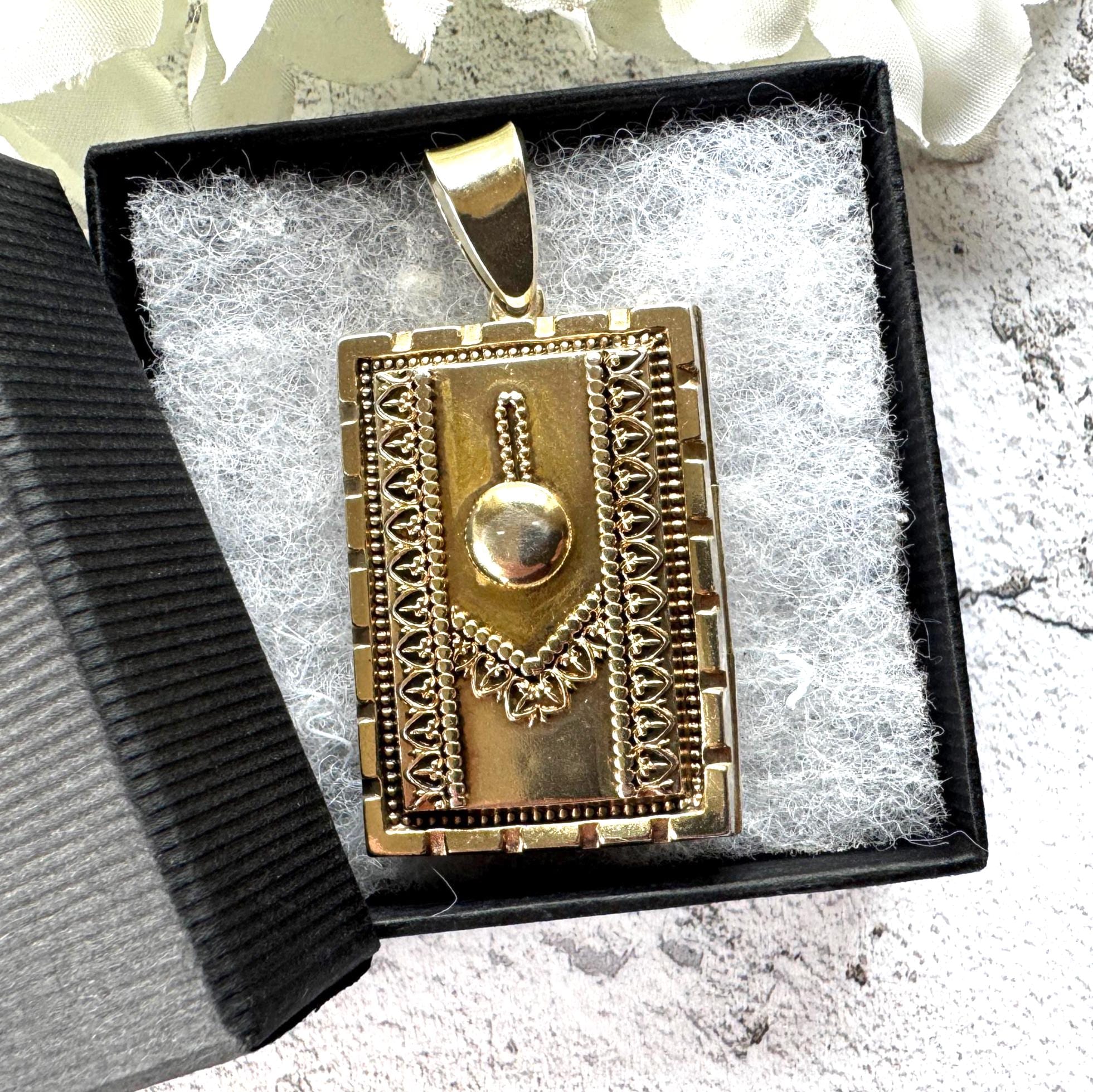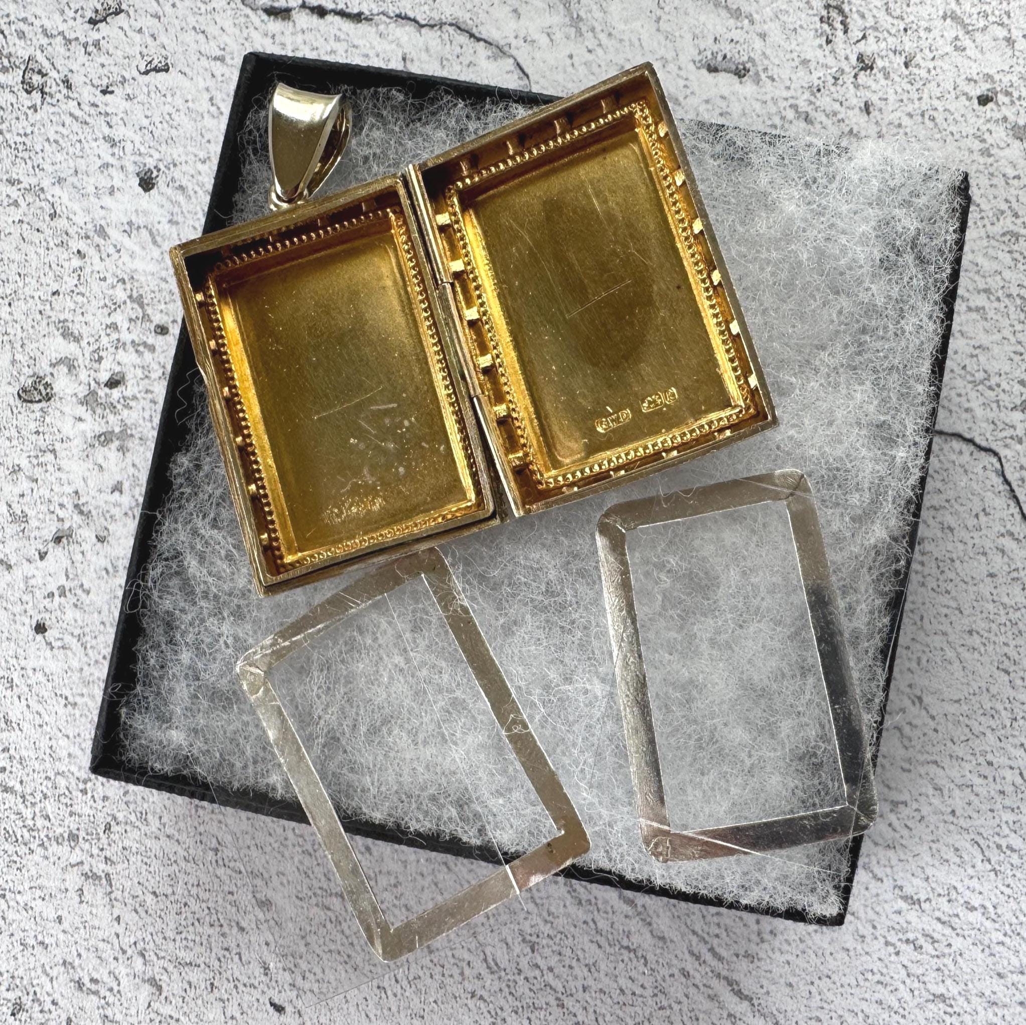 A quality piece crafted in heavy gauge silver the interior is gilded in bright yellow gold with the exterior gilded in a paler gold. The locket is exquisitely decorated in ornate detailing and it benefits from a large V-shaped bale ready to pair with a silver or gold chain that matches her stature and character. Note the chain shown is not included.
