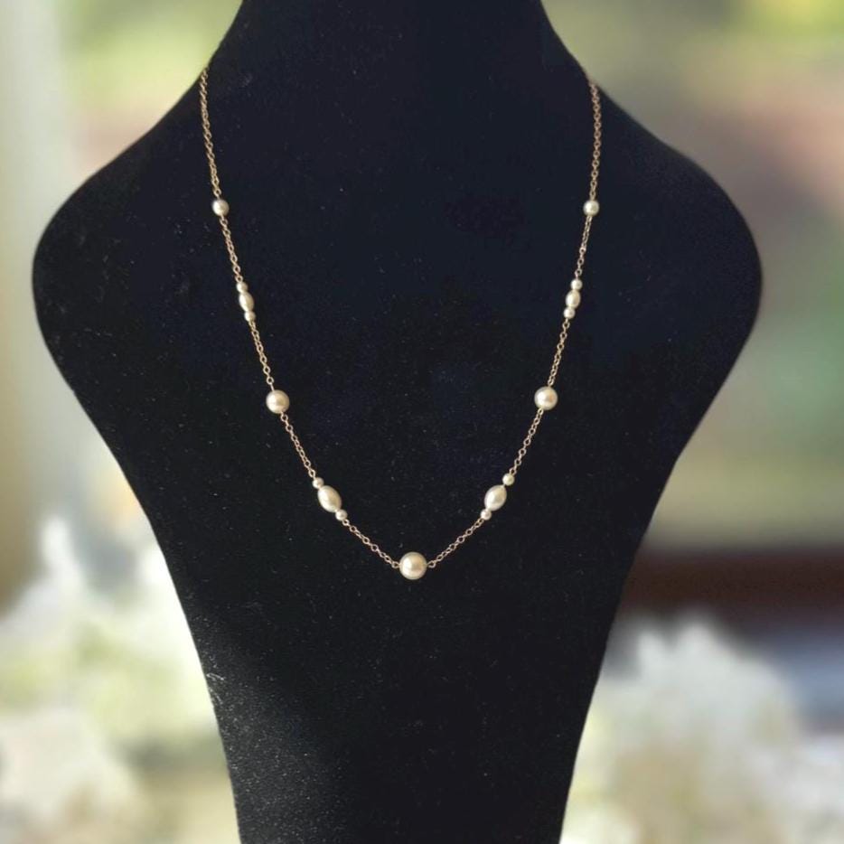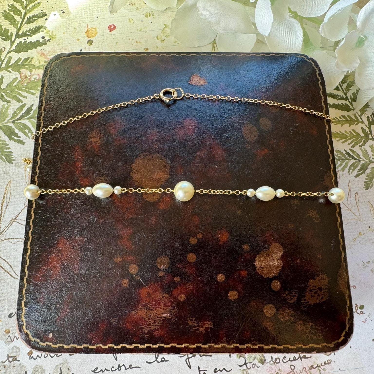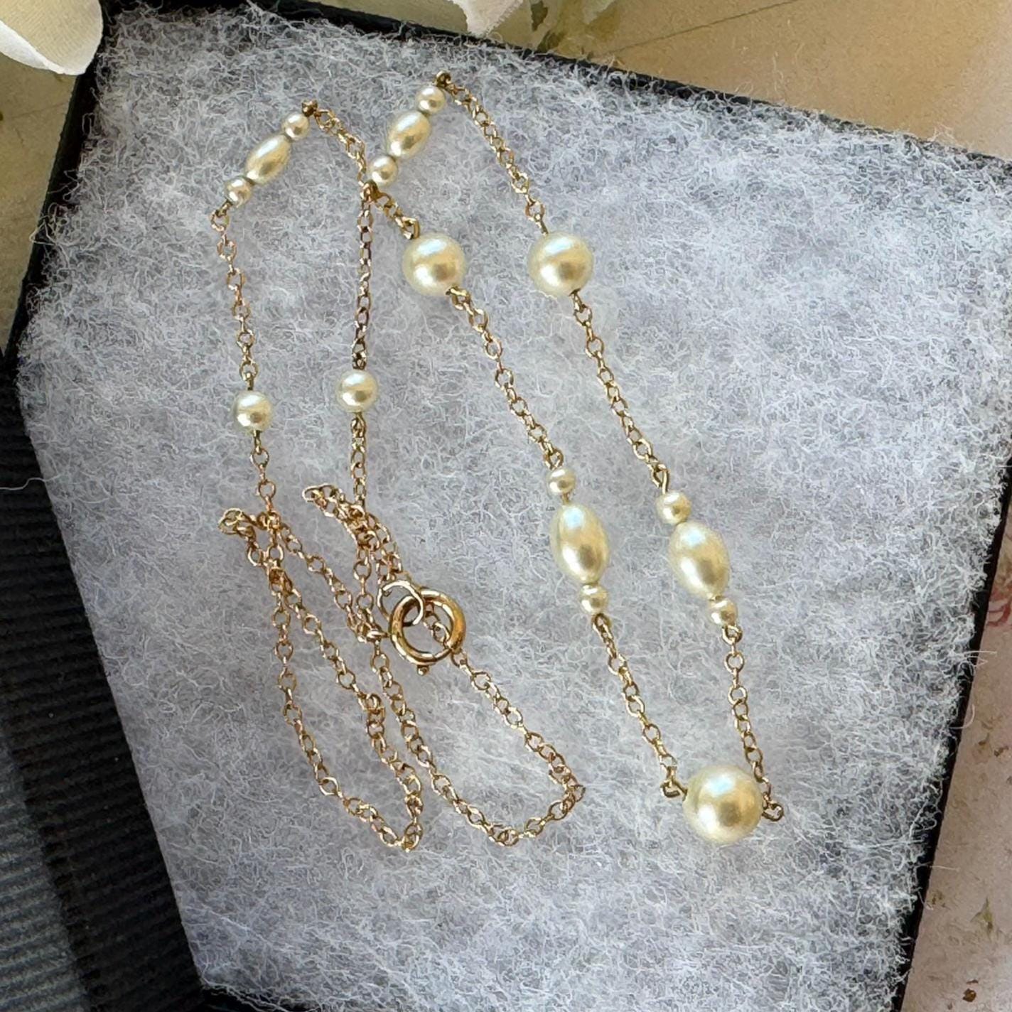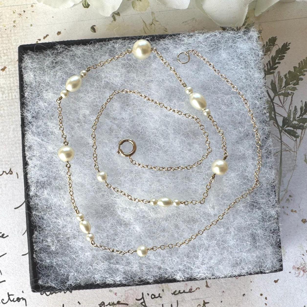 A demure statement of beauty and femininity, this elegant antique 9ct gold pearl station—often called a “tin cup”—necklace dates from the Edwardian era. Lustrous creamy white simulated pearls, both round and oval, are gracefully spaced along a fine 9ct gold chain, creating a soft and romantic rhythm as it drapes.