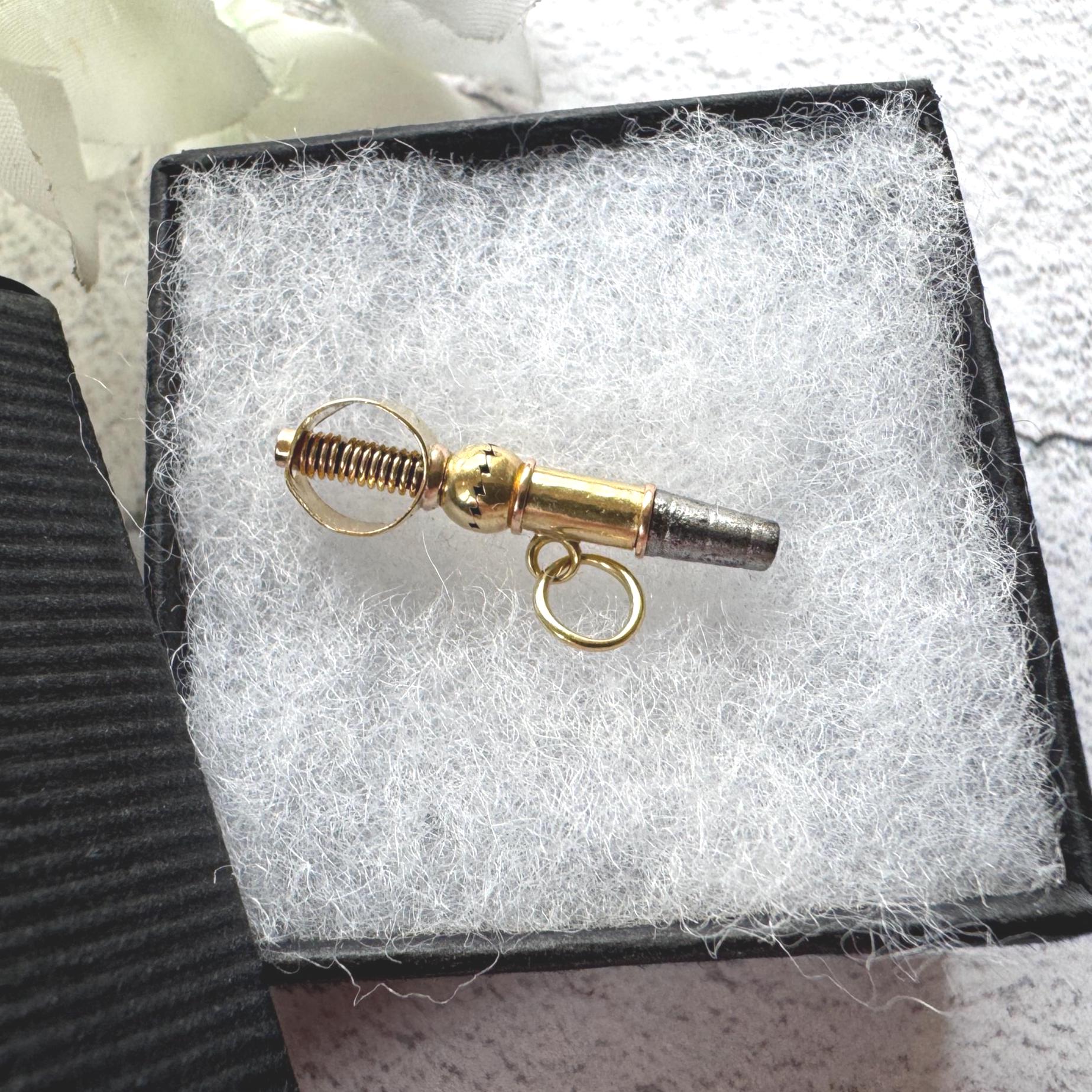 A very unusual antique Georgian 'ratchet' pocket watch key made in buttery 18ct gold at the top with a steel winder at the bottom. This tiny adorable gold key has a tube collar in the centre along with a gold suspension ring that is soldered safely closed.