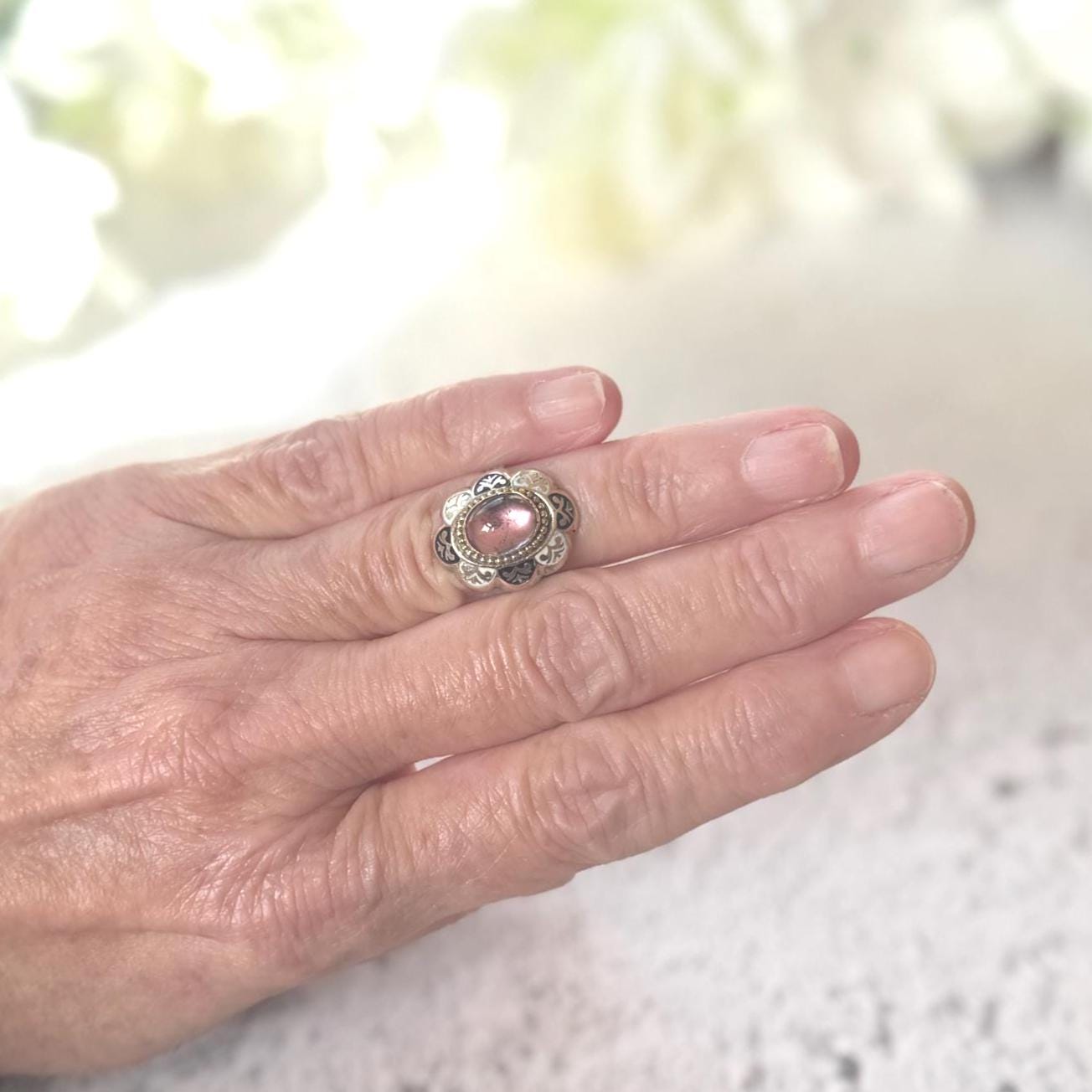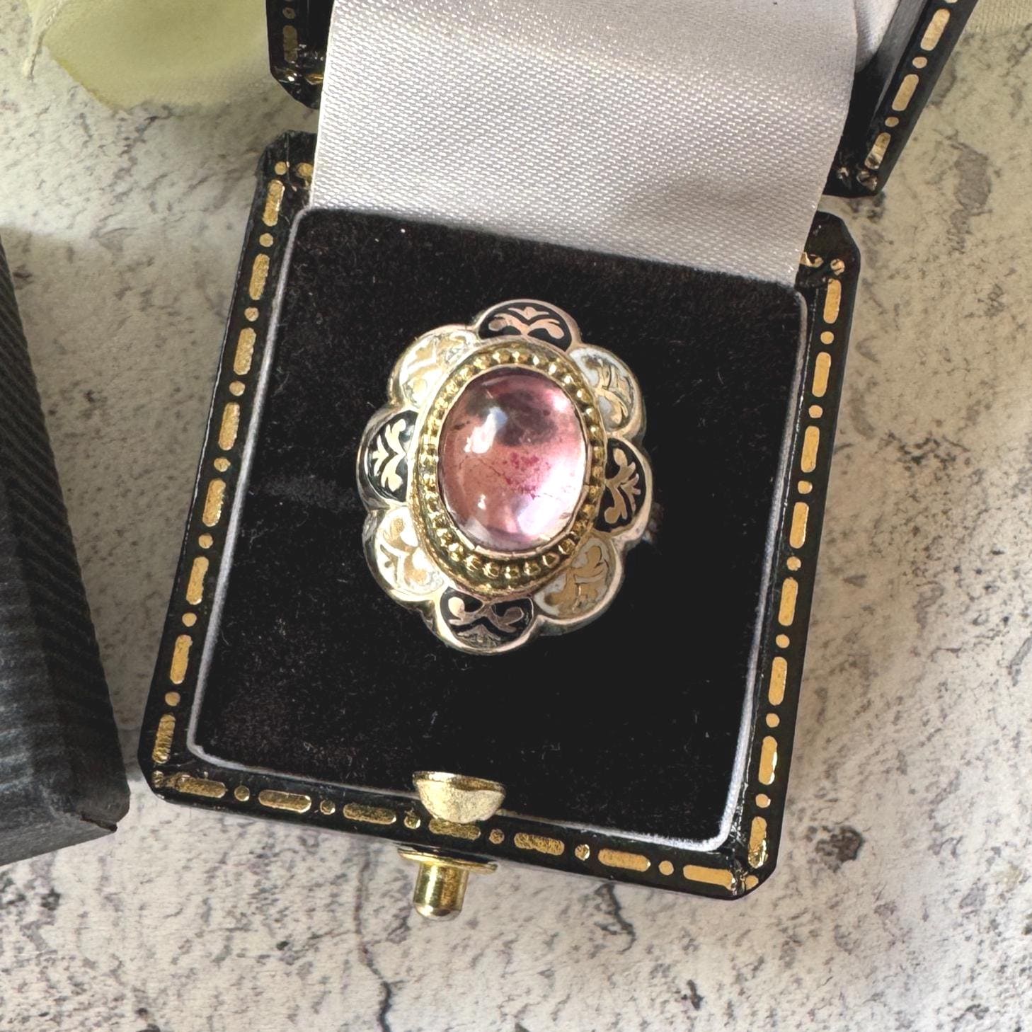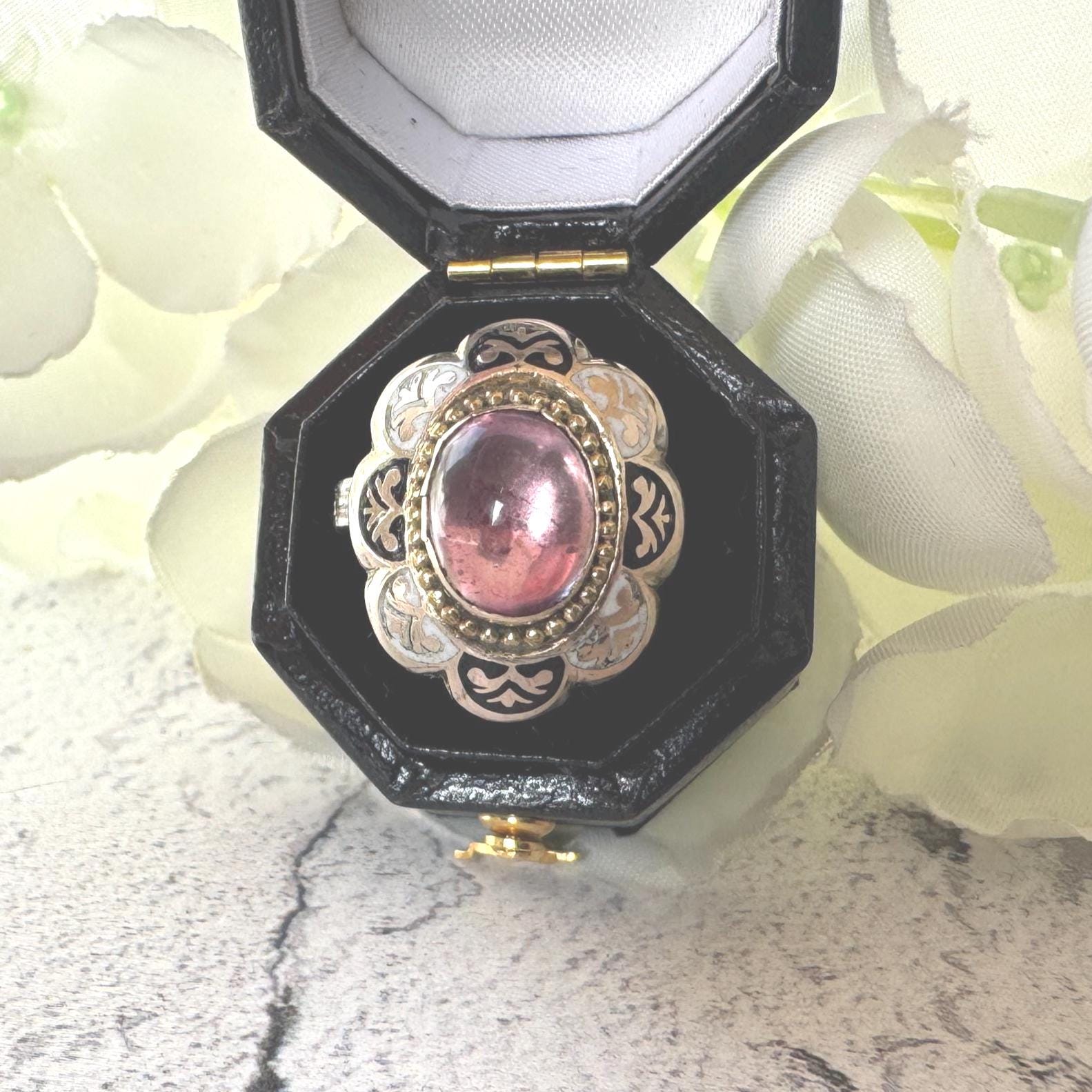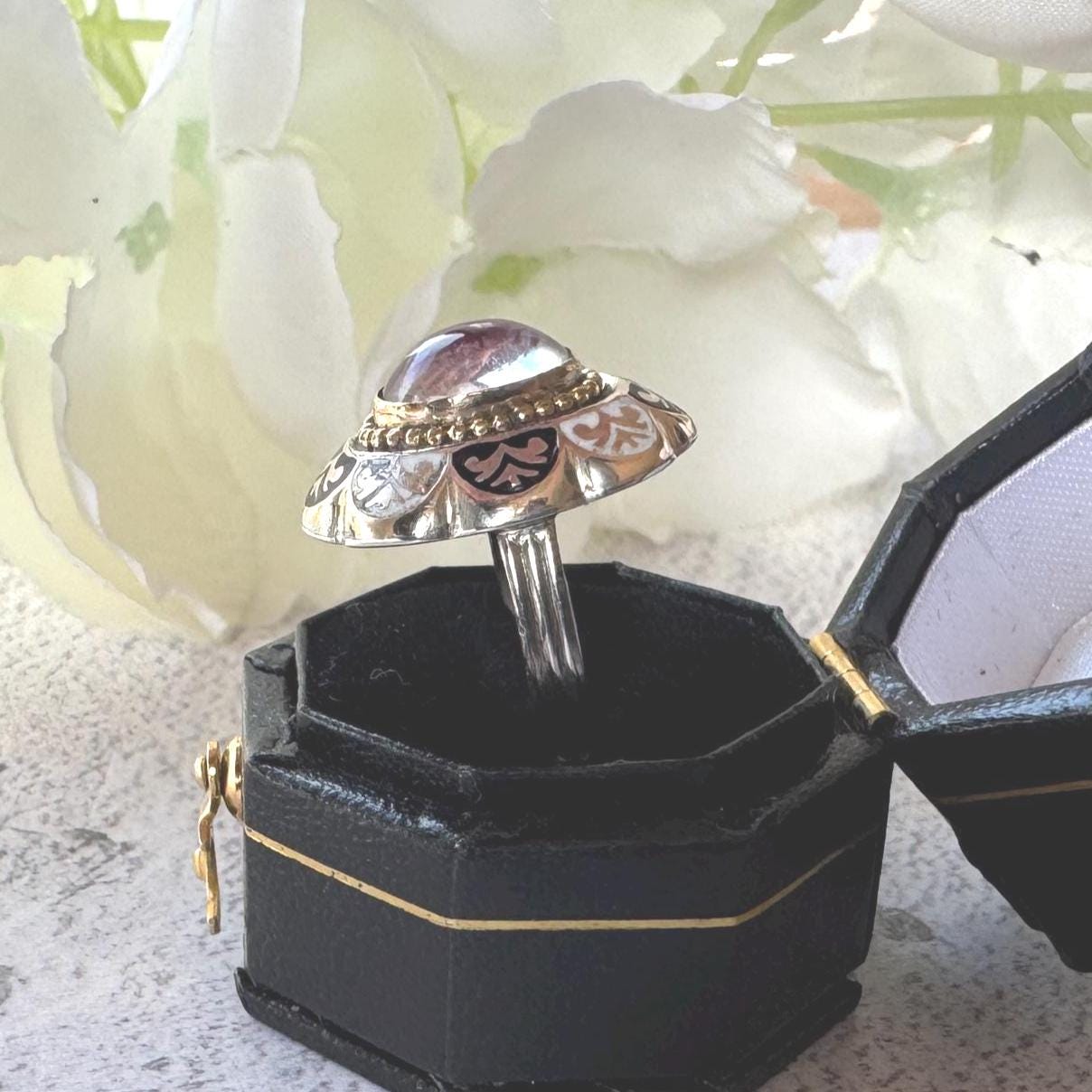 The other worldly crystal is framed in gold milgrain beads and bordered by black & white enamelled Greek motifs. In the reverse the ring has a closed back made from silver and is finished in an line-engraved silver band.