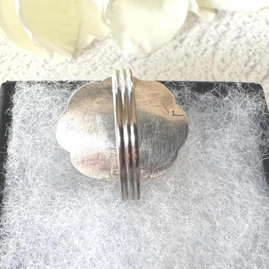 RING SIZE: UK J/US 4-3/4, a very small finger or pinky size (resizing will interrupt the pattern on the band)