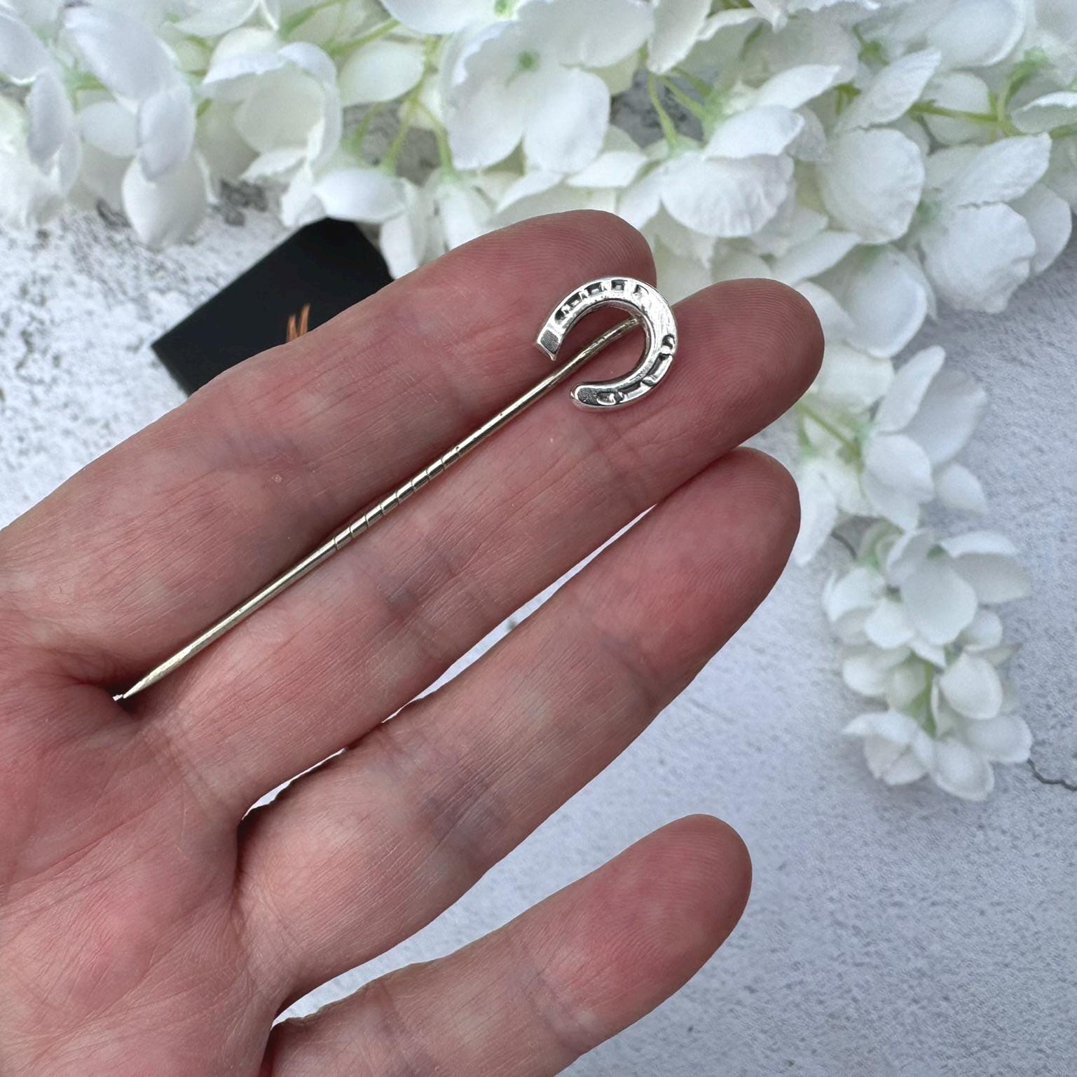 Circa 1890, an antique sterling silver lucky horseshoe stick pin, a classic bit of Victorian kit! Perfect for wear on the tie, cravat or lapel it is excellent antique condition with no noted flaws. The pin measures 2-1/2"/6cm from top to bottom with the little horseshoe measuring 1/2"/1.5cm.