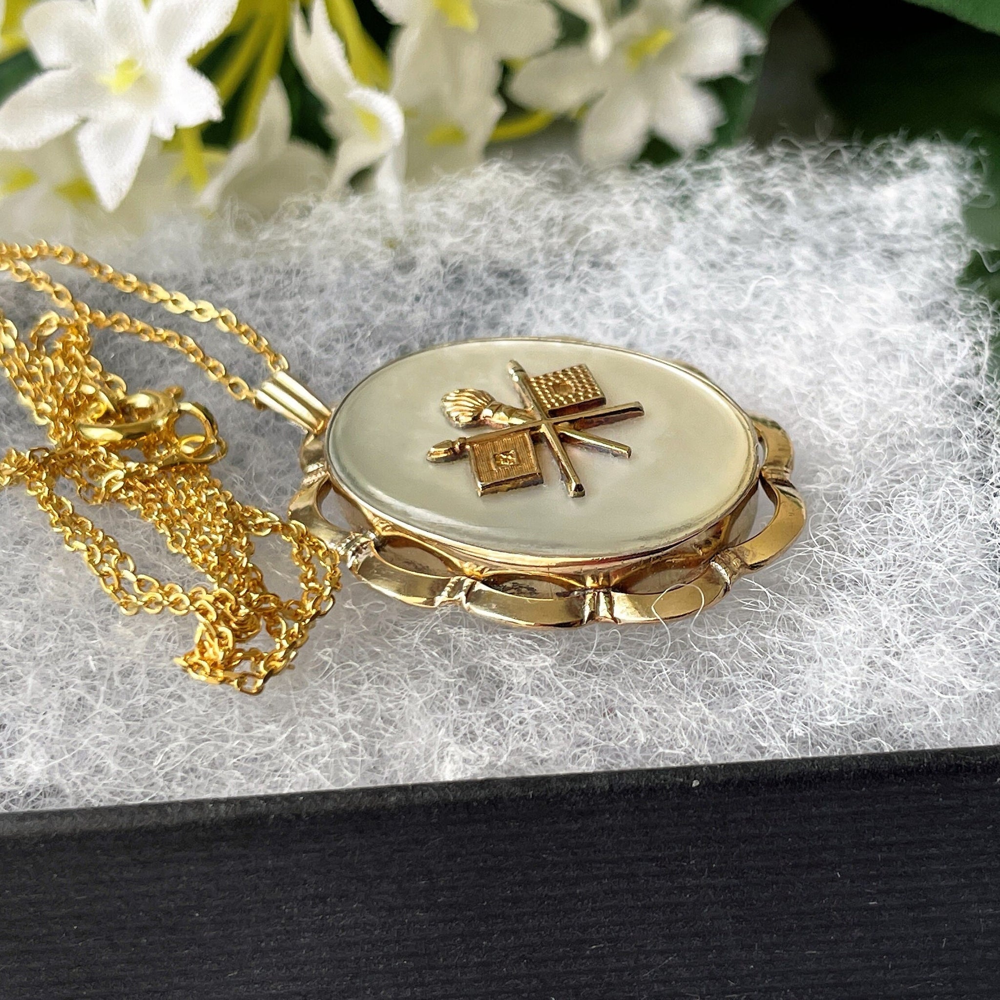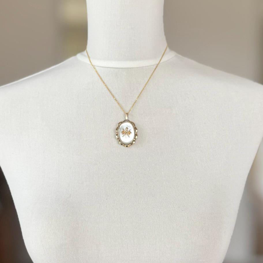 A charming vintage 1940's American sweetheart locket made in 12ct gold filled sterling silver. The front of the locket features a mother-of-pearl oval shaped panel set in a flag & torch insignia (United States Signal Corps.).