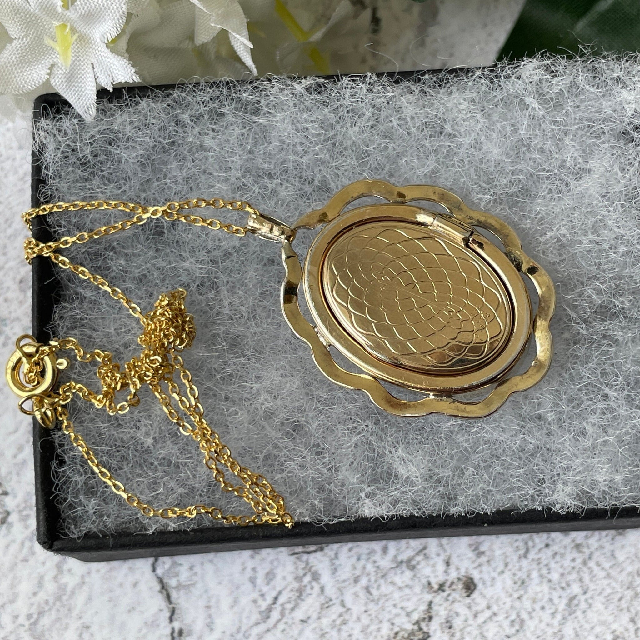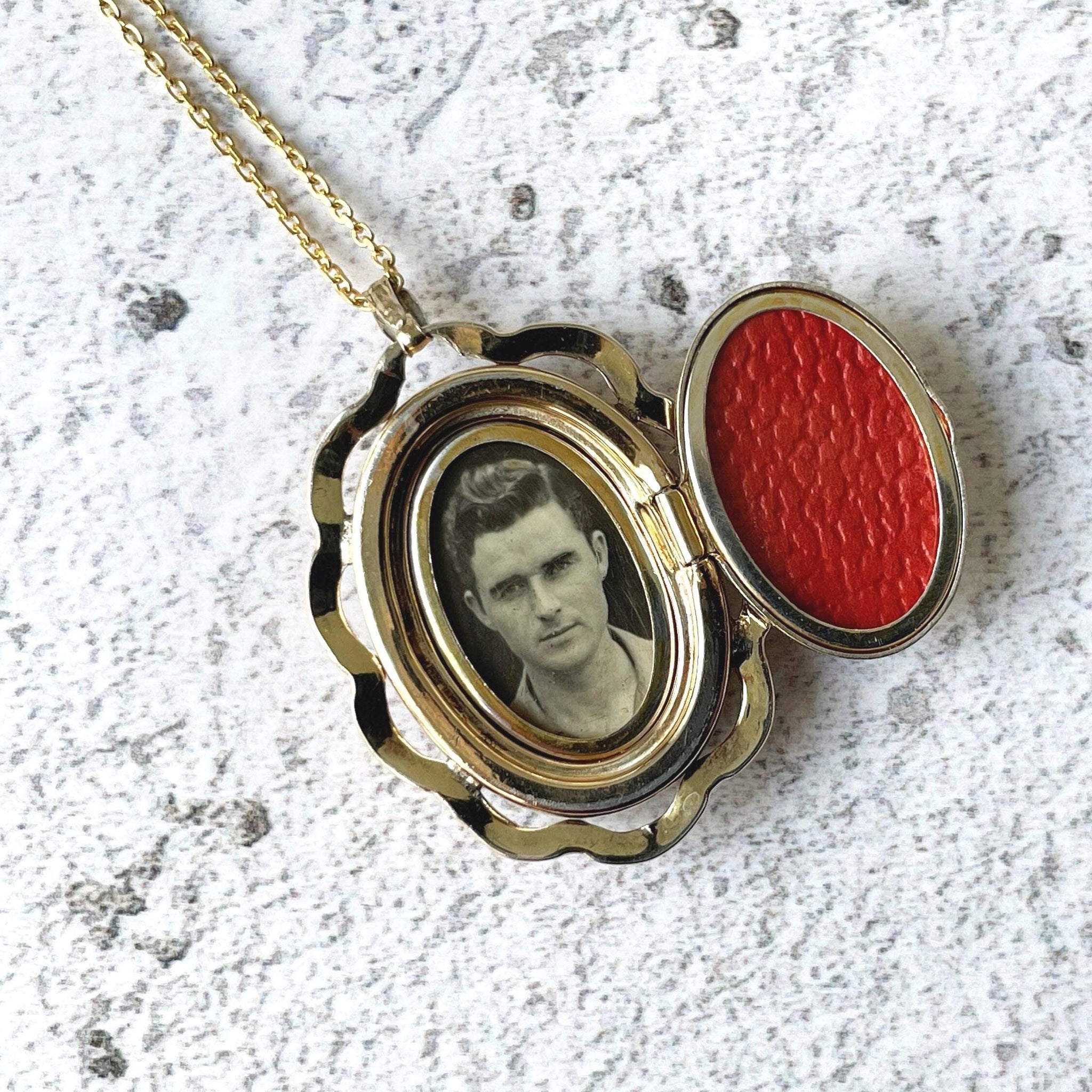 The locket features a pretty open-work scalloped border around the edge and a fan-shaped bale at the top. The reverse is engraved in a decorative machine turned pattern. The back of the locket opens to reveal a photo of a handsome young man on one side and an empty station at the other. These can be replaced with your own photos if desired, both of the original picture rings and hard plastic photo covers are still present.