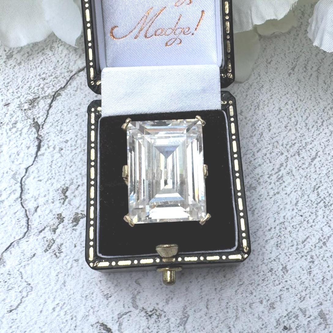 This glamorous vintage 1970's 9ct gold cocktail ring showcases a huge emerald cut rock crystal gemstone of around 24 carats! Full of fire the remarkable icy white natural gemstone boasts an incredible brilliance and a crystal clear clarity.