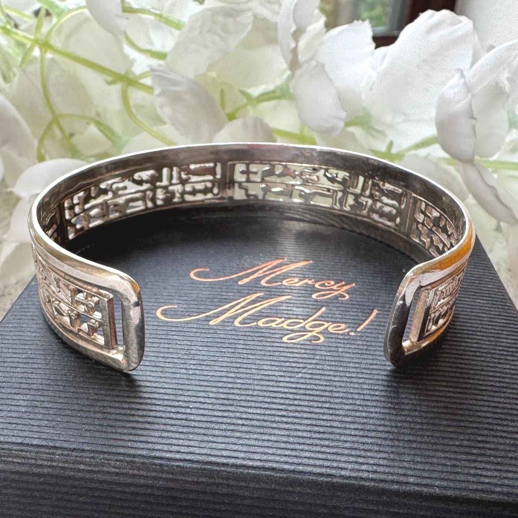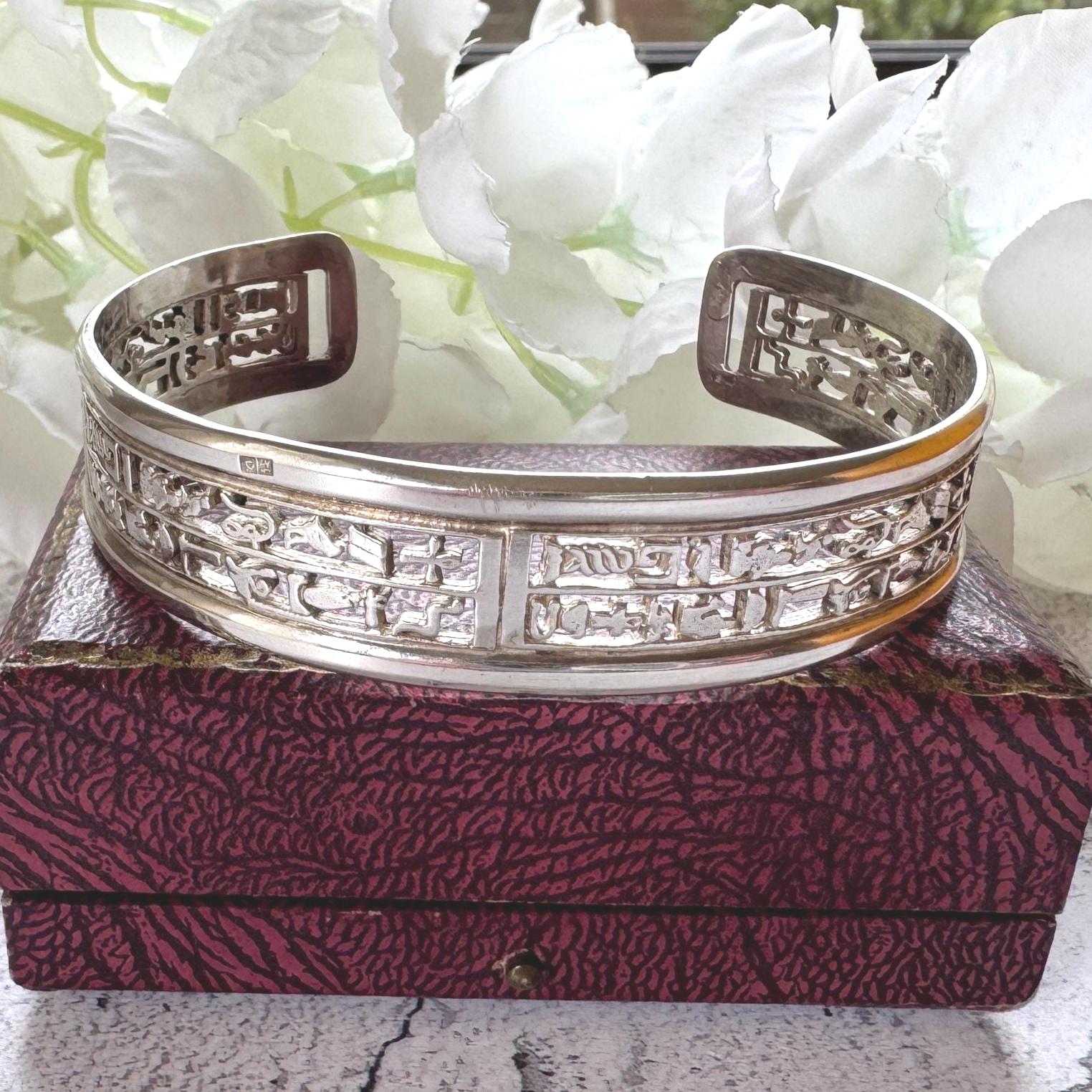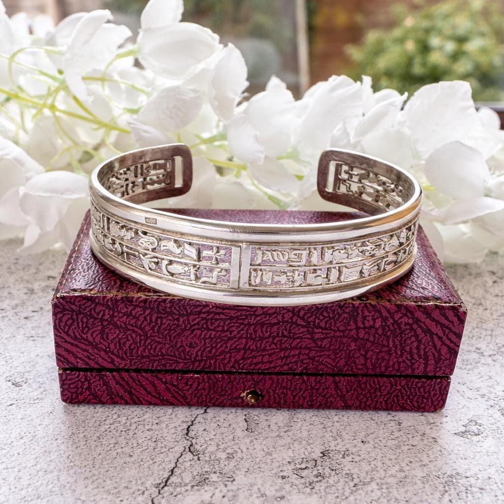 A beautifully crafted vintage Egyptian sterling silver bangle dating to the 1970s, crafted in heavy gauge silver with striking open-work hieroglyphic decoration.