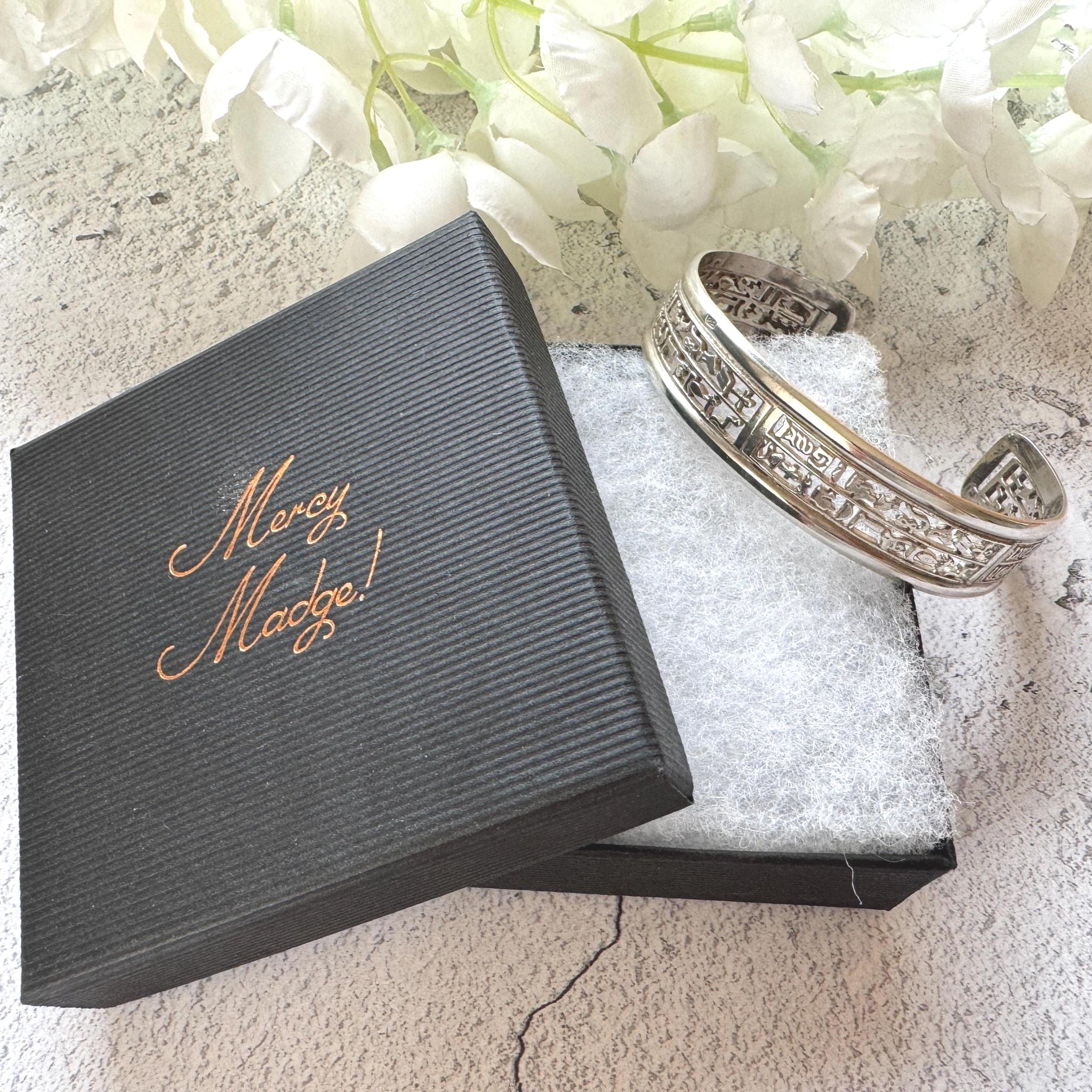 Beautifully made, the bracelet measures 8¼" (21cm) in circumference and retains a gentle flexibility, allowing for careful adjustment to achieve a comfortable fit. At 5/8" (1.5cm) wide and weighing a solid 28.4 grams, it has a reassuring weight.